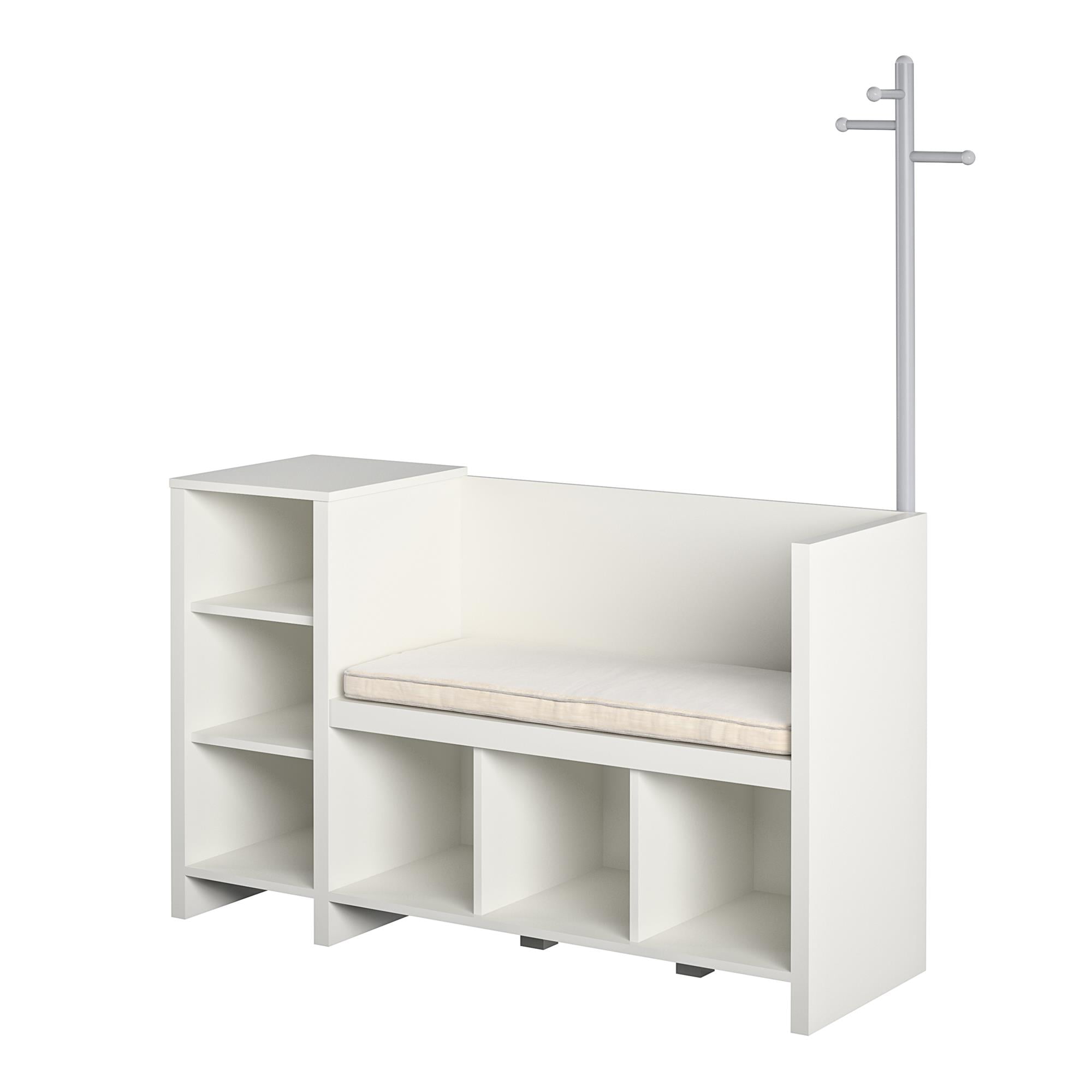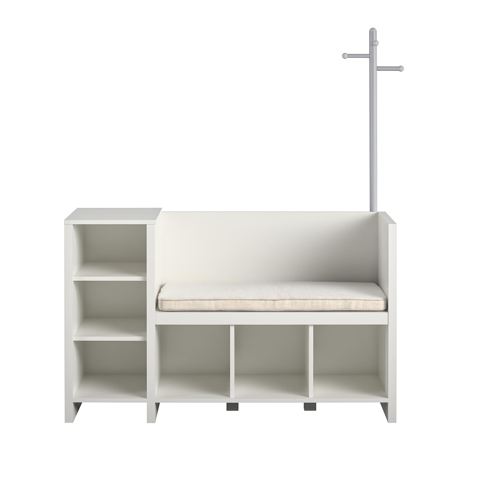 Get all the storage you need for your little one with the Ameriwood Home Tyler Storage Bench and Coat Rack. The crisp white finish on the laminated MDF and particleboard can easily be added to your little girl or boy’s room. With 3 side shelves and 3 lower cubbies, the storage options are endless. Add fabric bins to the lower cubbies to create fun concealed storage (fabric bins not included). The cushioned bench is the perfect spot to put on your little one’s favorite shoes. Hang coats, hats, and sweatshirts on the metal coat rack to keep your child’s clothes off of the floor. The Storage Bench meets the CPSIA Juvenile testing requirements to ensure your child’s safety. The Storage Bench ships flat to your door and requires assembly upon opening. Two adults are recommended to assemble. Once assembled, the Storage Bench measures to be 65.3″H x 47.8″W x 16.65″D.