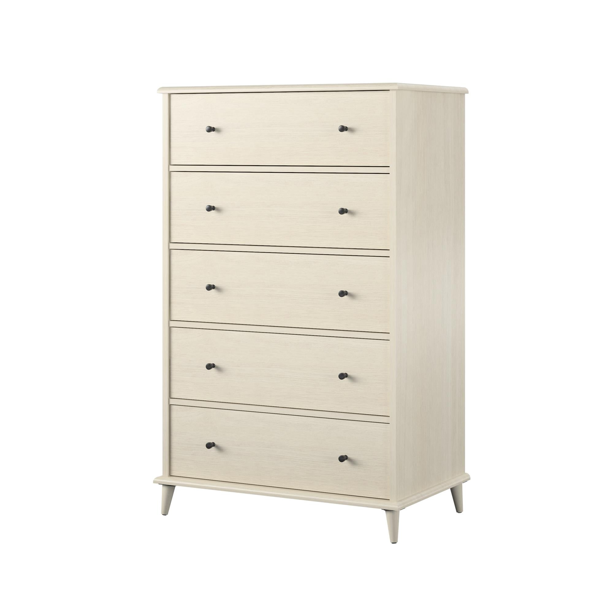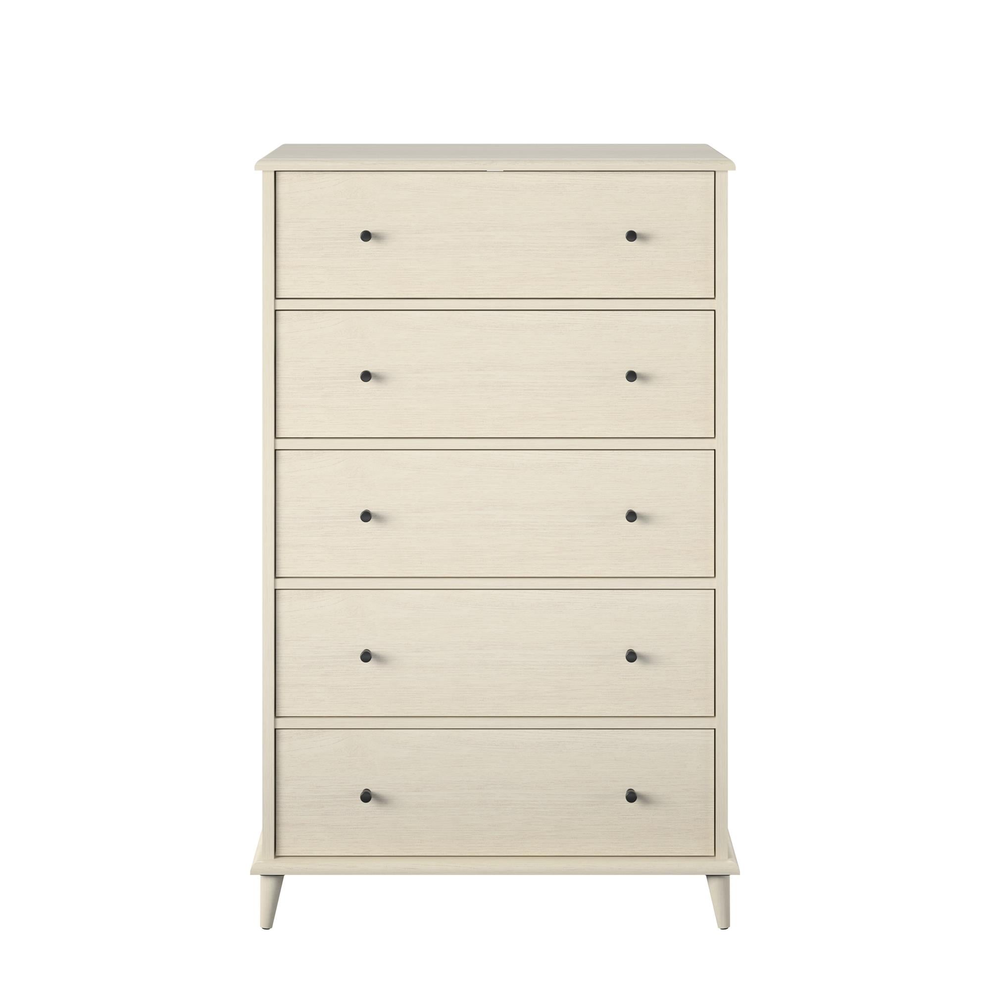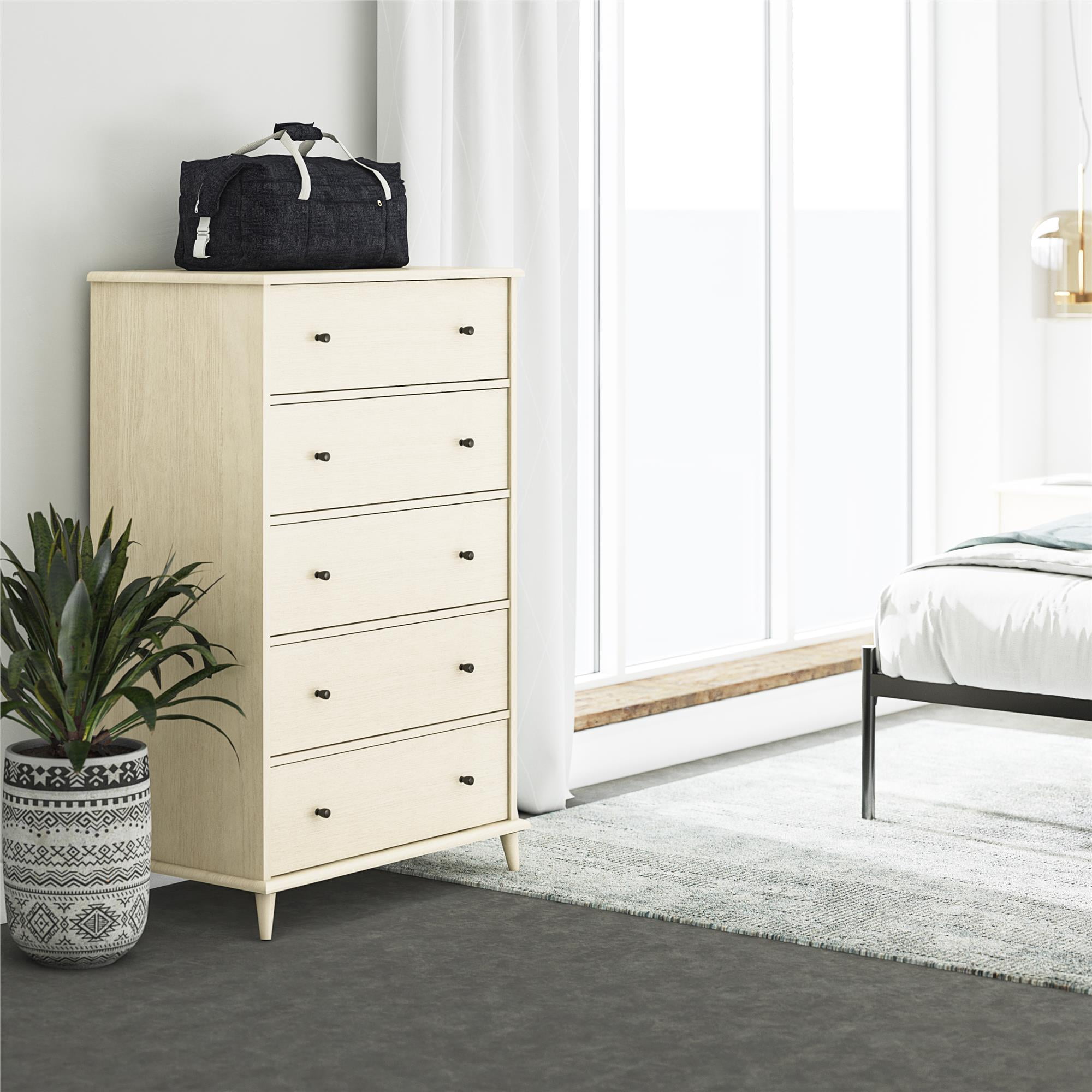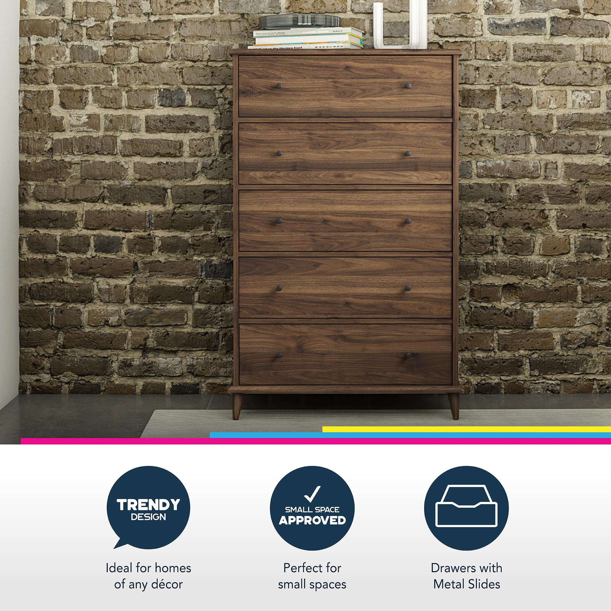 MID-CENTURY MODERN DRESSER: Clear up closet clutter with the Ameriwood Home Farnsworth 5-Drawer Dresser, featuring a mid-century modern design to enhance your bedroom decor DURABLE MATERIALS: Crafted from laminated MDF and engineered wood, this dresser ensures durability and longevity in your bedroom setup ORGANIZED STORAGE: Five drawers with durable metal slides ensure smooth operation, while linen look paper lining prevents snagging on raw edges, keeping clothes in pristine condition SAFETY AND WARRANTY: Includes a wall anchor kit for securing the dresser to the wall and preventing tipping injuries. Also comes with a 1-year limited warranty for added peace of mind
