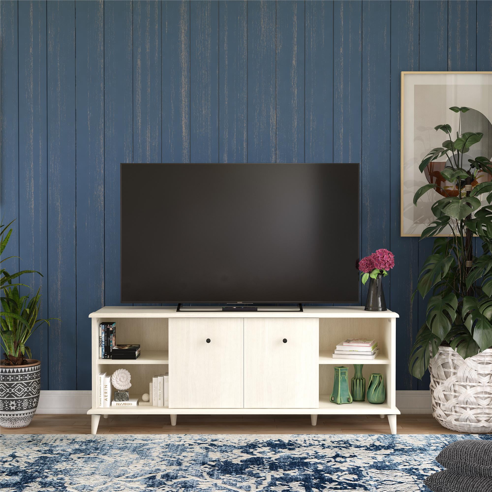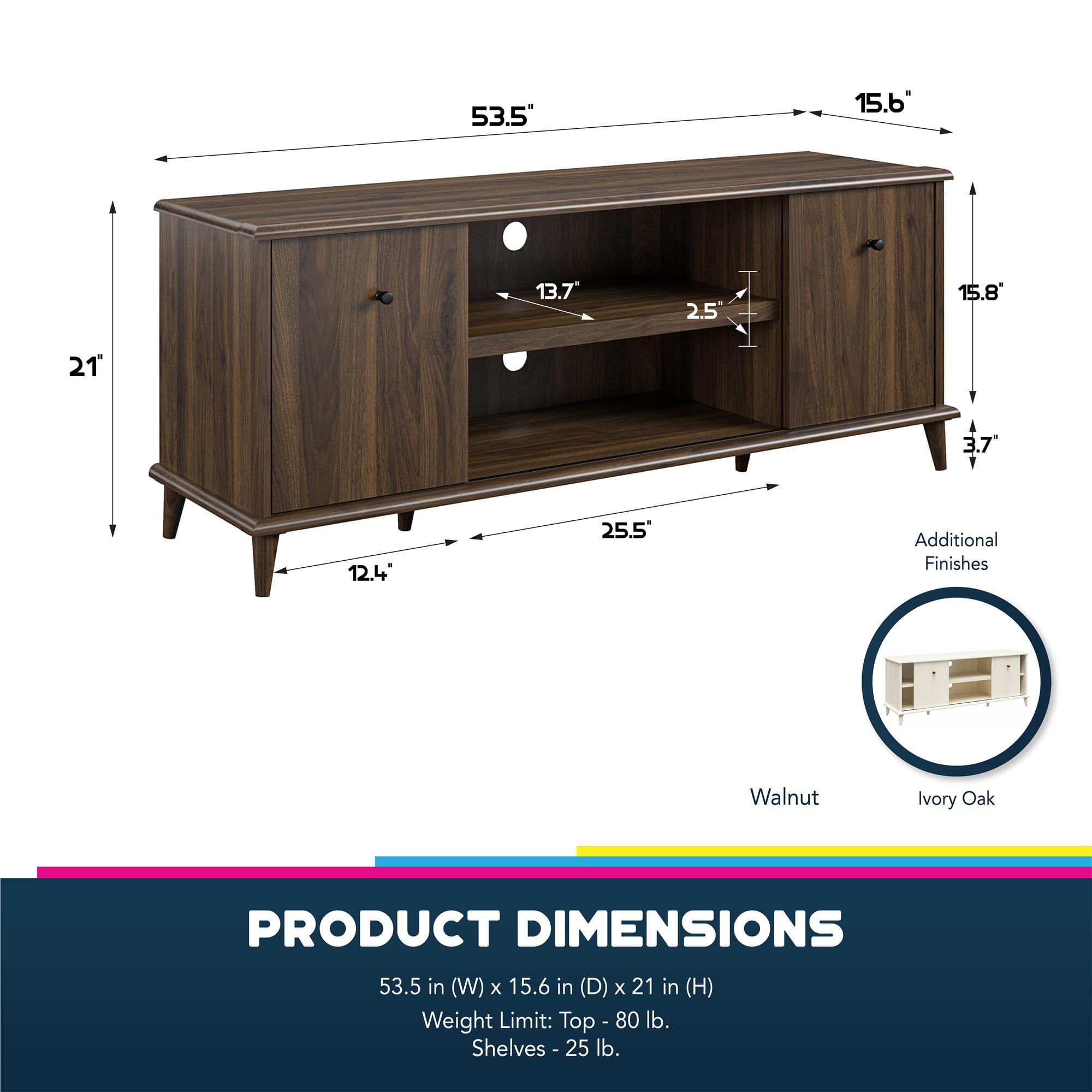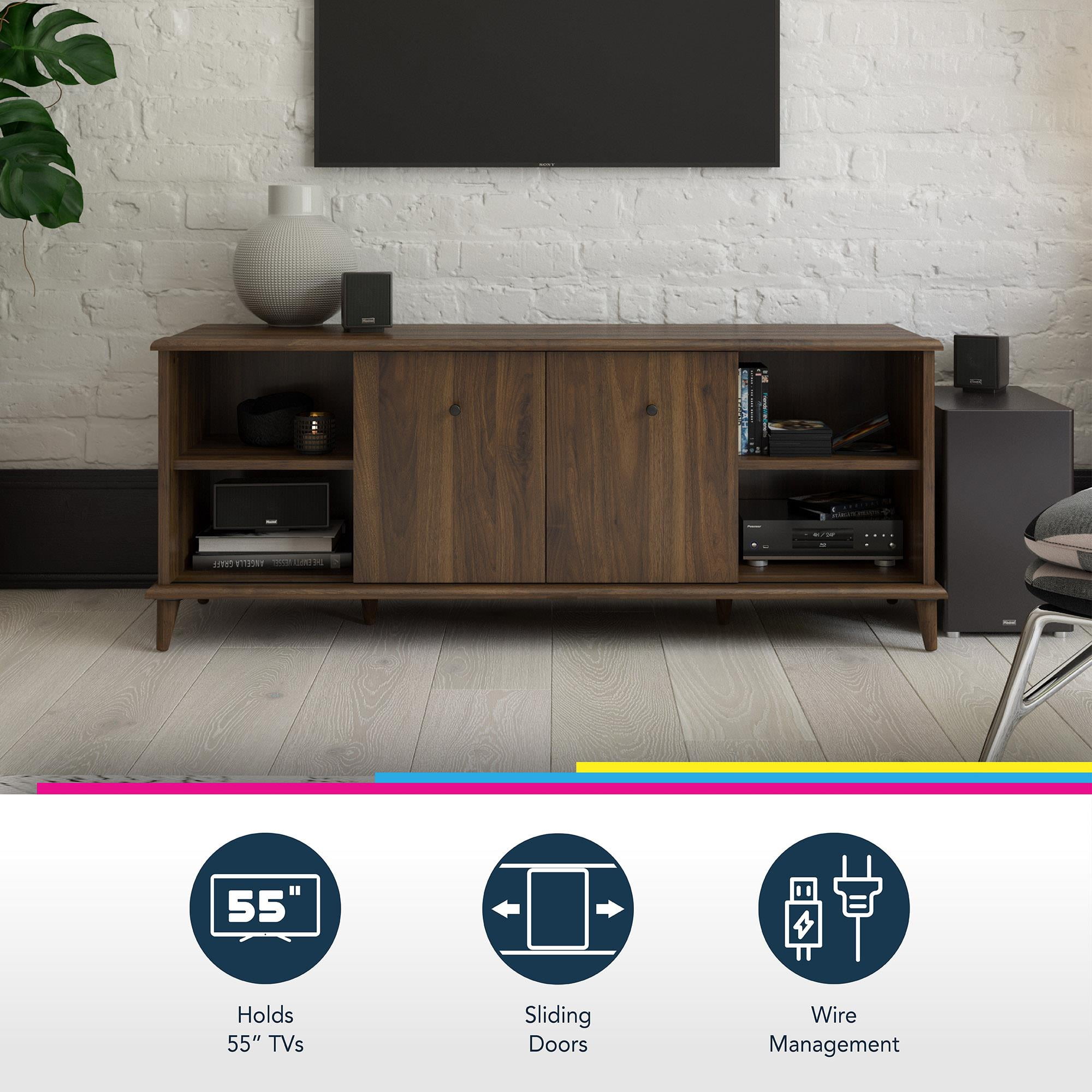 MODERN TV STAND: Update your living room with the fabulous Farnsworth TV Stand from Ameriwood Home, featuring a mid-century modern design to complement TVs up to 55″ wide or 80 lbs. DURABLE MATERIALS: Crafted from laminated MDF and engineered wood, this TV stand ensures durability and longevity in your living room setup ADJUSTABLE STORAGE: Customize organization with adjustable center shelves for your media devices. Wire management holes keep cords tidy and hassle-free VERSATILE CONCEALMENT: Sliding doors can conceal side cabinets or center shelves to suit your needs ASSEMBLY AND CAPACITY: Ships flat to your door; assembly by two adults recommended. Supports up to 80 lbs. The open shelves and side cabinets can each hold up to 25 lbs. Assembled dimensions: 21″H x 53.5″W x 15.59″D 1-YEAR LIMITED WARRANTY INCLUDED: Call centers, staffed by live agents in both the U.S. and Canada, are at your service for any needs related to replacement parts, assembly assistance, or inquiries about warranties