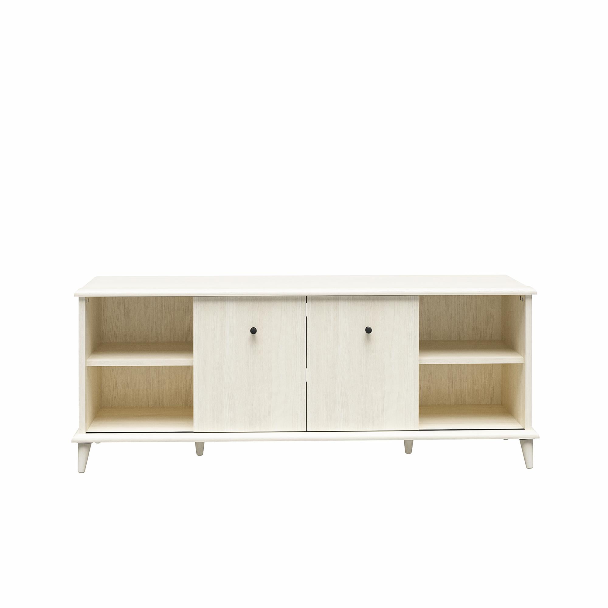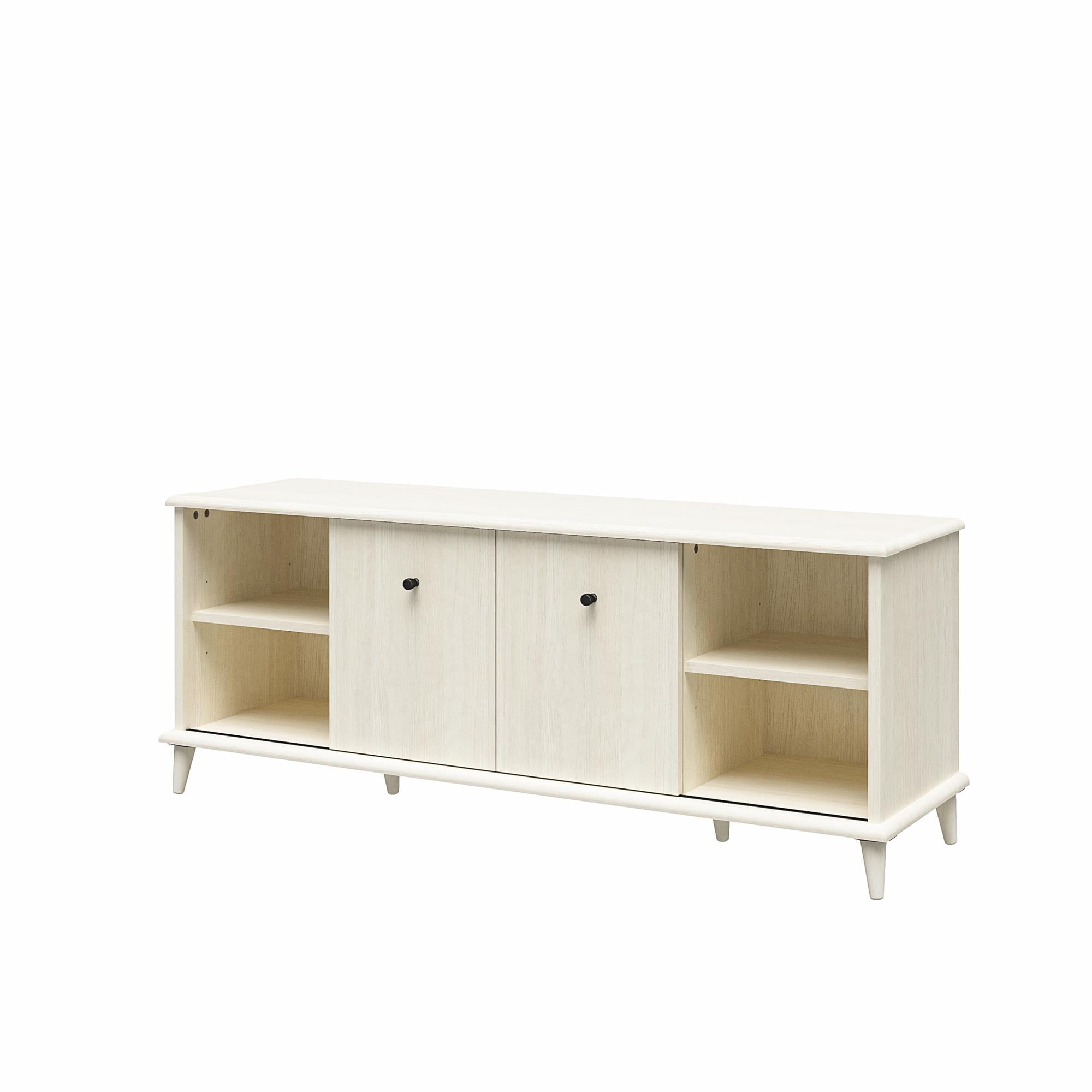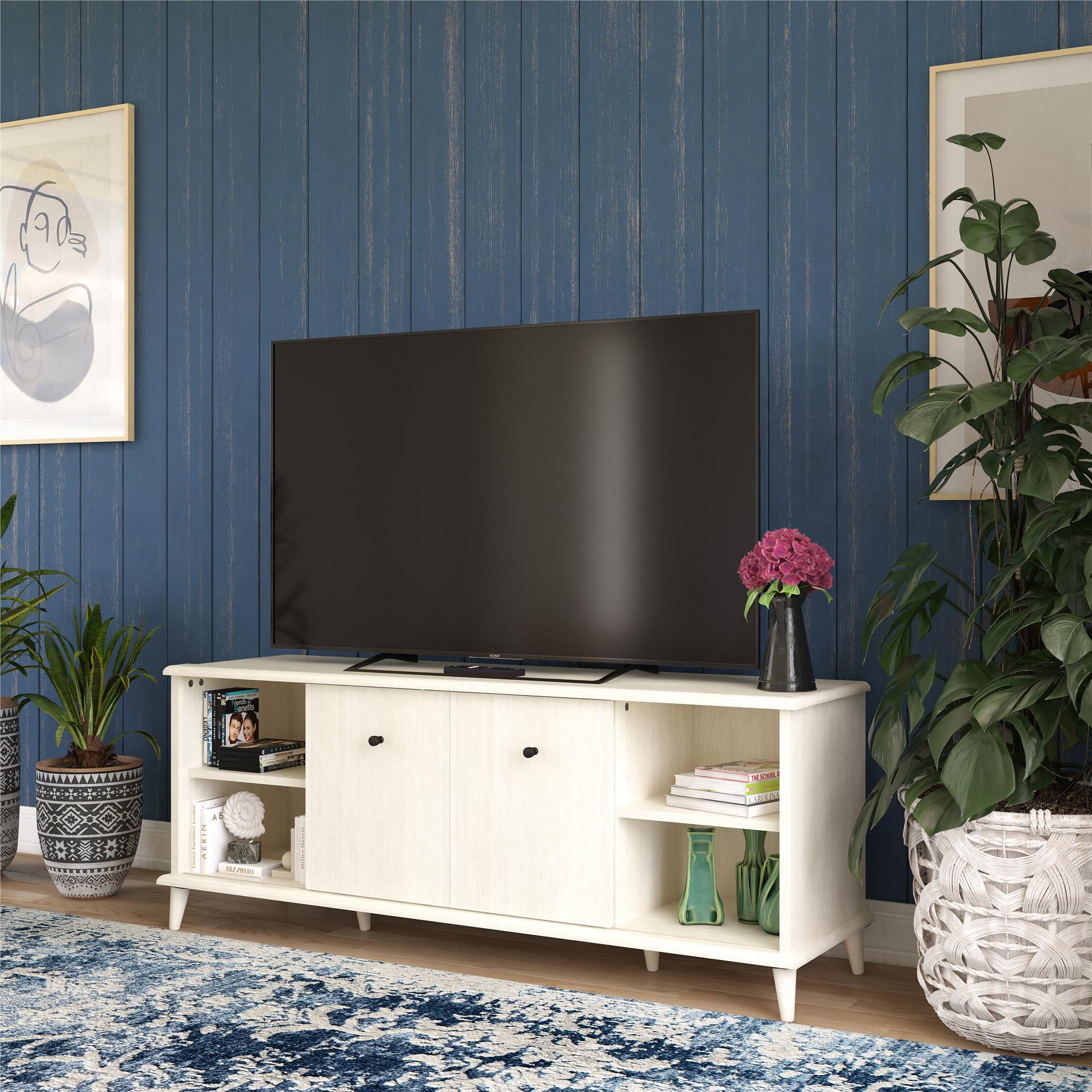 MODERN TV STAND: Update your living room with the fabulous Farnsworth TV Stand from Ameriwood Home, featuring a mid-century modern design to complement TVs up to 55″ wide or 80 lbs. DURABLE MATERIALS: Crafted from laminated MDF and engineered wood, this TV stand ensures durability and longevity in your living room setup ADJUSTABLE STORAGE: Customize organization with adjustable center shelves for your media devices. Wire management holes keep cords tidy and hassle-free VERSATILE CONCEALMENT: Sliding doors can conceal side cabinets or center shelves to suit your needs ASSEMBLY AND CAPACITY: Ships flat to your door; assembly by two adults recommended. Supports up to 80 lbs. The open shelves and side cabinets can each hold up to 25 lbs. Assembled dimensions: 21″H x 53.5″W x 15.59″D 1-YEAR LIMITED WARRANTY INCLUDED: Call centers, staffed by live agents in both the U.S. and Canada, are at your service for any needs related to replacement parts, assembly assistance, or inquiries about warranties