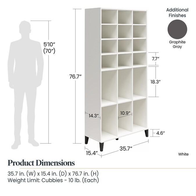 You’ve made your home the oasis you’ve always dreamt of, a home gym for you, a mini sports complex in the yard for the kids, everything is right where you need it. But you’re still missing one thing – Flexible Storage. The Flex Shoe Storage Cabinet has you covered. Constructed from engineered wood with a neutral finish to match any décor, this Shoe Storage Cabinet features ample and diverse storage solutions to take home organization to the next level. The Shoe Storage Cabinet features 12 medium size cubbies for tennis shoes, pumps and sandals, as well as 6 tall cubbies, ideal for boots of all sizes. Perfect for the entryway, mudroom, laundry room, garage, closet, or any room where additional storage is needed. The Shoe Storage Cabinet ships flat to your door in one box. Assembly required. Two adults are recommended to assemble. Once assembled, the Storage Cabinet measures to be 35.67″ W x 15.39″ D x 76.65″ H.