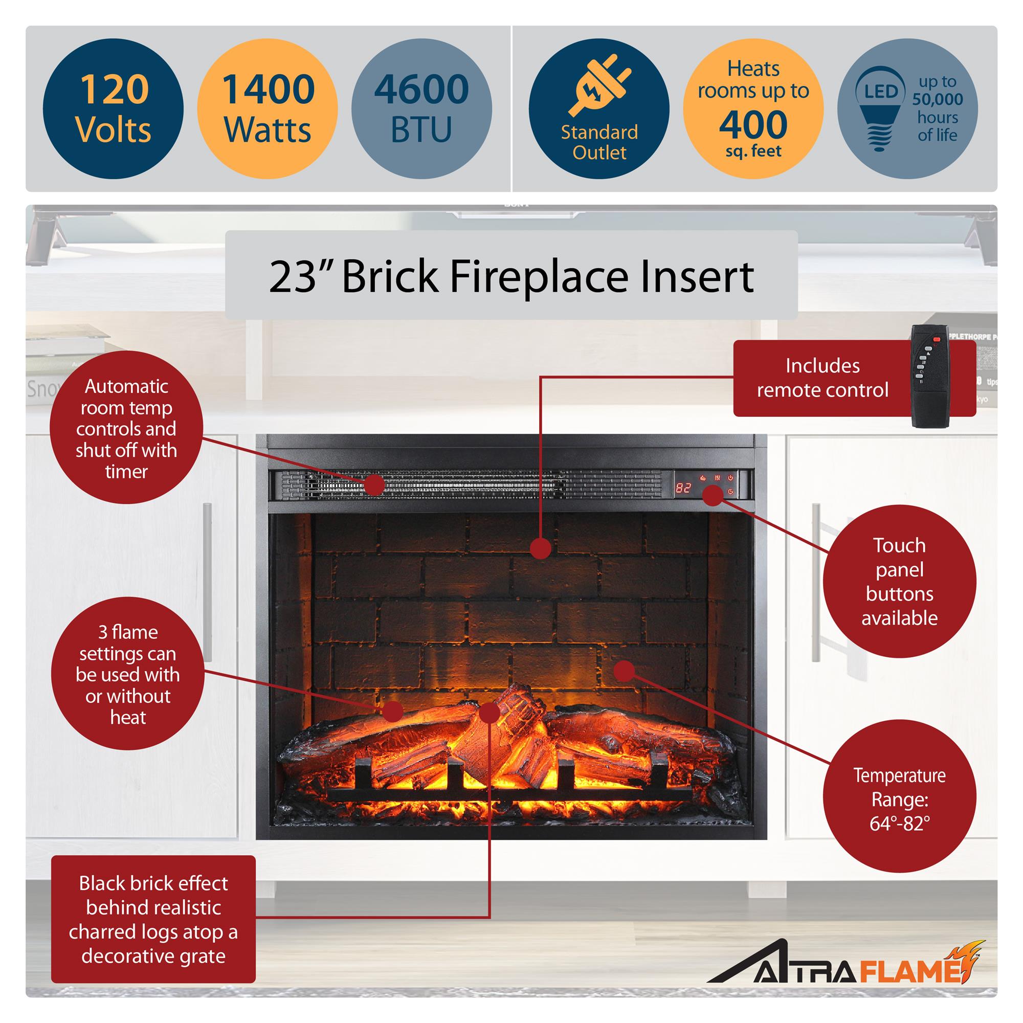 Made of sturdy laminated MDF and engineered wood Engineered for most flat screen TV’s up to 75″ or up to 145 lbs. Features 1 long open shelf for a soundbar with 3 individual sections for components, 4 open shelves on either side, 2 fixed, 2 adjustable, and 2 storage cabinets Wire management to keep cords tangle-free The 23″ fireplace insert features a realistic flame effect that can be used with or without heat Insert heats a room up to 400 sq. ft. and plugs into a standard 120V outlet Use the remote control or touch panel to control the different flame settings and heat settings to keep your room at the right temperature The TV Console with Electric Fireplace ships flat to your door and requires assembly. Two adults are recommended to assemble and move. Once assembled, the unit measures to be 29.4″ H x 68″ W x 19.9″ D 1-Year Limited Warranty Included