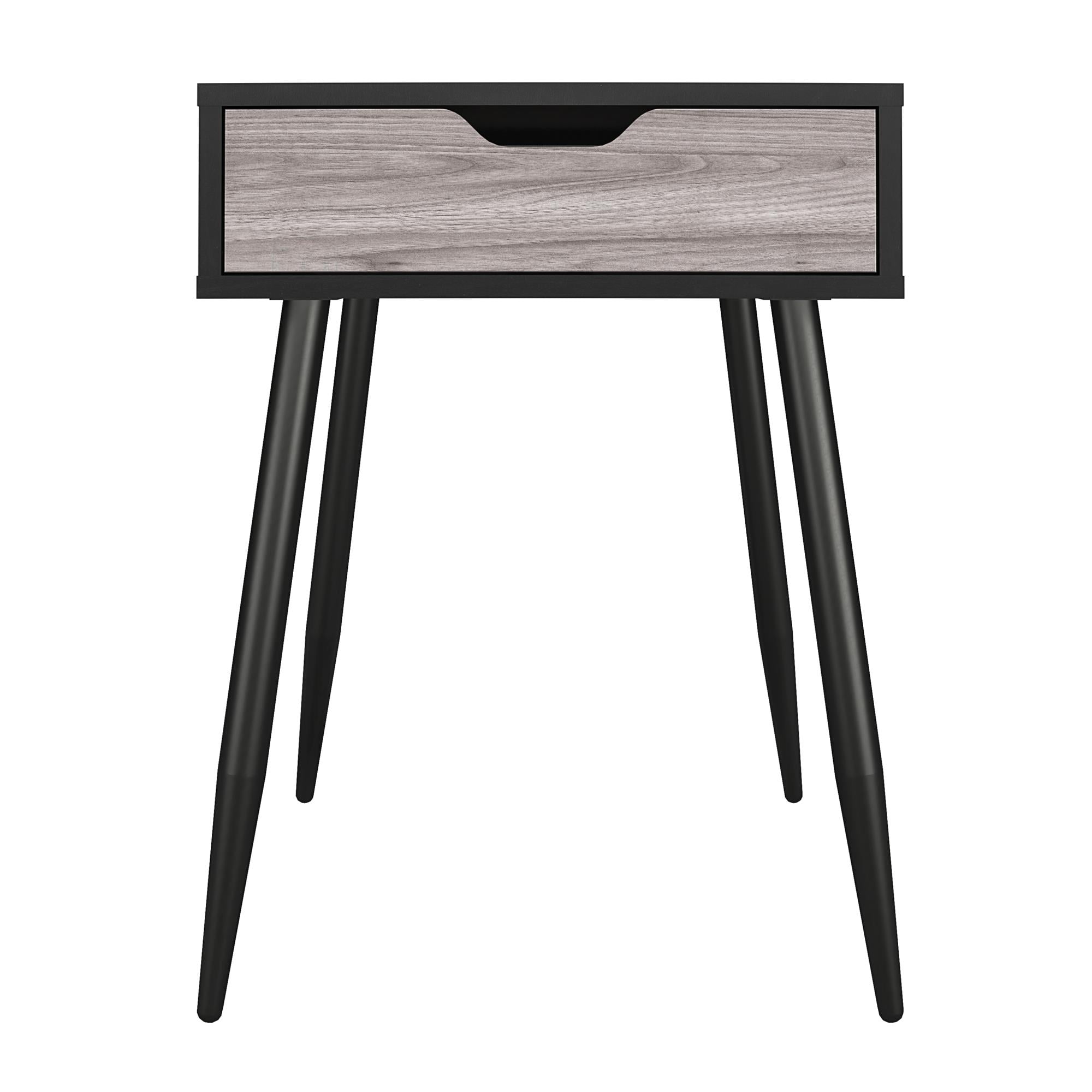 Update your living room vibes with the Ameriwood Home Grafton End Table. This end table is designed with a mix of mid-century modern and fashion-forward details. The two-tones create a high-contrast style that is sure to be fun to decorate with. This end table is the perfect size to keep your coasters, remotes and a reading lamp nearby. With the convenient drawer, you can keep your tabletop clutter-free. The woodgrain finish on the laminated MDF and particleboard will look gorgeous with the light woodgrain look of the drawer front. The end table ships flat to your door and two adults are recommended to assemble. The tabletop can hold up to 50 lbs. while the drawer can hold 10 lbs. Assembled dimensions: 24.01″ H x 17.99″ W x 22.99″ D.