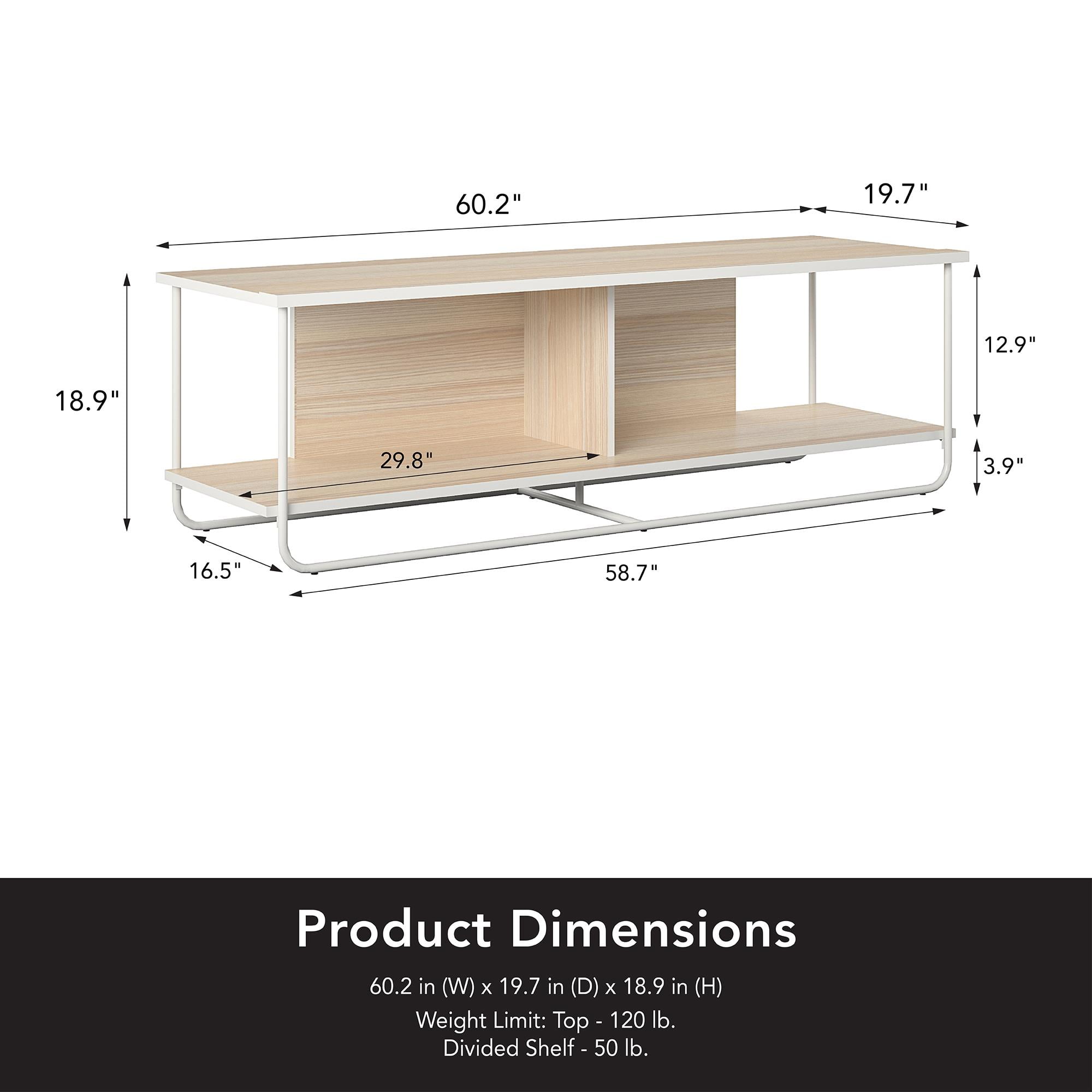 LIGHT AND AIRY TV STAND: The Ameriwood Home Kently TV Stand, designed for TVs up to 70″, infuses a light and airy ambiance into your living space DURABLE TWO-TONED DESIGN: Constructed from durable engineered wood on a powder-coated metal frame, showcasing a minimalistic two-toned design VERSATILE TV COMPATIBILITY: Accommodating most flat panel TVs up to 70″ and weighing up to 120 lbs. ASSEMBLY AND DIMENSIONS: This TV stand ships flat and requires assembly by two adults. Once assembled, its dimensions are 18.85″ H x 60.2″ W x 19.68″ D 1-YEAR LIMITED WARRANTY INCLUDED: Call centers, staffed by live agents in both the U.S. and Canada, are at your service for any needs related to replacement parts, assembly assistance, or inquiries about warranties The TV Stand ships flat to your door and 2 adults are recommended to assemble. Assembled dimensions: 18.85″ H x 60.2″ W x 19.68″ D. f 1-year limited warranty included