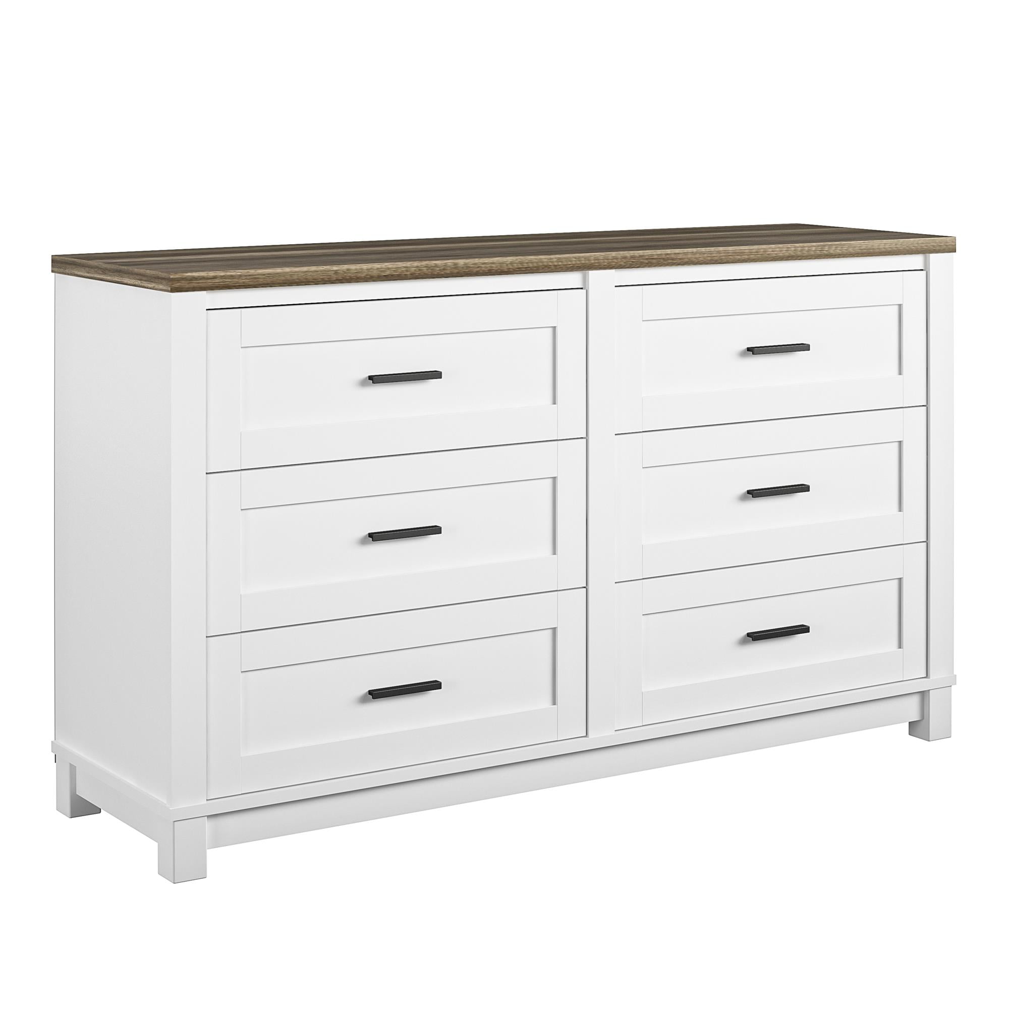 ORGANIZED SPACES: Keep your clothes neat and organized in the spacious Ameriwood Home Langley Bay 6-Drawer Dresser STRIKING TWO-TONE DESIGN: Made almost entirely of painted MDF with a laminated engineered wood top, the white finish pairs with the woodgrain top for a stunning two-tone look AMPLE STORAGE CAPACITY: The Dresser has six wide and deep drawers to hold all forms of clothing, from small undergarments to heavy sweaters and pants ENHANCED SAFETY: This unit is Sturdy Compliant and offers a range of safety features, including anti-tip mechanisms, counterweights, interlock systems, and drawer stoppers to prevent tipping injuries SHIPPING & DIMENSIONS: The Dresser ships flat to your door and two adults are recommended to assemble. The top surface can support up to 75 lbs. and each drawer will hold 35 lbs. Assembled dimensions: 32″H x 54″W x 15.75″D 1-YEAR LIMITED WARRANTY: Contact our customer support team in the U.S. and Canada for help with replacement parts, assembly assistance, or warranty inquiries via online chat, email, or phone