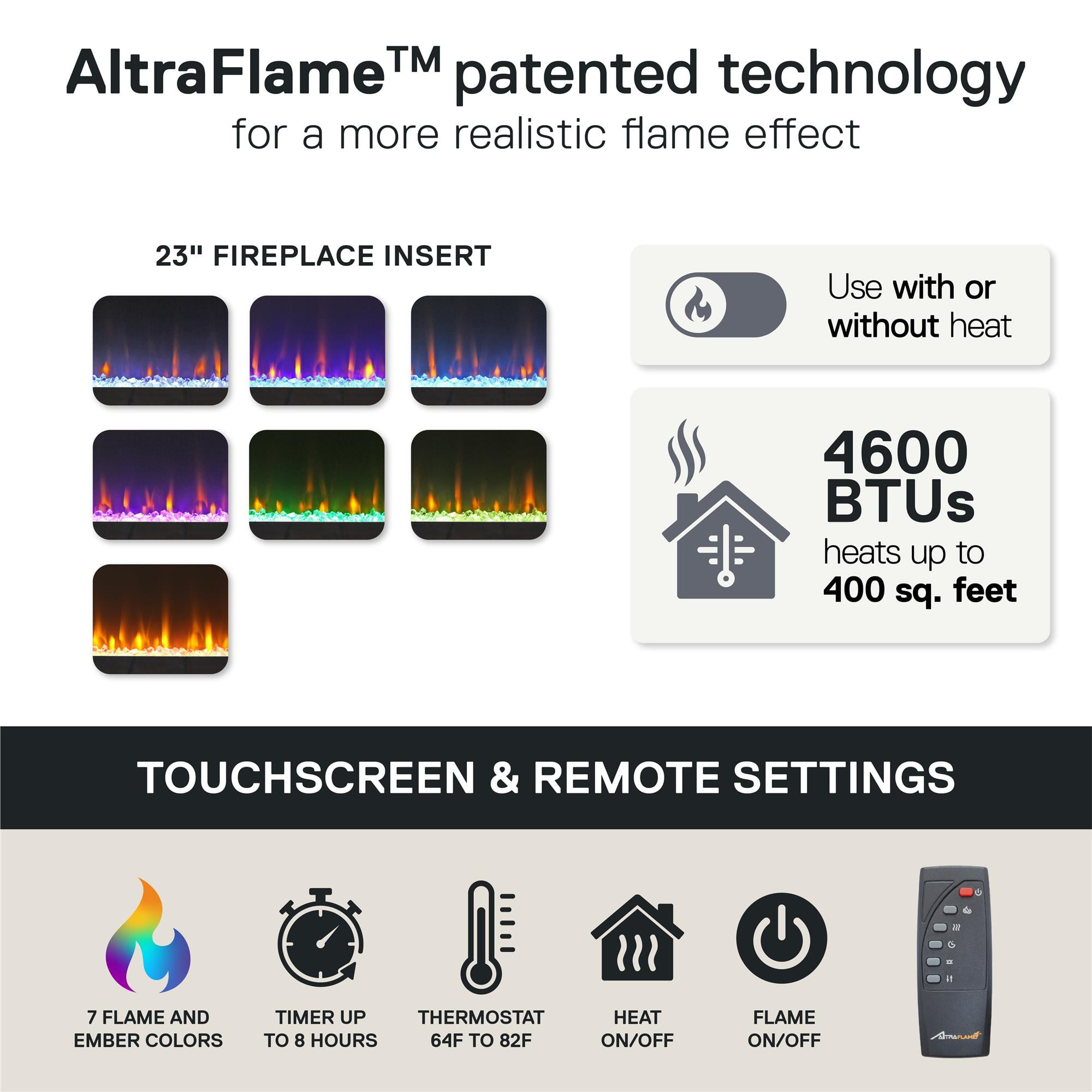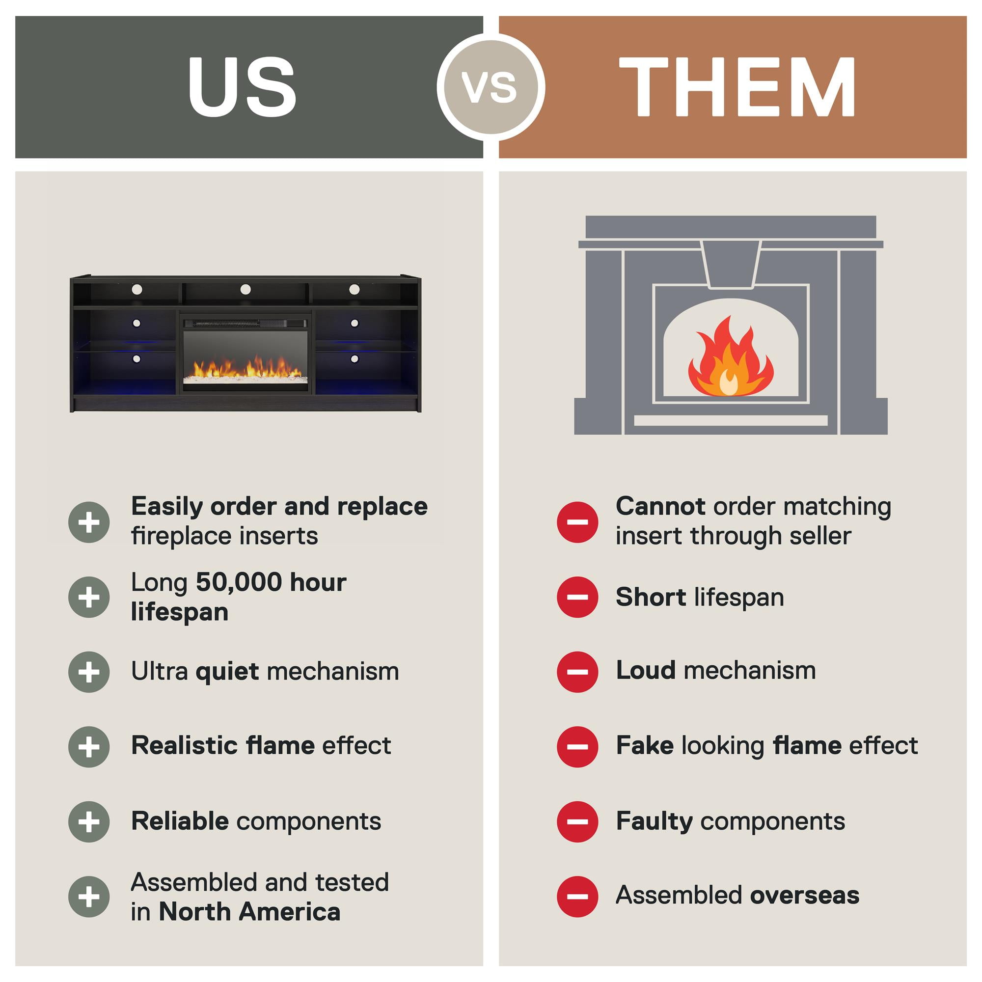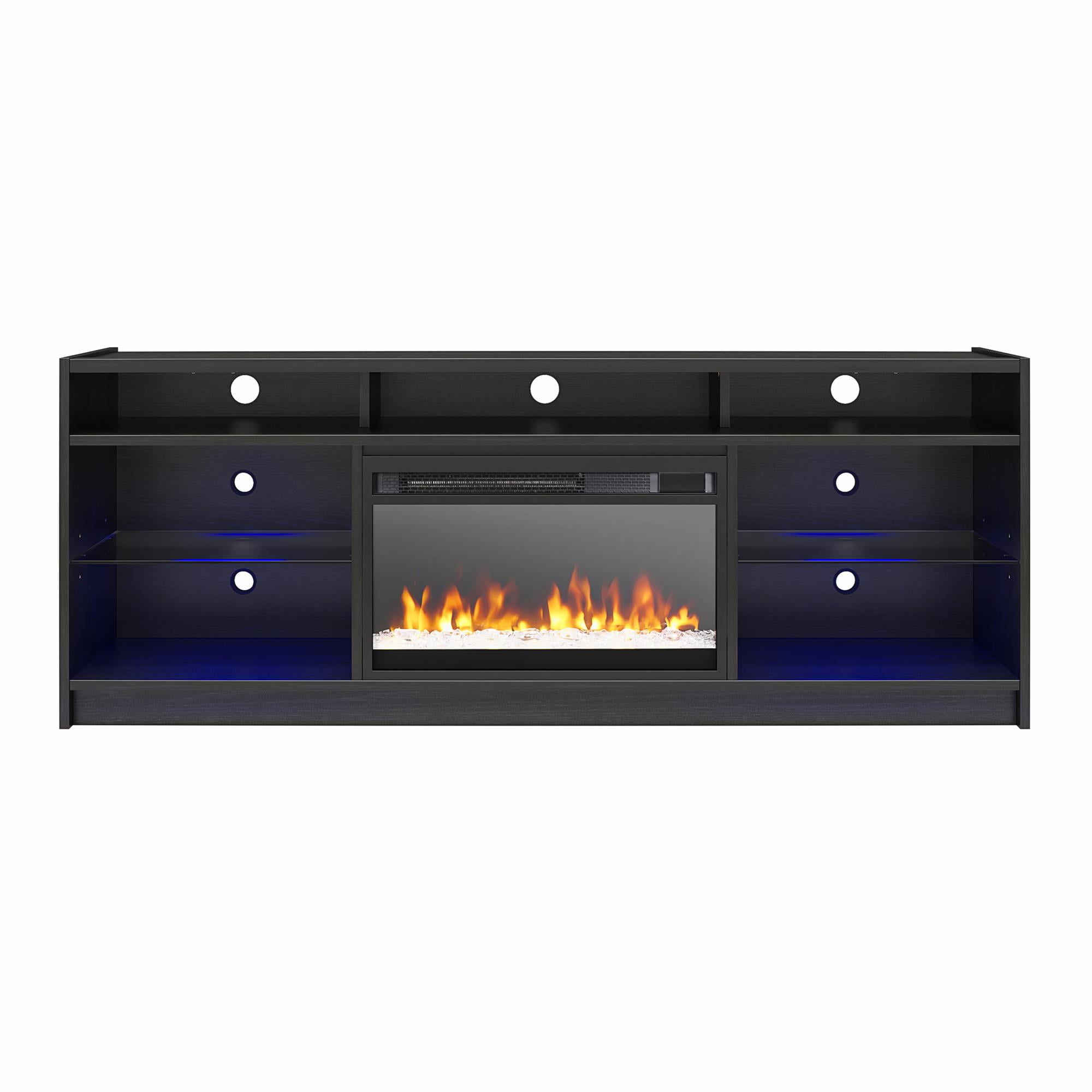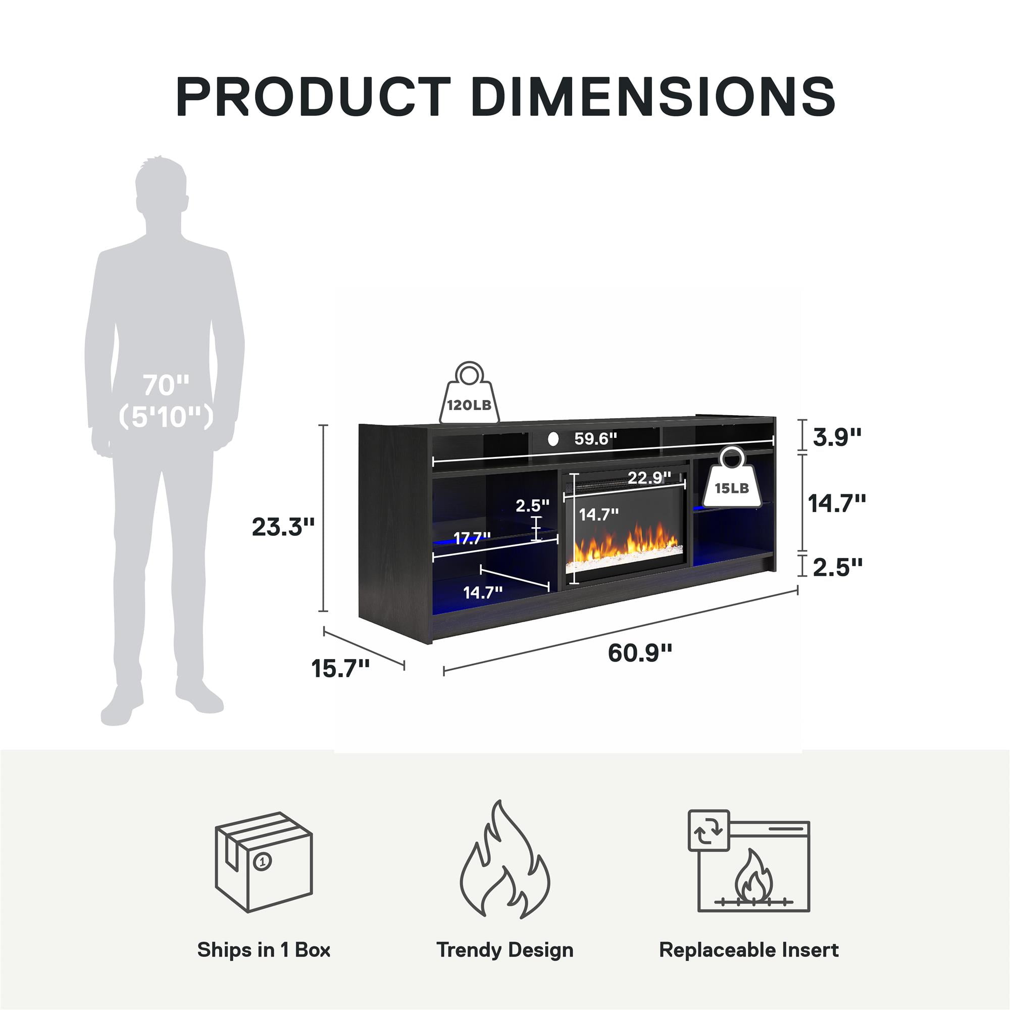 STYLISH SOLID MATERIALS: Elevate your living room or bedroom with the Lumaria 65″ TV Stand with Fireplace by Ameriwood Home; Constructed from engineered wood with two adjustable tempered glass shelves and wire cutouts for media components LED UNDER CABINET LIGHTING: Light up your shelves with the included LED light strips and store your media equipment and video game consoles on the illuminated shelves 23″ FREESTANDING FIREPLACE HEATER: Enjoy with or without heat; features timer function, touchpad display, adjustable and 7-color LED flame, crystal ember bed, and side lights, included infrared remote with AAA batteries MORE TO LOVE: Replacement inserts can be ordered as needed; Insert uses a standard plug, heats a room up to 400 sq. ft. with 50,000 hours of life, 4600 BTUs, is CSA certified with overheat protection, auto shutoff, and cool touch tempered glass front SHIPPING & DIMENSIONS: The TV Stand ships flat and requires assembly by 2 adults. Assembled dimensions: 60.87″W x 15.67″D x 23.27″H. Maximum weight capacities: Top: 120 lbs.; Shelves (5): 15 lbs. each. Assembled unit weight: 102 lbs. 1-YEAR LIMITED WARRANTY INCLUDED: Contact live agents in the U.S. and Canada for help with replacement parts, assembly assistance, or warranty inquiries via online chat, email, or phone