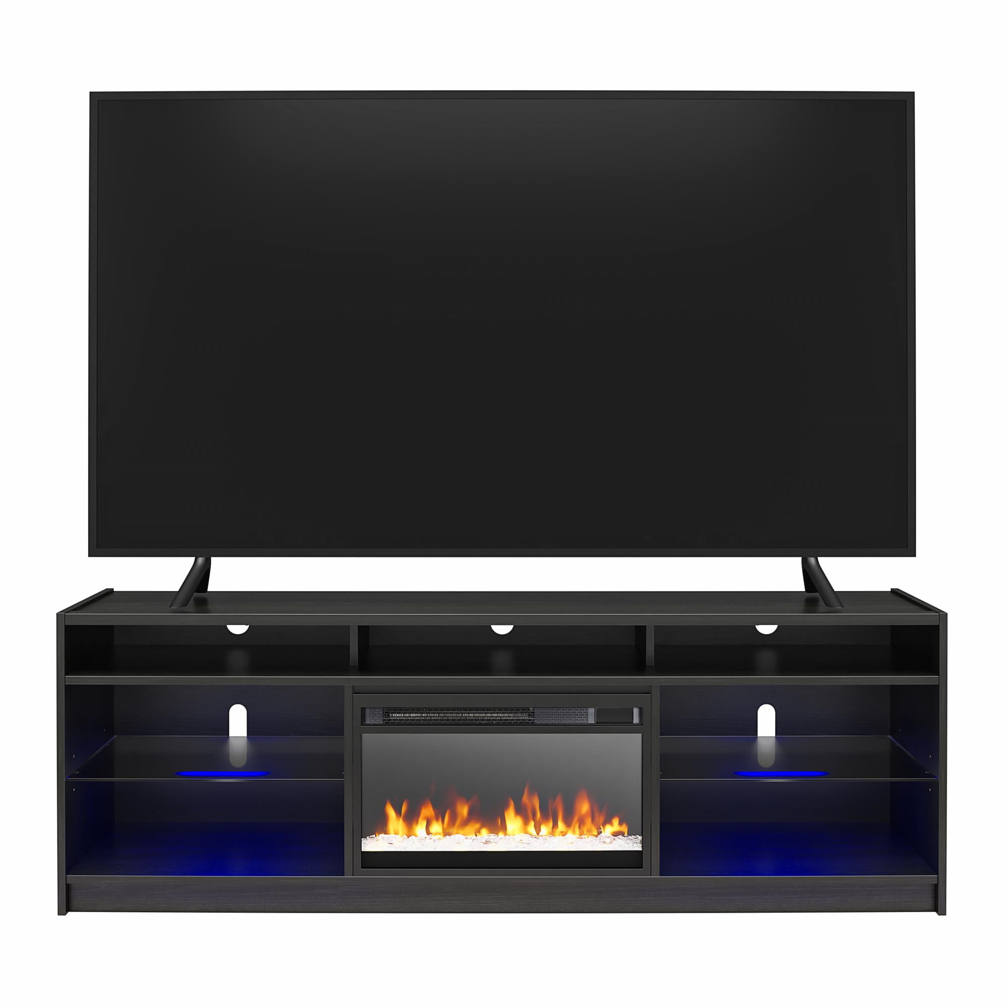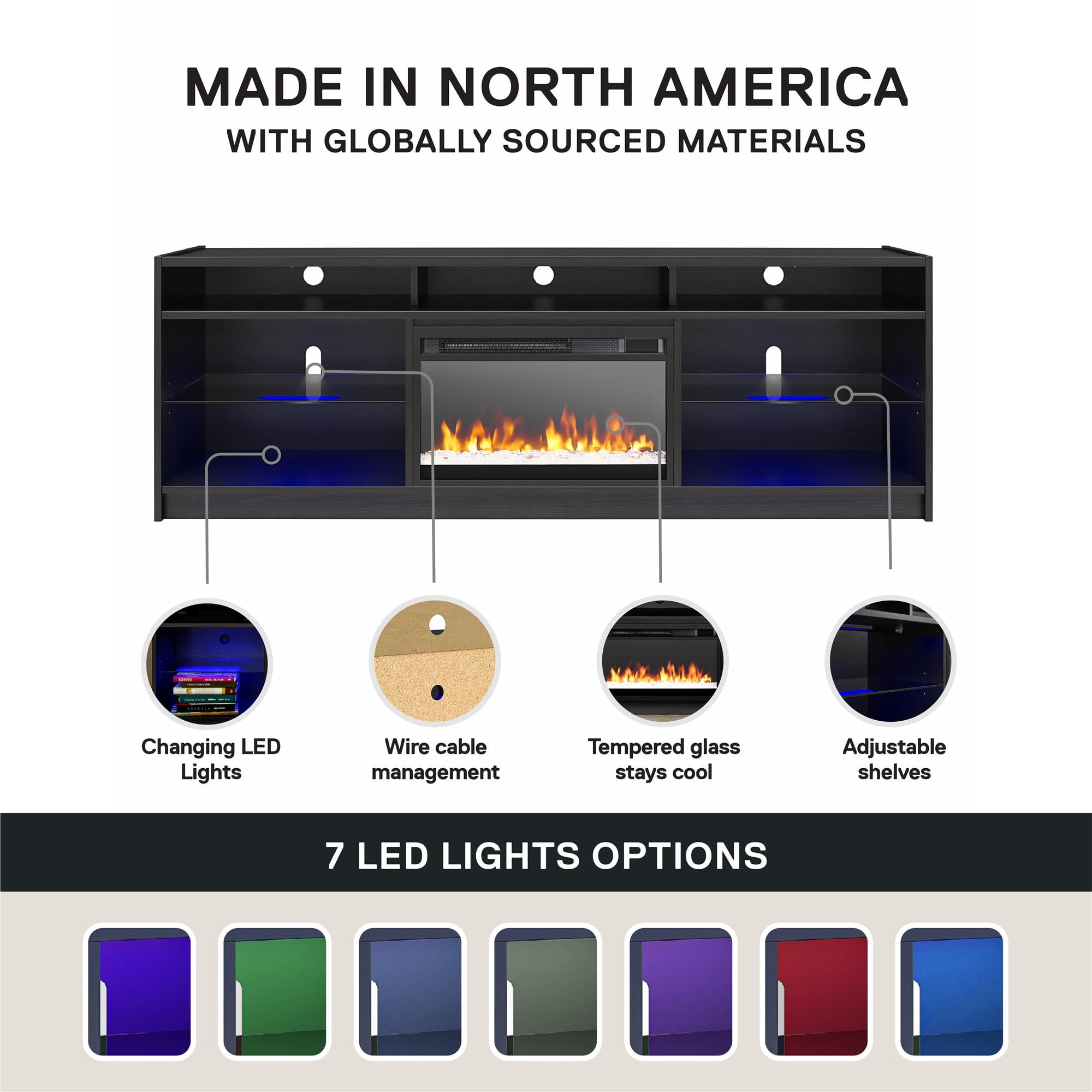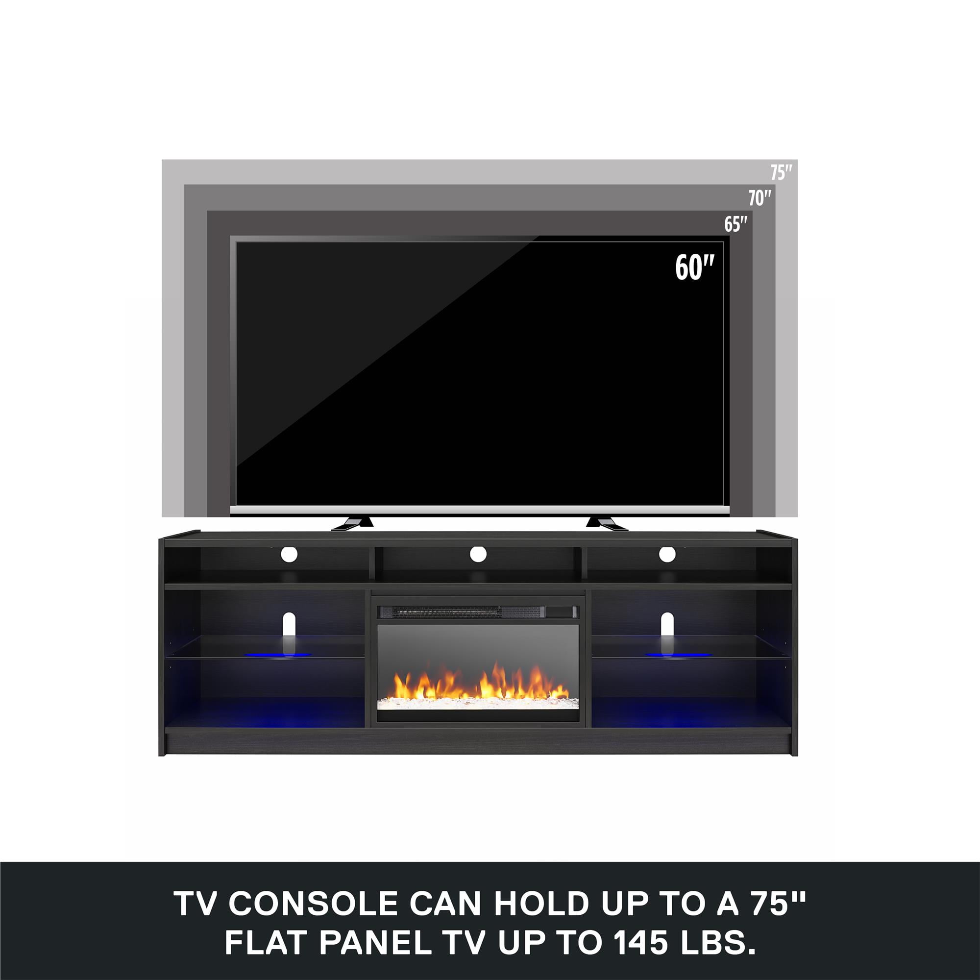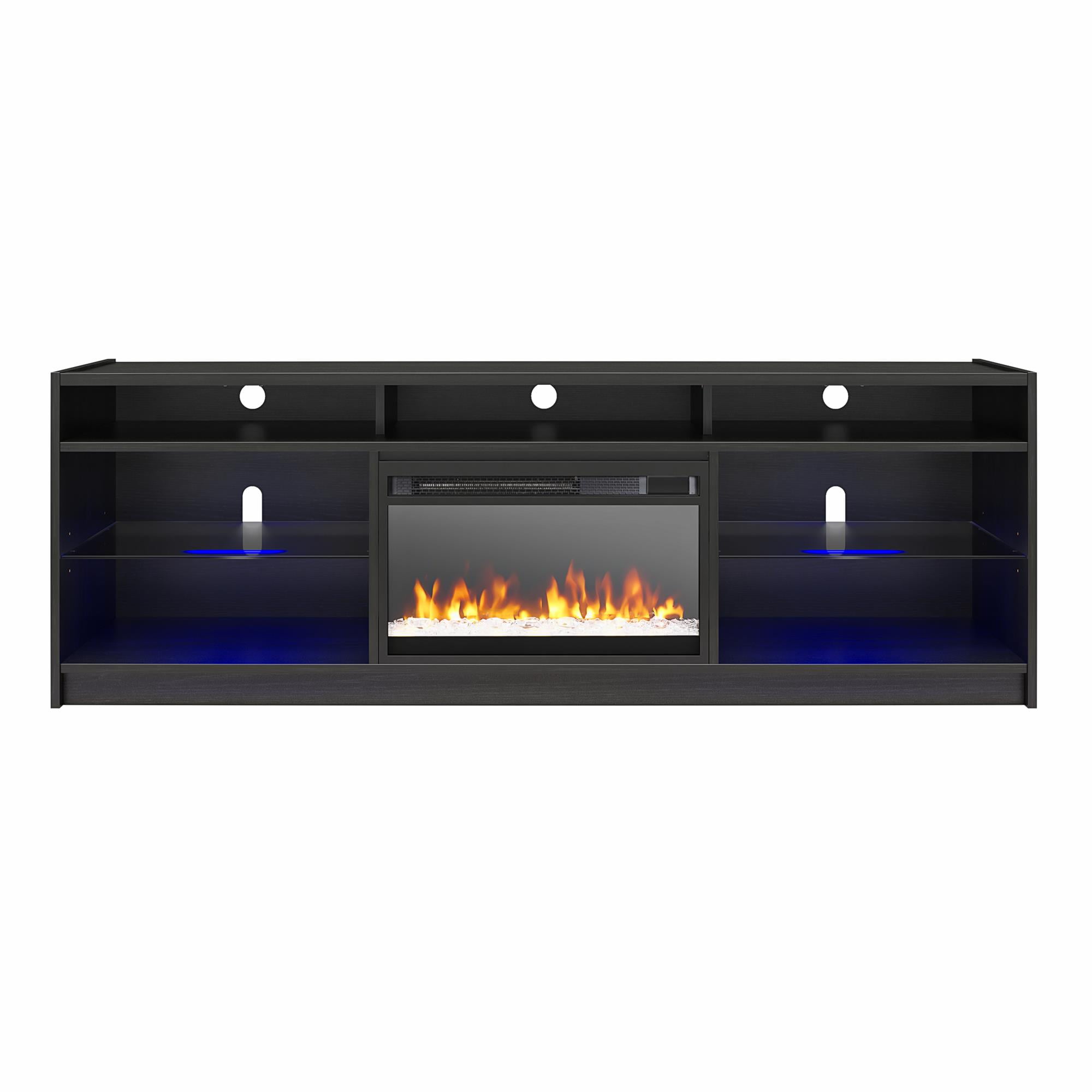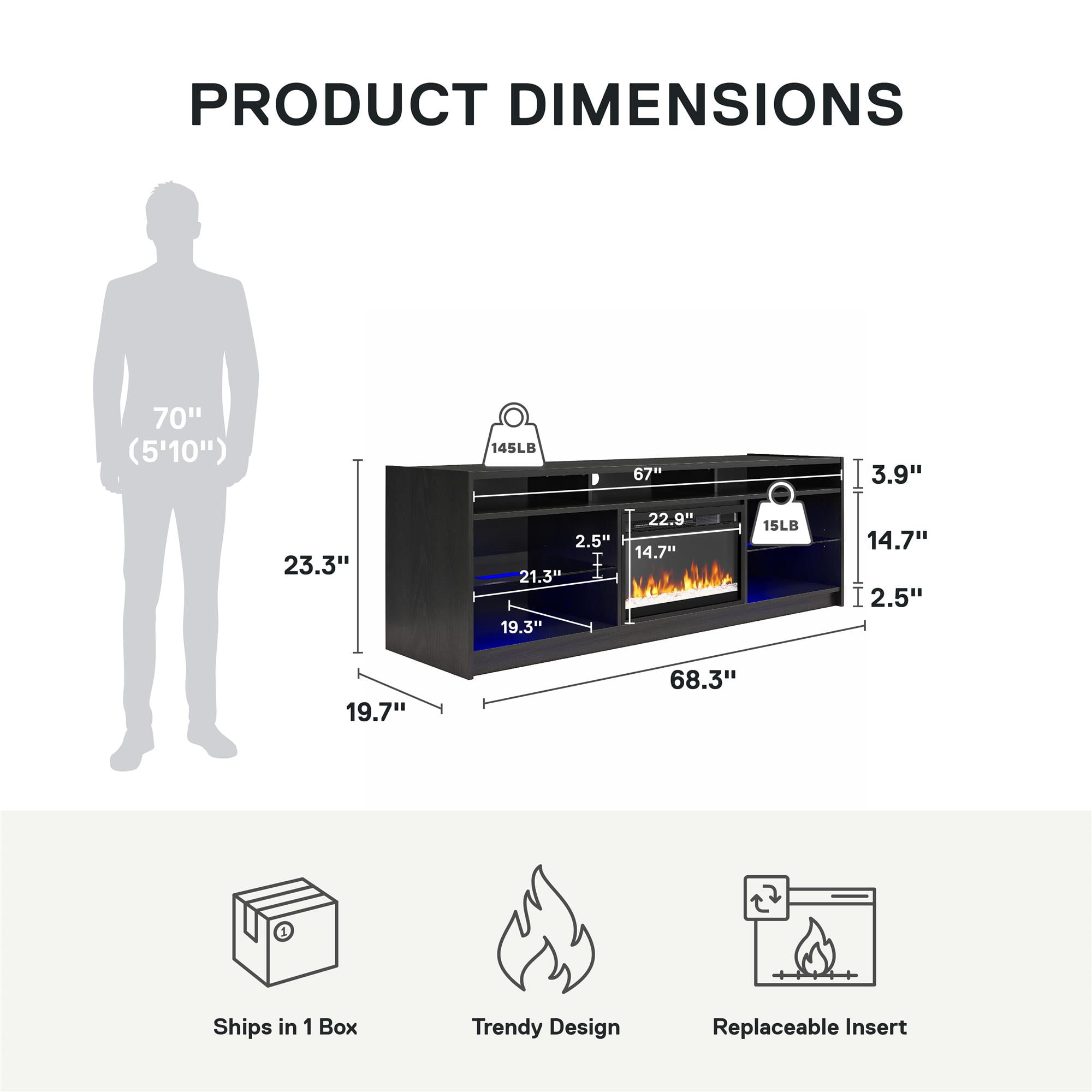 STYLISH SOLID MATERIALS: Elevate your living room or bedroom with the Lumaria 75″ TV Stand with Fireplace by Ameriwood Home; Constructed from engineered wood with two adjustable tempered glass shelves and wire cutouts for media components LED UNDER CABINET LIGHTING: Light up your shelves with the included LED light strips and store your media equipment and video game consoles on the illuminated shelves 23″ FREESTANDING FIREPLACE HEATER: Enjoy with or without heat; features timer function, touchpad display, adjustable and 7-color LED flame, crystal ember bed, and side lights, included infrared remote with AAA batteries MORE TO LOVE: Replacement inserts can be ordered as needed; Insert uses a standard plug, heats a room up to 400 sq. ft. with 50,000 hours of life, 4600 BTUs, is CSA certified with overheat protection, auto shutoff, and cool touch tempered glass front SHIPPING & DIMENSIONS: The TV Stand ships flat to your door and requires 2 adults for assembly. Assembled Dimensions: 68.27 in. W x 19.69 in. D x 23.27 in. H. Maximum Weight Capacities: Top: 145 lbs. Shelves (5): 15 lbs. each. Assembled Unit Weight: 125 lbs. 1-YEAR LIMITED WARRANTY INCLUDED: Contact live agents in the U.S. and Canada for help with replacement parts, assembly assistance, or warranty inquiries via online chat, email, or phone