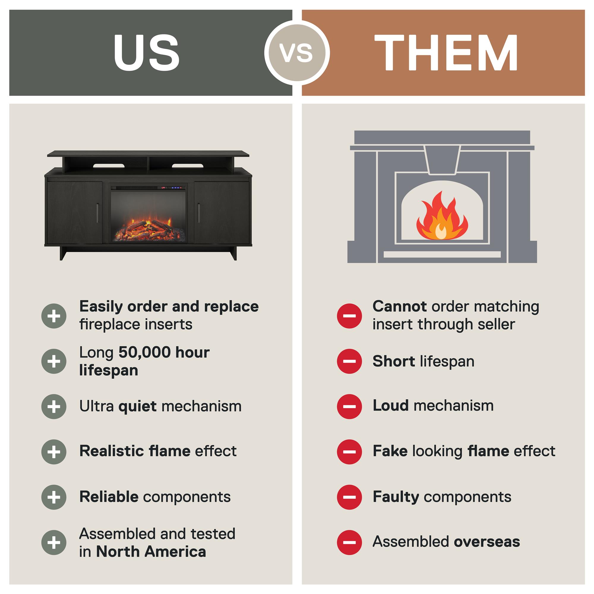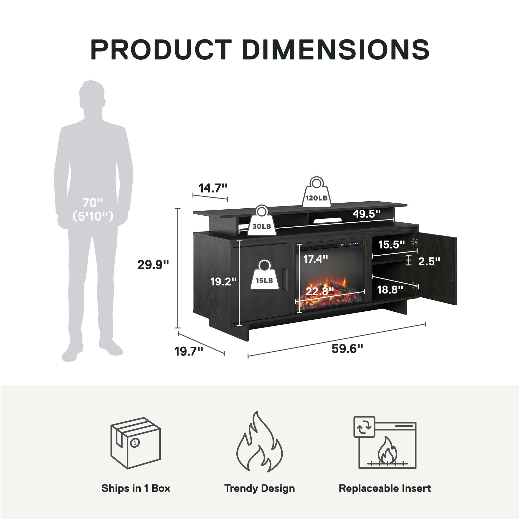 COZY AMBIANCE: Cozy up for movie night with the Midland Avenue Electric Fireplace TV Console with Storage Cabinets for TVs up to 74″ and up to 120 lbs.; Constructed from durable engineered wood and cool-touch tempered glass STORAGE WITH STYLE: The TV Stand with fireplace features a floating TV shelf, two open component compartments, a recessed area for a sound bar, wire management, and two storage cabinets with adjustable shelving 23″ INSERT: The freestanding fireplace heater can be enjoyed with or without heat, and features a timer function, 11 heat and 4 brightness levels, a touchpad display, realistic LED flame with included infrared remote complete with AAA batteries MORE TO LOVE: Replacement inserts can be ordered as needed; 4600 BTUs, is CSA certified with overheat protection, auto shutoff, and cool touch tempered glass front PRODUCT DETAILS: Ships in one box; Requires two adults for assembly; Dimensions: 59.61″W x 19.69″D x 29.88″H; Maximum Weight Capacities: Floating TV shelf: 120 lbs. Component shelf: 30 lbs. Fixed and adjustable shelves within Cabinets: 15 lbs. each 1-YEAR LIMITED WARRANTY INCLUDED: Contact live agents in the U.S. and Canada for help with replacement parts, assembly assistance, or warranty inquiries via online chat, email, or phone