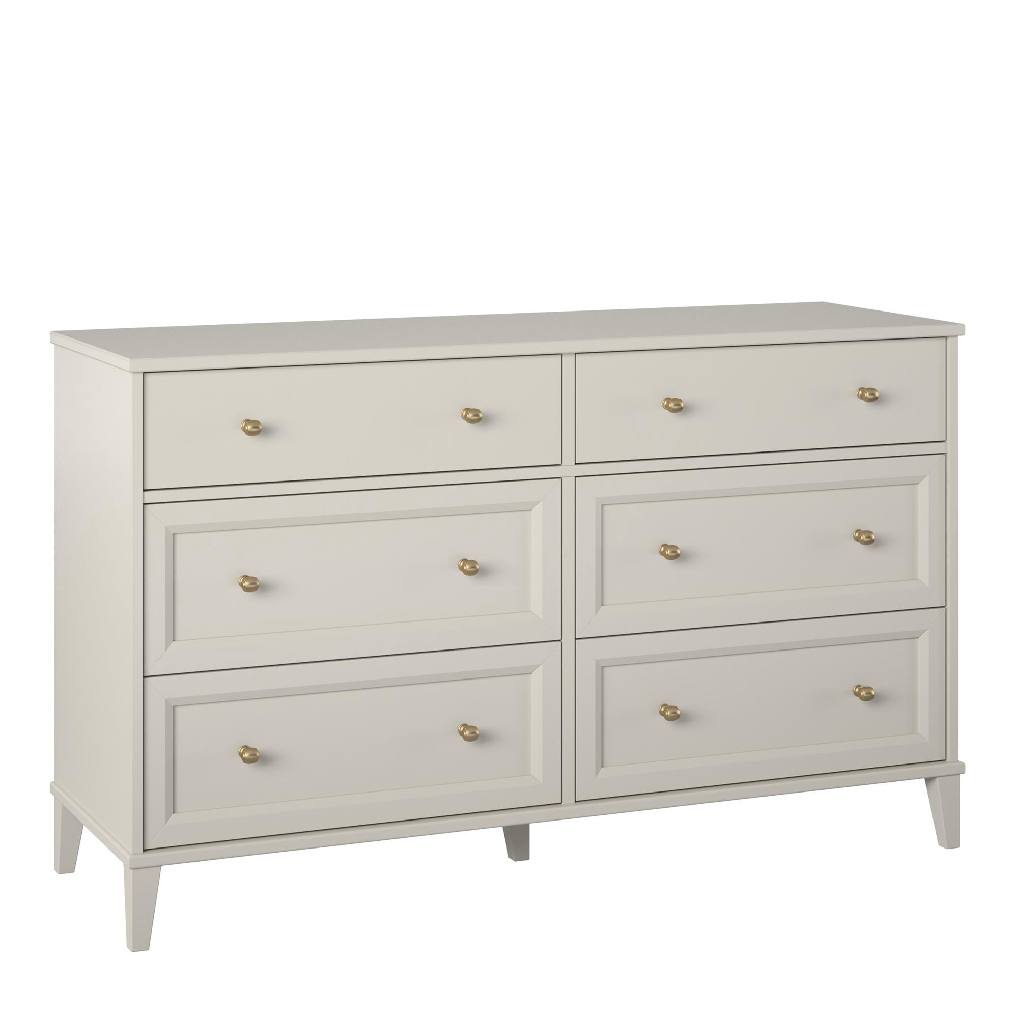 TIMELESS ELEGANCE IN EVERY DETAIL: The Ameriwood Home’s Monticello Wide 6-Drawer Dresser boasts beveled drawer fronts, brass hardware, and tapered legs for your stylish bedroom sanctuary SMART ORGANIZATION FOR ALL YOUR ITEMS: The top two drawers are fashioned with smooth fronts and are slightly smaller for more dainty items, while the remaining four drawers below are designed to handle larger items ENHANCED FUNCTIONALITY & QUALITY CONSTRUCTION: Featuring smooth linen textured laminate inside each drawer to prevent snags and pre-assembled durable metal drawer slides; Made from industrial-grade MDF and engineered wood with solid wood legs SHIPPING & DIMENSIONS: The Dresser ships flat in one box and requires assembly. A wall anchor kit is included to prevent tipping injuries Two adults are recommended to assemble. Assembled measurements: 53.54″ W x 17.7″ D x 32.52″ H ENHANCED SAFETY: This unit is Sturdy Compliant and offers a range of safety features, including anti-tip mechanisms, counterweights, interlock systems, and drawer stoppers to prevent tipping injuries 1-YEAR LIMITED WARRANTY INCLUDED: Call centers, staffed by live agents in both the U.S. and Canada, are at your service for any needs related to replacement parts, assembly assistance, or inquiries about warranties