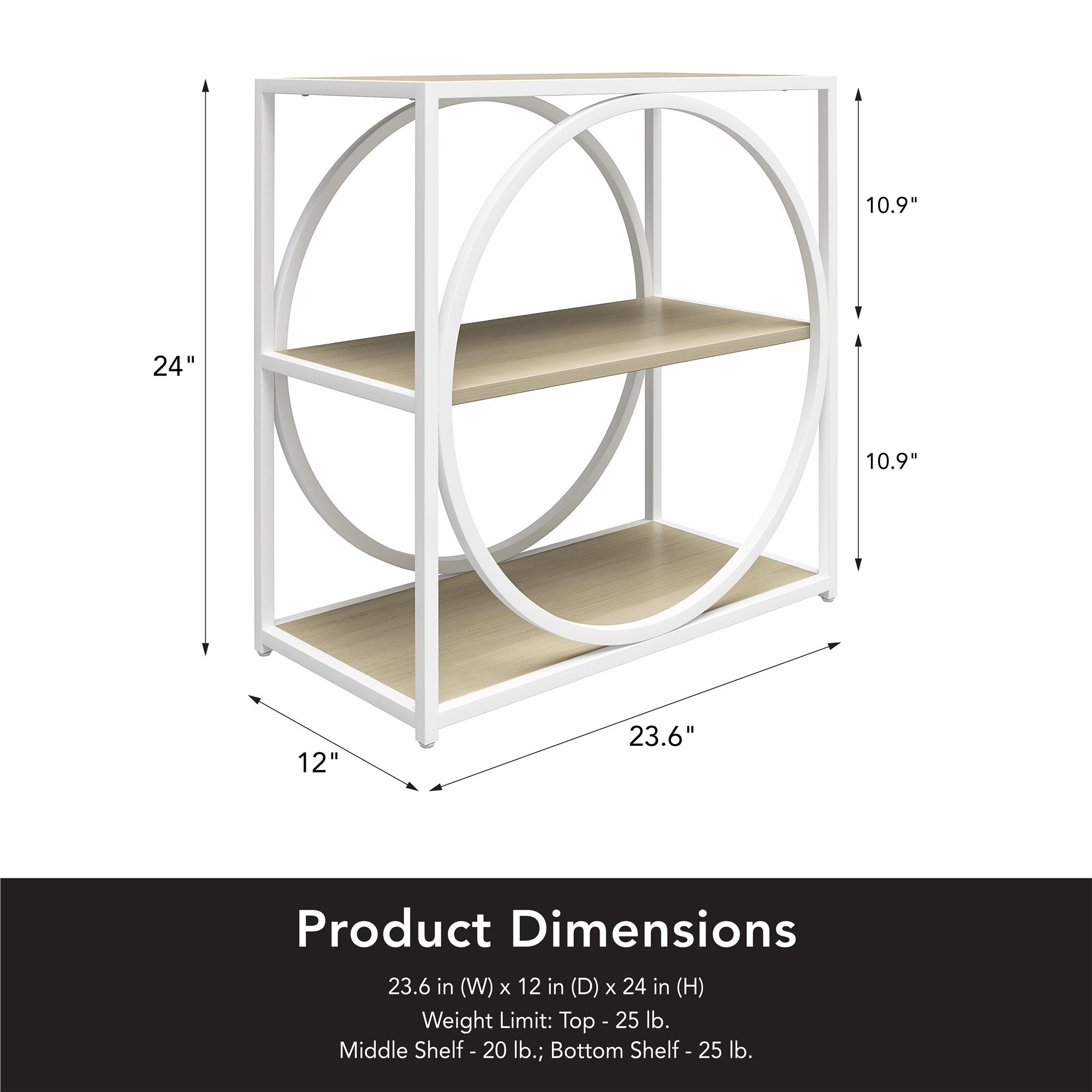 CURVACEOUS ACCENT TABLE: Make a statement with the fun and curvaceous design of the Ameriwood Home Strafford Accent Table DURABLE CONSTRUCTION: Crafted from durable engineered wood, this accent table features a light woodgrain finish that effortlessly complements the sturdy metal frame AMPLE STORAGE SPACE: Featuring four open shelves, this accent table offers plenty of room for books, decor, and more. The circular design adds a unique touch to your space ASSEMBLY AND CAPACITY: The table ships in one box and assembly is required. Top and bottom shelf: 25 lbs. each; Middle shelf: 20 lbs. Assembled: 23.62″ W x 12.01″ D x 24″ H. Shelf: 12″ W x 23.62″ D x 10.9″ H. Product weight: 25.5 lbs. 1-YEAR LIMITED WARRANTY INCLUDED: Call centers, staffed by live agents in both the U.S. and Canada, are at your service for any needs related to replacement parts, assembly assistance, or inquiries about warranties 1-year limited warranty included