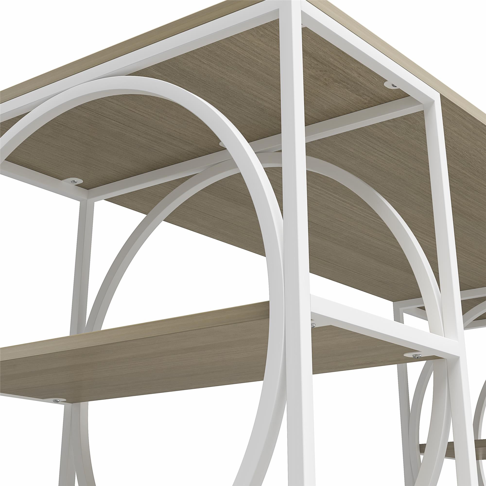 The Strafford Collection by Ameriwood Home is a fun and whimsical Memphis Design-inspired collection that brings geometrically interesting furniture back into the limelight. Transform your living space or home office into a pop art museum with the Ameriwood Home Strafford Double Pedestal Desk. Neutral heughs of pale oak on white create a sophisticated ambiance to coordinate with any space, while its curvaceous shape is sure to be the topic of conversation at your next soiree. Expand upon the motif by snagging the entire Strafford Collection. (Each sold separately) Four open shelves and generous desktop space consisting of durable laminated MDF and a sturdy powder coated metal mean you don’t have to sacrifice dollar signs for great design. The desk ships flat to your door and 2 adults are recommended to assemble. Each shelf can hold up to 20 lbs. and the desktop up to 100 lbs. Assembled dimensions: 60″ W x 23.62″ D x 30″ H. Shelf dimensions: 12″ W x 23.62″ D x 10.9″ H. Product assembled weight: 47.03 lbs.