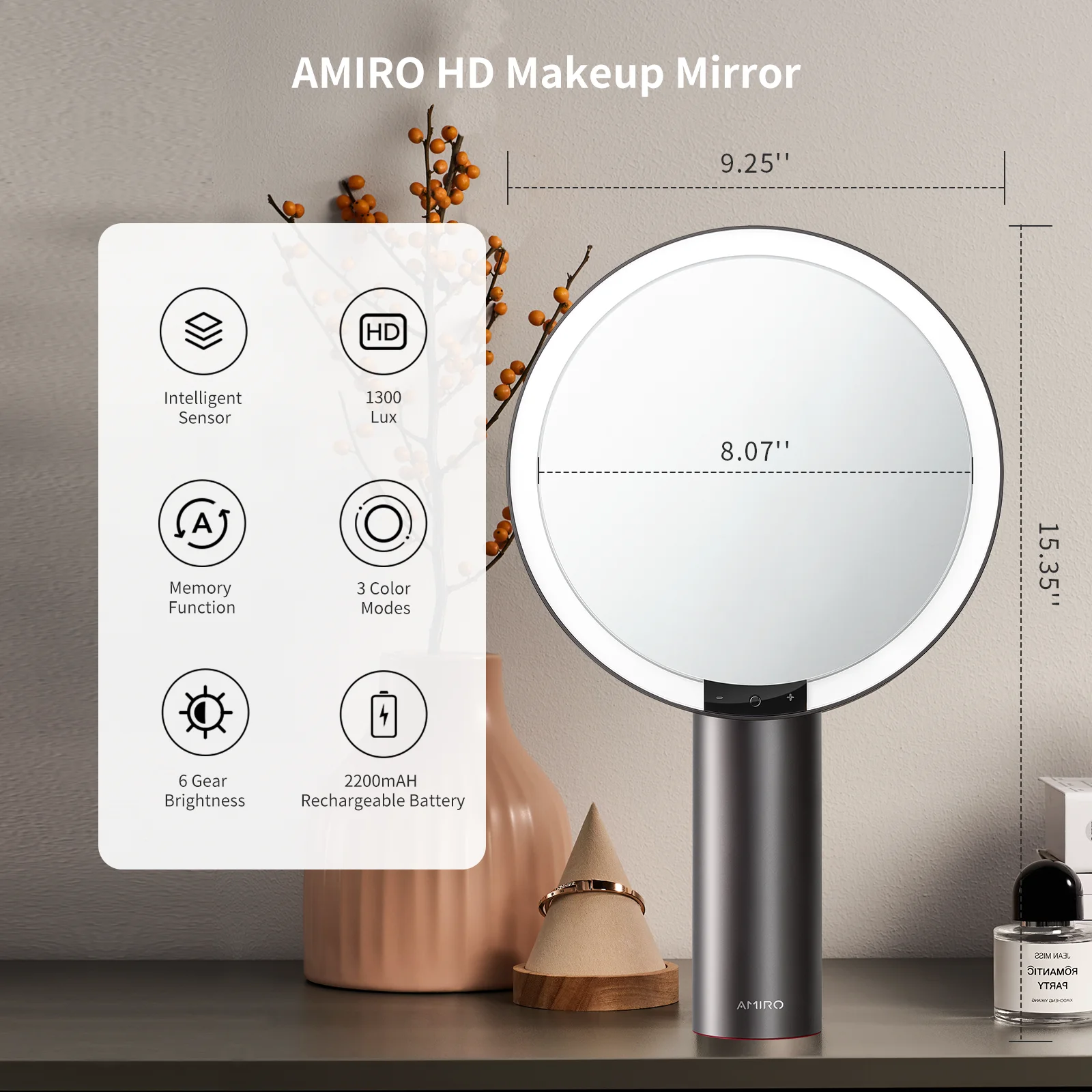 【Makeup Mirror, With Small 10X Magnifying mirror】9” size vanity mirror, entire face in HD view. With a small 10X Magnifying mirror for applying detailed makeup, wearing contact lenses and eyebrow tweezing, shaving, hair styling, and facial care. Makeup mirror built-in Premium bright led lights can light the darkest and poorly lit areas, natural and soft, bright but not dazzling. Easily switch the color to see how exactly your makeup will look in various lighting situations. 【Smart Touch Control & Memory Function】This makeup mirror with lights has 3 smart touch buttons, turn on/off the light by touching the sensor switch, pressing the left button to change the color modes, and long press the right button to adjust the led brightness. The makeup mirror with lights can automatically turn on or turn off when it detects human movement. This lighted makeup mirror is specially designed for memory function and keeps your lights set like your last use. 【USB rechargeable and built-in 2000 mAh Battery】 AMIRO makeup mirror has a built-in 2200 mAh rechargeable lithium battery, which continuously works for up to 3-5h after fully charged. It can be charged through a USB by a power bank, PC, etc., and work lighted for a long time. Convenient to move the vanity mirror with lights to another desk. Note: The USB-C cable is in the box. 【Brightness Adjustable and 3 Color Lighting Modes】AMIRO vanity mirror with 50,000 hours life, CRI97, 1.66 million light surround, Max 5200 Lumens high brightness LED Light Strip, with warm /natural /cold white three-tone settings, and the brightness can be adjusted to 0%-100%. The led lights are controlled by the smart touch sensor switch on the mirror face, a short press to turn on/off the light, which can perfectly meet your different makeup needs and make your makeup more delicate. 【50°Rotation and Durable Made】50 degree free rotation can let you place this lighted makeup mirror swiveled to each side easily and help you to see more detail, convenient for you to select the best angle or position. There are soft and non-slip rubbers at the mirror base, stable enough to place this lighted makeup mirror on the table by itself. Not only a professional makeup vanity with lights but this lighted makeup mirror can also be used as a desk lamp, night light, ambient light and etc. 【????Perfect Gift & 100% Satisfaction Guarantee】This vanity mirror with lights is very suitable as a gift for girls who love beauty. Especially on birthdays, Valentine’s Day, Mother’s Day, Christmas, etc. We offer a 12-MONTH Exchange or 30-DAY Money Back Warranty Unconditionally, please feels free to contact us if you have any problems with the makeup mirror.