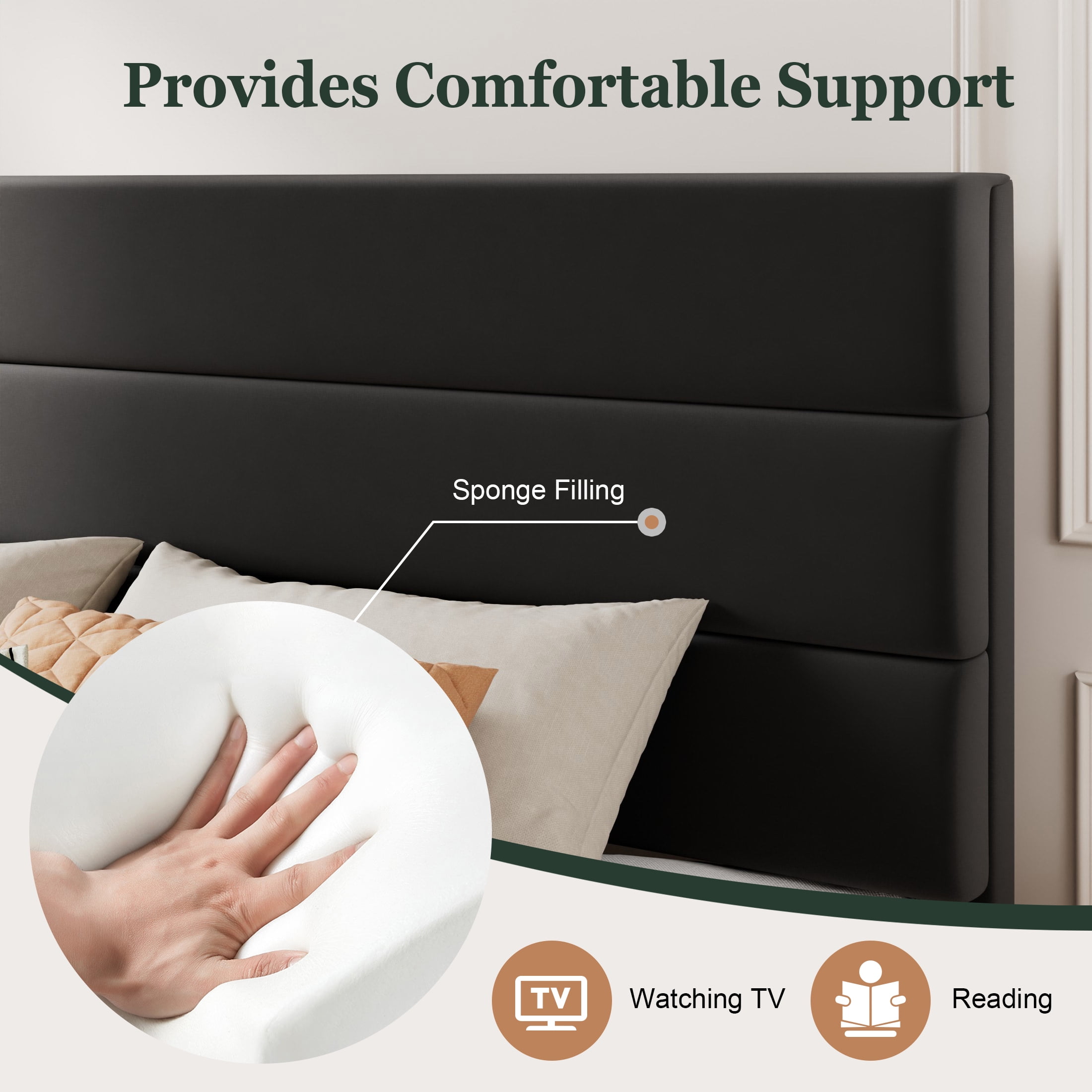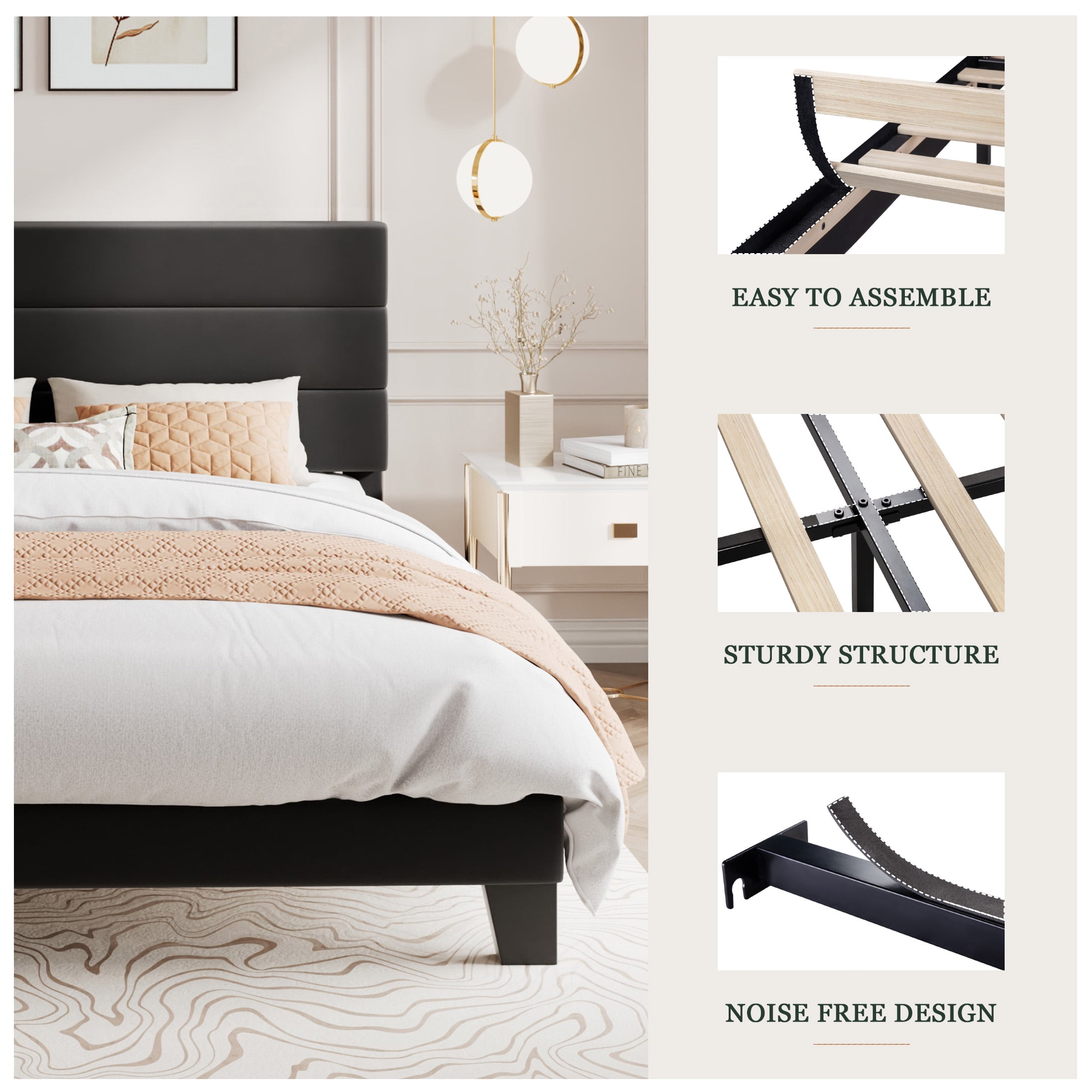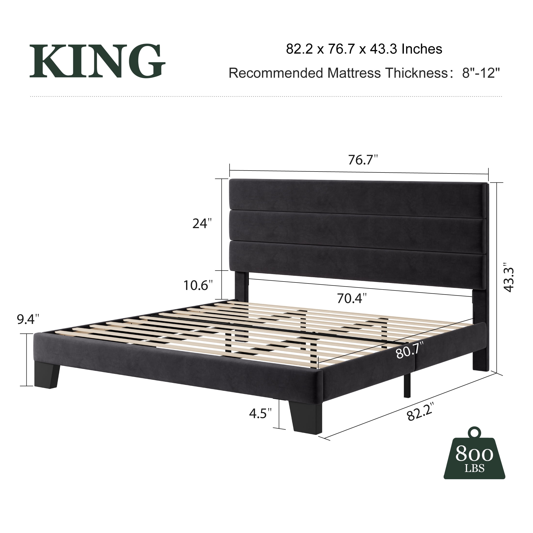 Amolife Platform Bed Frame with Velvet Upholstered Headboard and No Box Spring Needed Features: No Box Spring Required: This velvet platform bed frame features a slatted base support system designed to hold your mattress securely without needing a box spring. The evenly spaced wooden slats provide optimal weight distribution, ensuring long-lasting comfort and reducing mattress wear. Effortless Assembly: This bed frame assembles in under 40 minutes with a user-friendly, tool-free design. Pre-drilled holes, numbered parts, and clear instructions simplify the process. The lightweight yet durable components snap together seamlessly, minimizing frustration. Noise-Free Performance: Engineered with reinforced joints and EVA foam, this bed eliminates squeaks and creaks, even during movement. The velvet fabric and tightly secured components dampen sound, ensuring undisturbed sleep. Sturdy, Durable Build: Crafted from robust steel, the frame supports up to 800 lbs. The reinforced center legs and rigid slats prevent sagging, while the velvet-wrapped headboard adds stability. Its rigid structure stays intact over time, resisting warping or wobbling. Luxurious Velvet Headboard: The upholstered headboard offers velvet, soft-touch comfort and serves as a stylish focal point. It’s padded design lets you lean back comfortably. Stain-resistant velvet fabric ensures easy maintenance, blending practicality with elegance. Specifications: Color: Black Size: King Age Group: Adult Material: Velvet & Metal & Wood Weight Capacity: 800 lbs Package Weight: 80.9 lbs Assembly Required: Yes Box Spring Needed: No King Size Dimension: 82.2 x 76.6 x 43.3 in. Additional Feature: Free replacement parts for damage caused by normal use within 1 year Package Included: Bed Frame & Hardware & User Manual & Tools (Mattress not included) Explore More for Amolife products