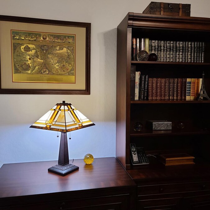 With warm tones and classic lines, this Amora Lighting table lamp is a beautiful mission-style piece. This Tiffany Style lamp is handcrafted using the same techniques that were developed by Louis Comfort Tiffany in the early 1900s.