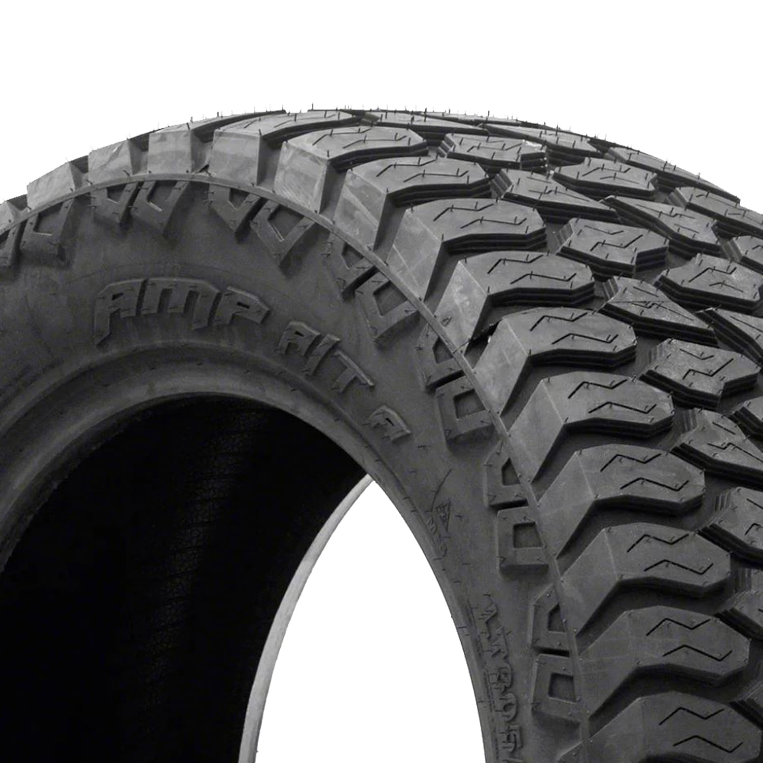 AMP Terrain Attack A/T A FEATURES AND BENEFITS All season traction All terrain traction Enhanced controllability Longer lasting tread life OVERVIEW The AMP Terrain Attack A/T A is an all terrain, all season tire manufactured for light trucks and SUVs. The tread design and all season tire compound increase the year round road gripping ability and power. The tread elements, with the siping detail, manage to increase the number of biting edges gripping the road and terrain surface during the drive, while the durable compound keeps the rubber flexibility throughout the year. Even in various temperatures the tire provides a safer driving experience with the better surface gripping ability. The tread’s open shoulder detail and wide groove pattern avoid hydroplaning during the model’s on-road performance. They channel water and slush from the footprint, enhancing the wet and winter weather driving safety. The combination of the staggered tread blocks, high void ratio and detailed upper sidewall pattern also boosts the all terrain performance. They increase the tire’s grip on road and terrain surfaces, allowing its secure soft, loose and uneven terrain grip. These tread elements upgrade the surface grip, while ensuring the tire’s constant forward motion. The tire is able to perform in deep mud and on loose dirt as the sidewall pattern provides side-way biting edges, which prevent it from getting stuck on such terrain surfaces. The tread’s high void ratio and staggered tread elements improve the self-cleaning ability. They disperse mud and snow and eject rocks stuck between the tread elements. This keeps the tire’s surface contact at all times, which effectively resisting stone retention, which can shorten the tire’s service life. The durable construction enhances the tire’s driving durability. The model’s internal structure maintains the ideal tire shape under the load and driving pressure affecting the model. The reinforced internal structure, in this manner, significantly increases the tire’s load carrying and withstanding ability and power. This upgrades the tire’s load capacity. The durable structure and the tire’s optimal surface contact increase the controllability. They maintain the tire’s surface contact and enhance the steering responsiveness and the driving stability. The steering becomes faster and more precise in its responsiveness to the driver’s commands, while the structure is stabilized against the driving pressure affecting the model. As a result, the tire guarantees the driver’s constant control over the vehicle at all times. The Terrain Attack A/T A lengthens its usability. The stronger tire compound’s wear-resistant rubber materials prevent accelerated tread wear along the tread area with the slower tread wear rate. The tread’s staggered tread blocks optimize the surface contact and ensure even pressure distribution along the tread area. The decreased and even wear manner greatly extends the tire’s tread and service life. Manufacturers recommend changing tires every 10 years. As long as tires are properly stored before they are sold, the year of their manufacture will not shorten their service life.