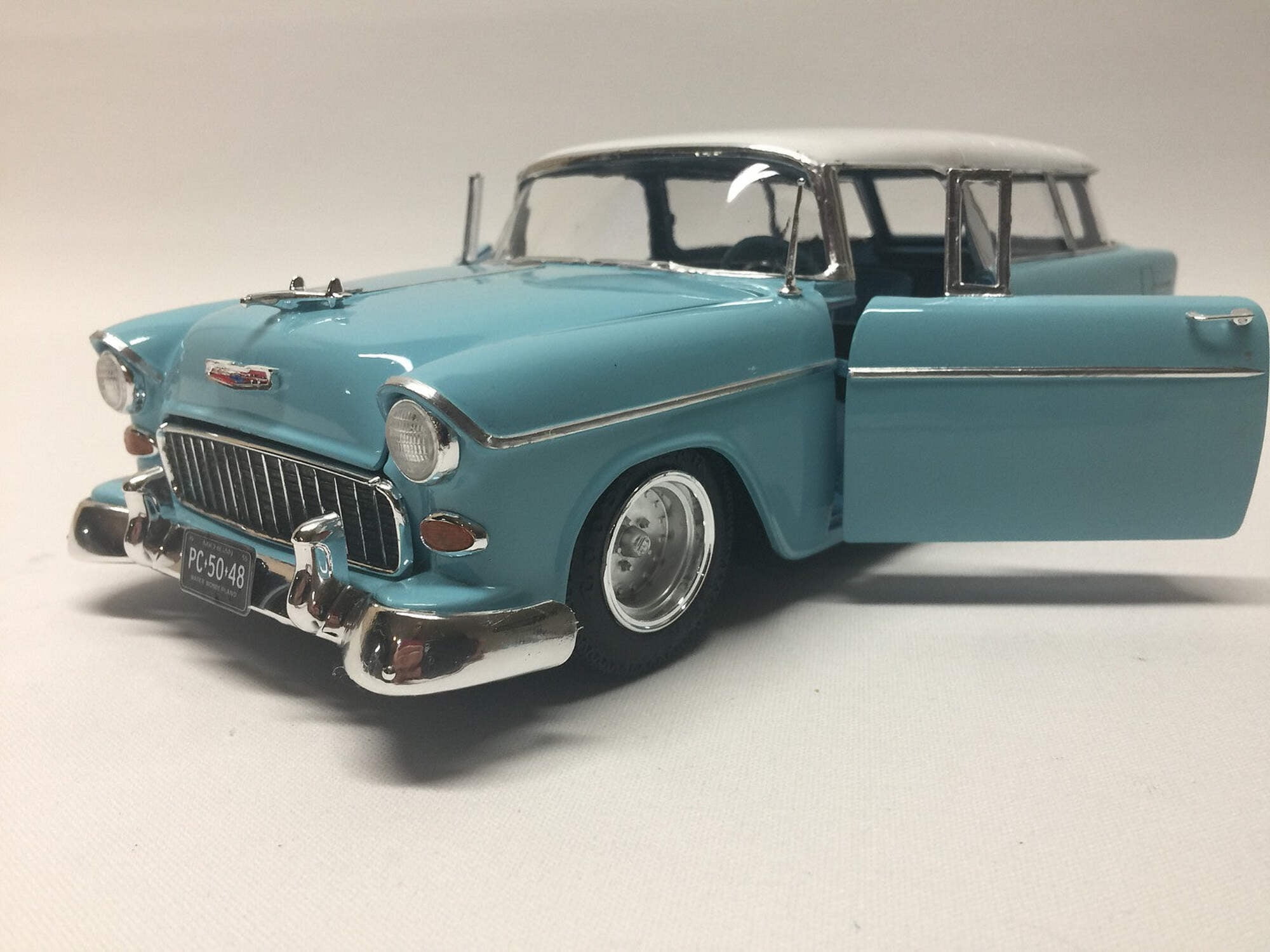 AMT® 1955 Chevy Nomad Wagon Plastic Model Kit, 1/16 Scale BIG 1/16 Scale model kit Molded in white styrene plastic Opening doors and tailgate Super-detailed chassis, engine and interior Skill Level 3 Paint and cement required (sold separately) The Kats at AMT have resurrected another big scale classic! The 1955 Chevy Nomad is as beautiful as it is functional and AMT™s 1/16 scale kit builds an authentic replica of this iconic GM wagon. It features super-detailed interior, engine and suspension components with opening doors and tailgate! Also included are options for a street smart custom version with a turbo upgrade, mag wheels, side pipes and more! Full Retro Deluxe™ treatment with expanded decals and vintage packaging round out this ultimate tri-five Chevy kit! Build BIG with AMT! WARNING: This product can expose you to chemicals, including Styrene which is known to the State of California to cause cancer. For more information, go to: