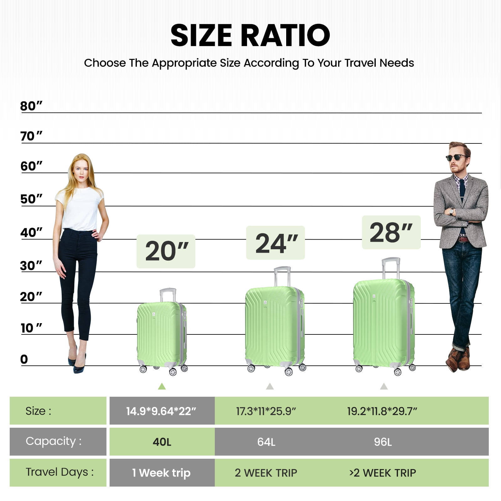 High Quality:These luggages are made of high quality PC+ABS material, which is wear-resistant and drop-resistant. The shell is tough, not easy to deform, and easy to move. Double-layer explosion-proof zipper design, whether open or closed, will not jam. Everything is so smooth. Capacity and Space Design: 20in with 40L,24in with 64L,28in with 96L. You can choose the right suitcases according to your needs, and the standard 20 inch suitcases can be carried directly on the plane. Mesh bags and dry and wet separation bags allow small items to be organized, X fixed belt to secure clothing, to avoid messy. No matter how bumpy the journey, the luggage is always in order. Adjustable Pull Bar and Handle: The height of the pull bar can be adjusted freely according to the user’s height in different environments and can be adjusted at any time. Reasonable slot space, so that the tie rod will not be stuck, will not loose off. There is a soft TPC handle on the top and side of the luggage, which can easily lift the suitcase in places where it cannot be rolled. TSA Lock and Silent Universal Wheel: TSA lock is safe and reliable, only you can easily open the luggage, protect your personal belongings security. Double row four wheels, large size and high quality wheel hub, can bear higher weight, more wear resistance, rolling silk smooth, roller using silent design, no longer embarrassing because of noise by pedestrians. Customer Service: We have a professional customer service team, no matter what problems you encounter in the process of use, please feel free to contact us at any time. We will provide you with a satisfactory solution. Kepane makes your journey easier.