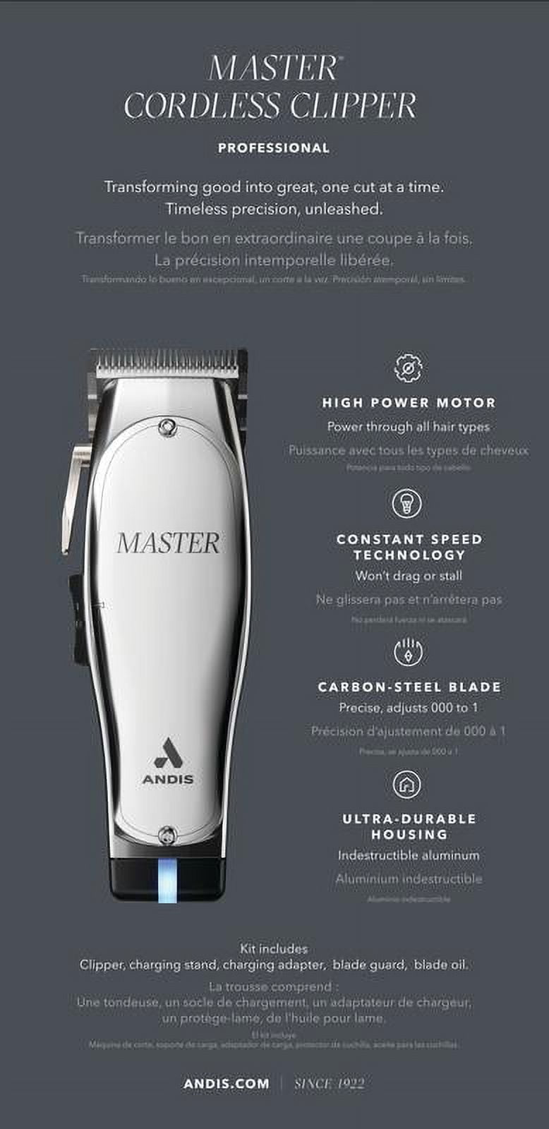 CORD/CORDLESS: It is compact and lightweight for better flexibility, you can get consistent power with or without a wire, with cutting strokes per minute of 7,200 SPM. ADJUSTABLE BLADES: From fine to coarse size 000 to 1 with the upper blade, which features fast feed action and is more durable and stays sharper longer than other blades, providing smooth hair/beard trimming with entire body grooming. LONG PERFORMANCE: These electric trimmers contain powerful rechargeable lithium-ion batteries that can work nonstop for up to 90-minute hours on a 1-hour charge. PRODUCT DETAILS: Andis Professional Master Corded/Cordless hair & beard trimmer measures 3.25 x 5 x 9.8 inches and weighs 2 pounds, includes a charging stand, charging adapter, blade cleaning brush, and blade oil. The Andis Professional Master Corded/Cordless Hair & Beard Trimmer is great for trimming necklines and making minor adjustments. The new upgraded motor increases speed, power, and battery life. Modern lithium-ion batteries deliver consistent power. They will not stutter or drag during the cutting process. Constant speed technology ensures that the maximum amount of power is available for optimal results. The lithium-ion battery has a capacity of 2 hours and can be charged in 90 minutes. The kit contains one trimmer, a charging stand, a charging adapter, a blade cleaning brush, and blade oil. Powerful, high speed, legendary—the Master® Cordless Clipper belongs in the hands of those willing to break the mold. Driven forward by an inexhaustible magnetic motor, extra-sharp carbon-steel blades adjust for lengths 000 to 1 to deliver professional precision on every single cut. Breeze through the busiest afternoons in the shop with cool, quiet operation and a special rapid-feed blade design. Made for years of heavy use, the shiny, indestructible aluminum casing looks as sleek as it cuts and handles all your great ideas. Master your craft with the Master® Cordless Clipper.