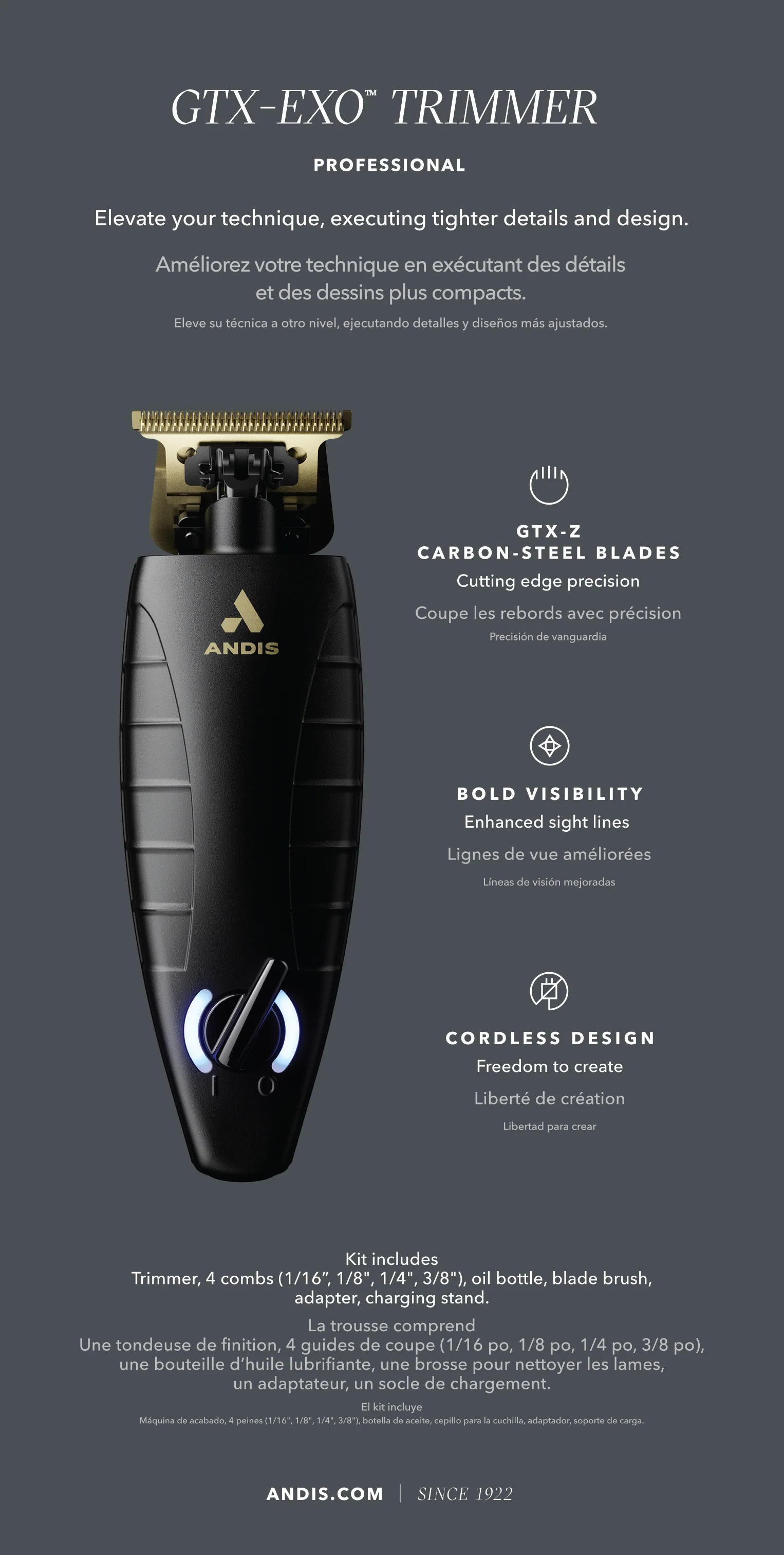 Better than ever. Take your styling and creativity to the next level with the Andis GTX-EXO Trimmer. While keeping everything you love about the pro standard T-Outliner, precision has taken a huge leap forward. An intuitive shape gives crystal clear visibility as you outline, shave and fade. The better-than-ever GTX-Z blades are retooled to cut closer than before and can be zero-gapped and are finished in Gold—without modification. Cordless means more flow and less restriction, so you can create until the battery says, “hold up.”
