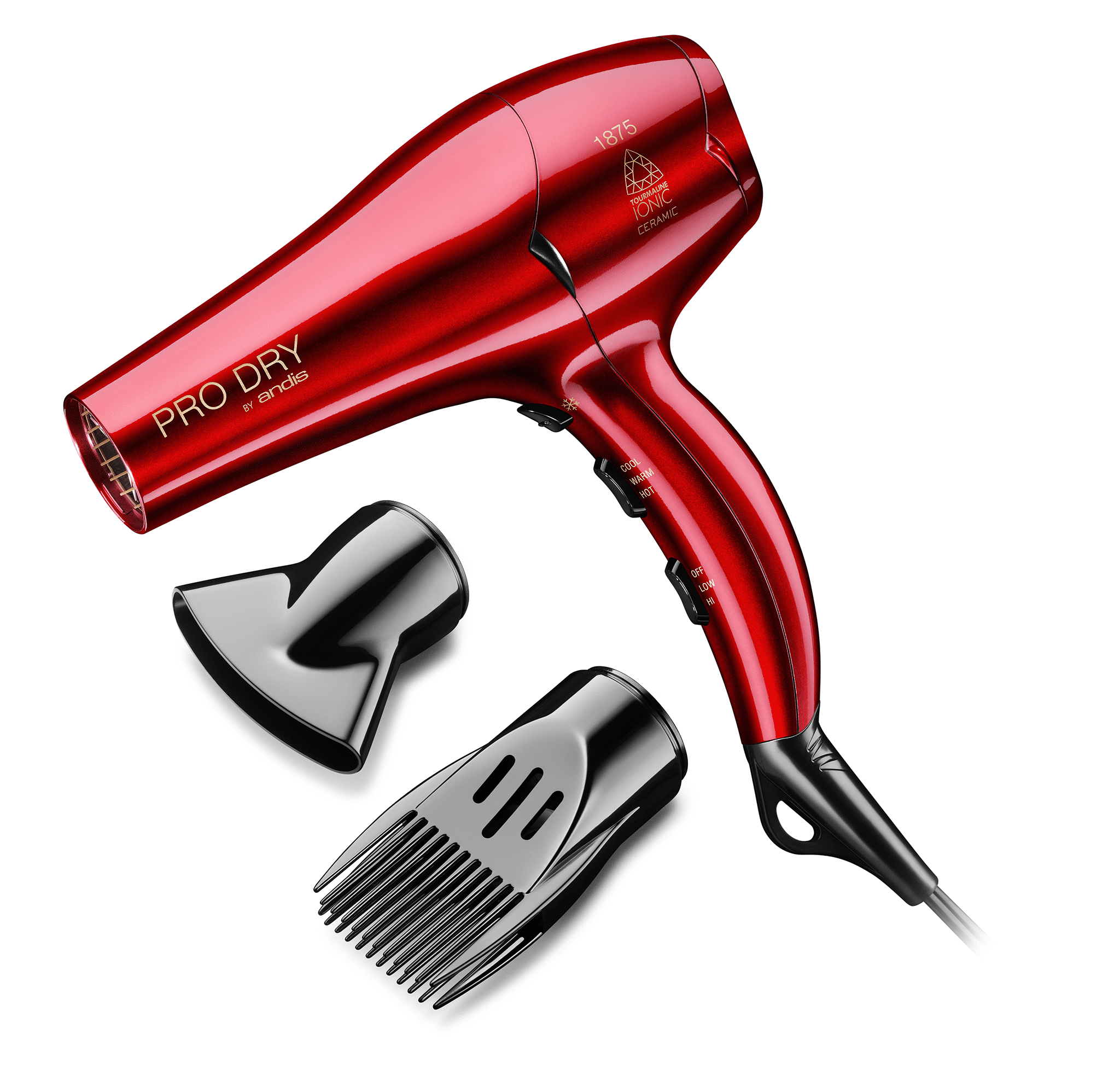 Andis Pro Dry Tourmaline Ceramic Hair Dryer with Pick and Concentrator, Ionic, 1875 Watts, Red Tourmaline ionic technology dries hair faster with less damage 3 Heat/2 speed settings with cool-shot button Lightweight, high-velocity hyper DC motor dries hair fast Includes snap-on concentrator and styling pick – won’t fall off Removable filter cap for easy cleaning