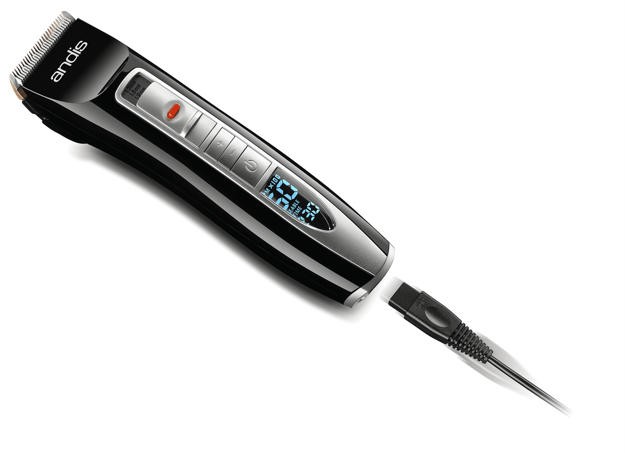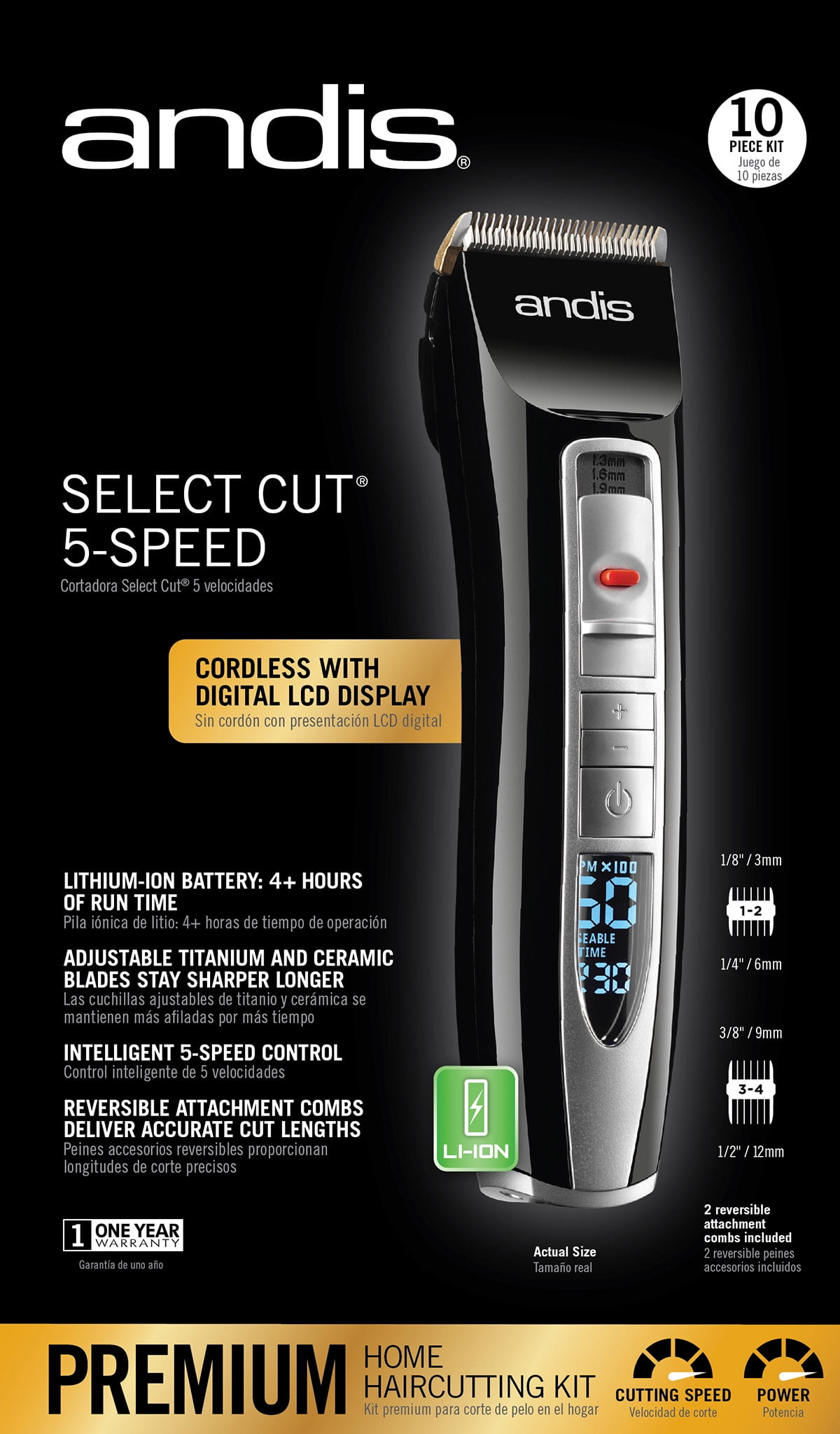 Andis Select Cut 5-Speed Adjustable Blade Clipper Kit, 10-Pieces. Cord/cordless design for use anytime, anywhere. Digital LCD display shows speed and battery levels. Lithium-ion battery delivers 4+ hours of run time from a single charge. Intelligent 5-speed control for cutting all hair types. 4-Position blade and 2 reversible attachment combs deliver many cutting lengths. Ideal for cleaning up necklines and trimming around ears; perfect for maintaining sideburns. Andis Select Cut 5-Speed Adjustable Blade Clipper Kit, 10-Pieces Adjustable blade clipper Attachment comb sizes 1/8″ and 1/4″, 3/8″ and 1/2″ Barber cape Stainless steel scissors Styling comb Charging adapter and cord Storage case, blade brush and oil