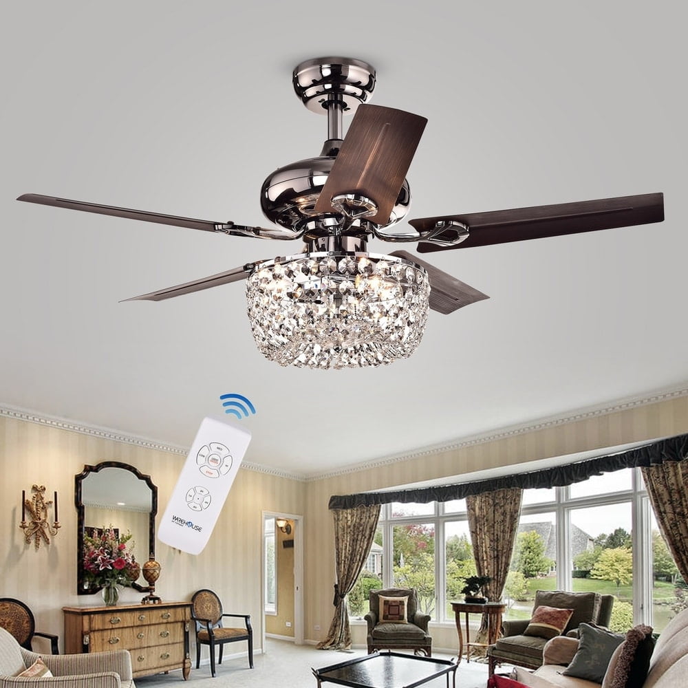 Angel 3-light Crystal Chandelier 5-blade 43″ Brown Ceiling Fan (Optional Remote): Angel brown ceiling fan adds functionality and elegance to any living room, hallway, bedroom or kitchen Features traditional styling with a dark satin brown metal finish Uses 3 lights to illuminate clear crystals that shape a crystal bowl shade 5-blade ceiling fan with a 43″ span Pull-chain operation with optional remote control Downrod mounted assembly provides cooling Reversible motor speeds Allows you to find just the right comfort level with 3 speeds Remote control and light kit included
