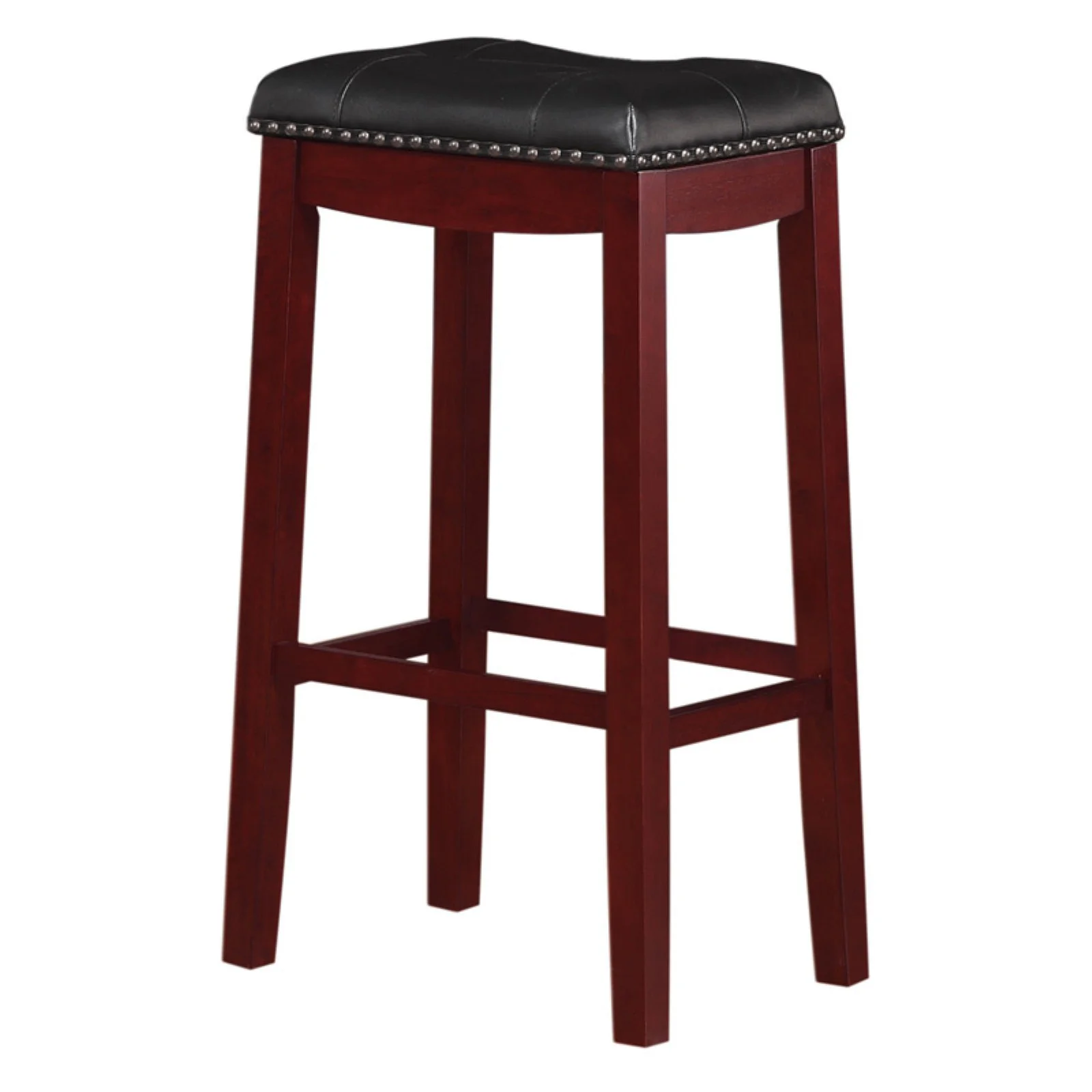 Dimensions: 18.5W x 13.37D x 29H in Sturdy wood frame Foam cushioned faux leather seat Your choice of available finish Saddle seat design Nailhead trim Suitable for residential use