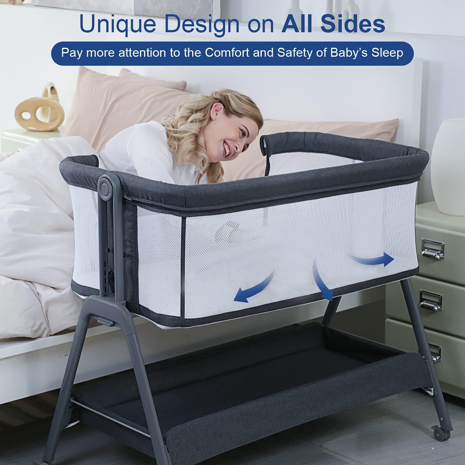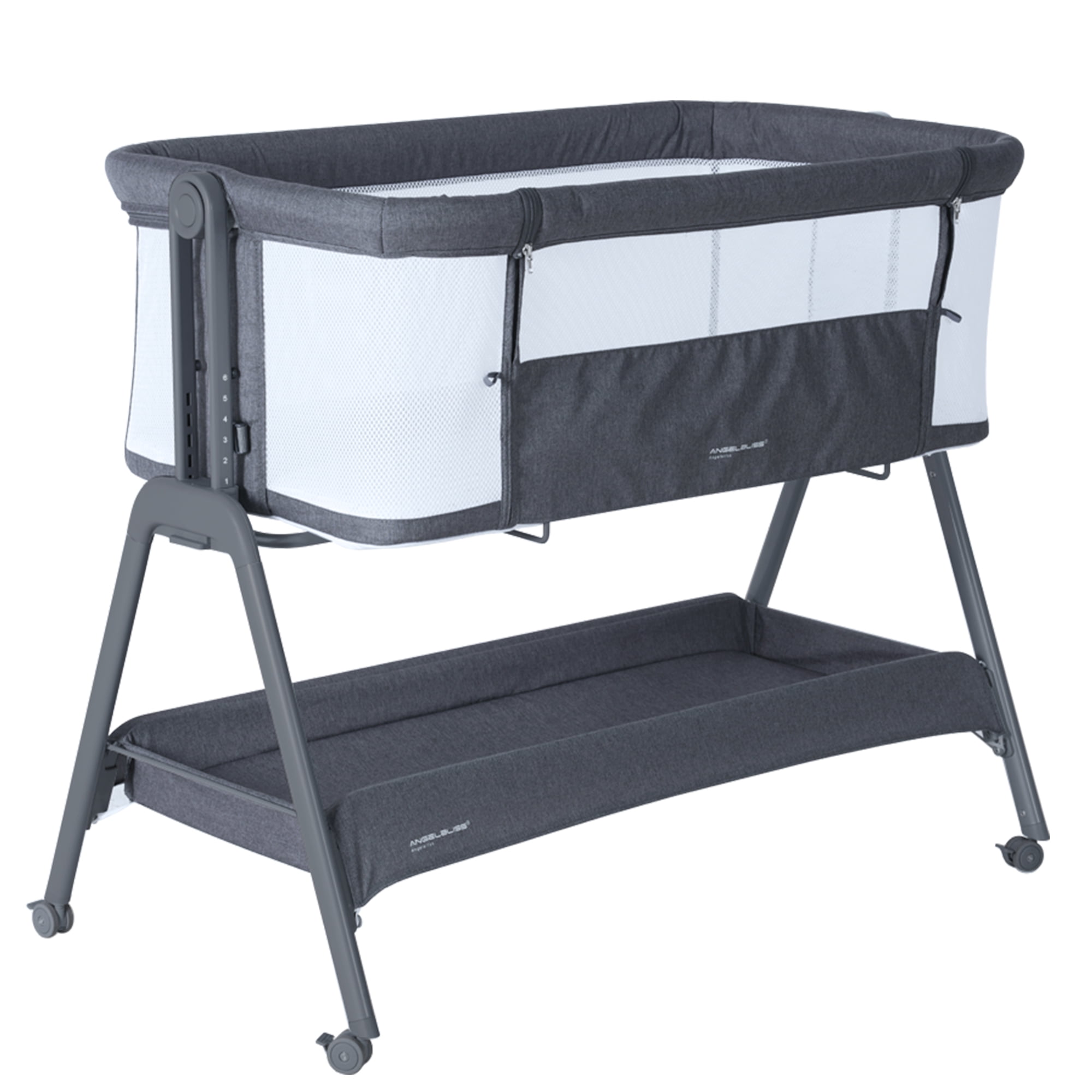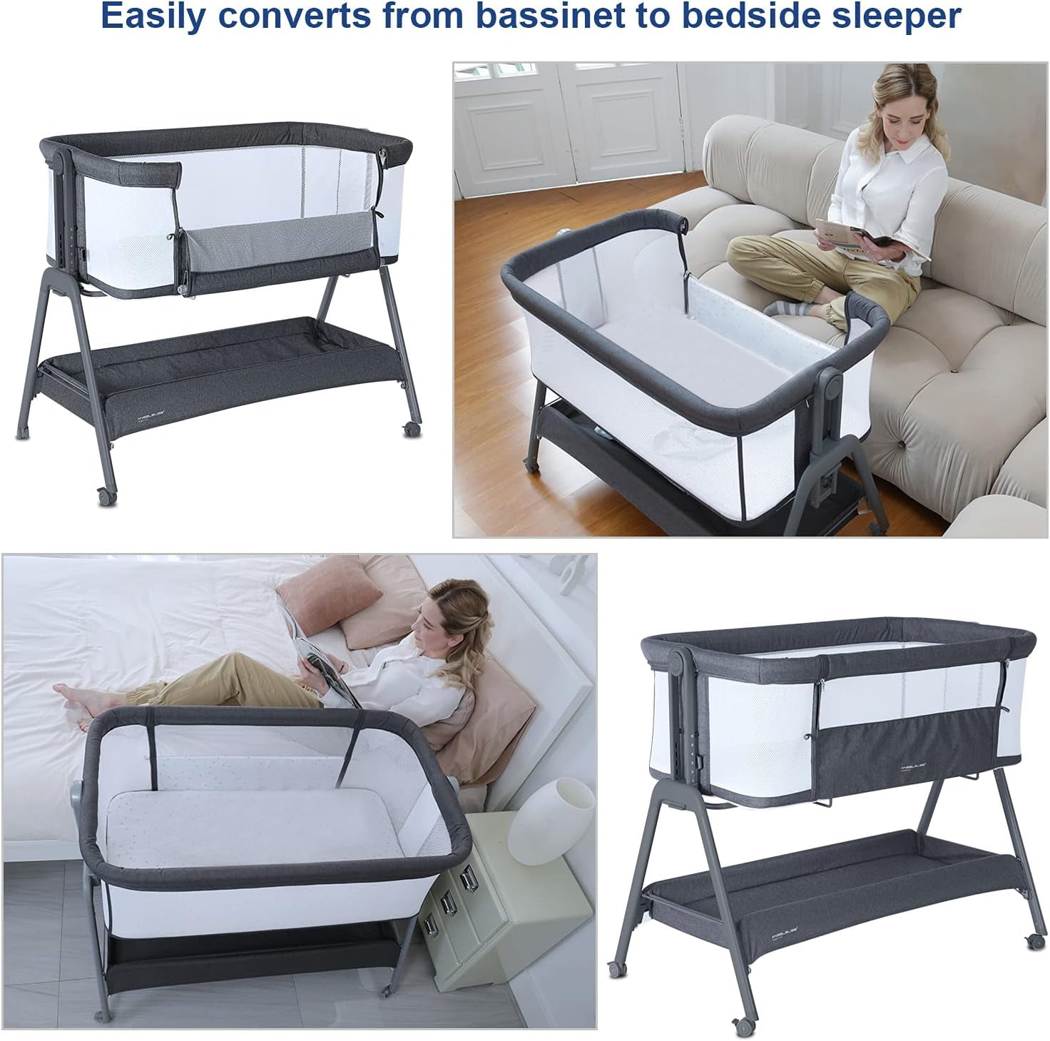 【ANGELBLISS Bassinets Bedside Sleeper】Convert it to a unisex black bedside crib by unlatching the sidebar, perfect fo breastfeeding mom at night. 【Portable Bassinet】With tool-free assembly design, ANGELBLISS standalone bassinet can be used anywhere that your little one wants to sleep. 【Bassinet with Storage Basket】The extra-large Storage Basket is easy to access and holds all of baby’s essentials making sure all is within arms-reach. 【Breathable Bassinet Mattress】Comes with a Removable Fabric and Mattress for easy cleaning. Provides a healthy and safe sleeping area for your child. 【Four-Wheel Drive】Four Wheels with breaks enable rolling safely and smoothly without hurting the floor.