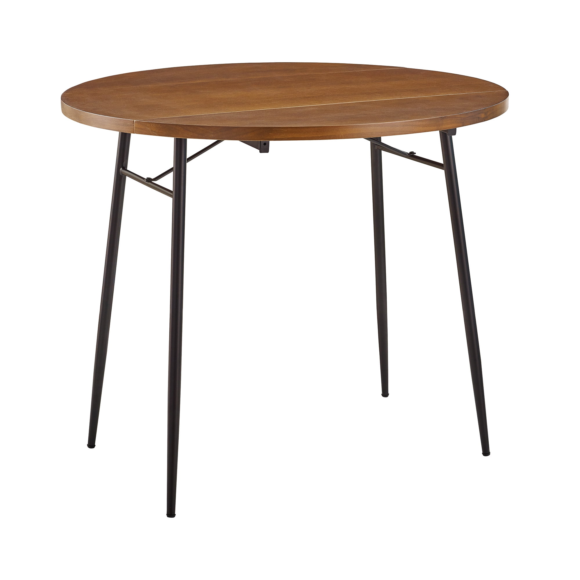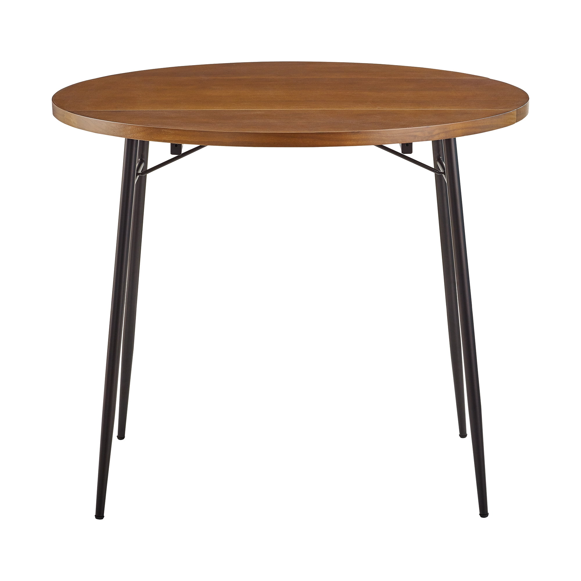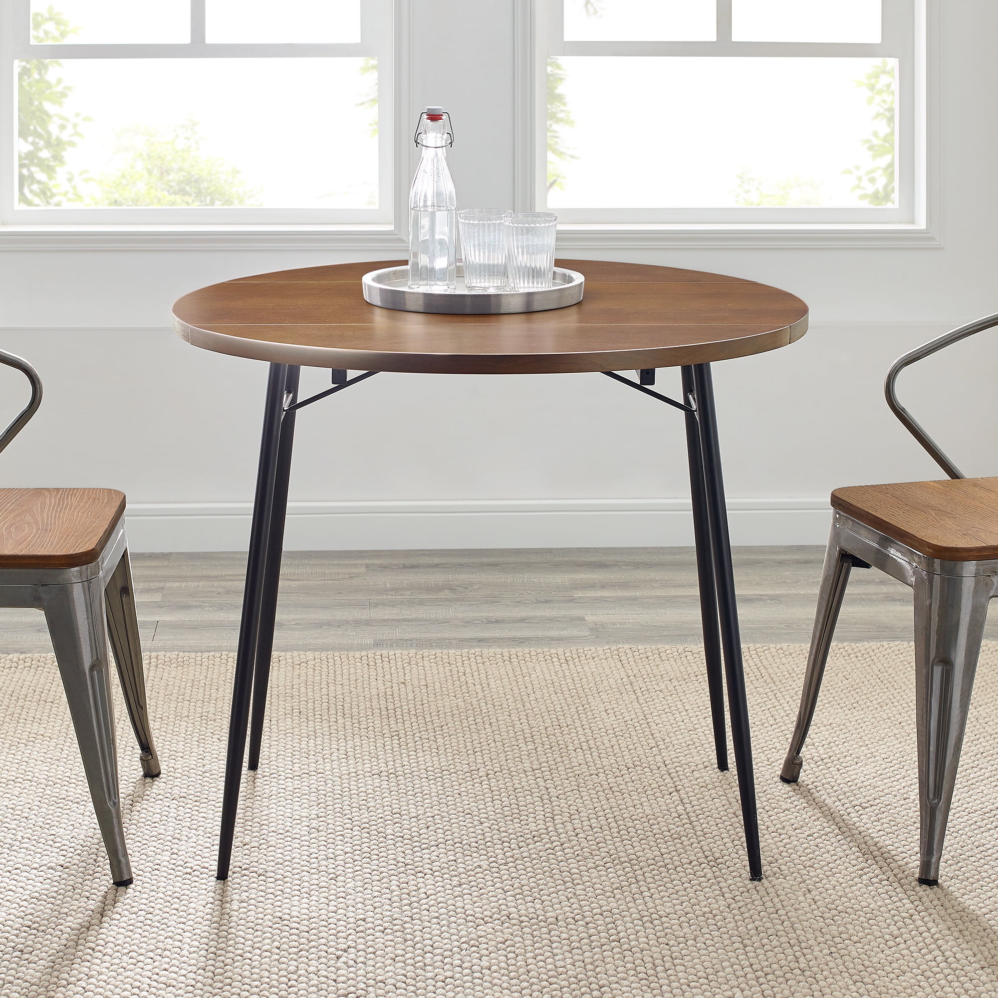 Manor Park Modern Round Drop Leaf Dark Walnut Dining Table Packaged Dimensions: 4.75” H x 35.5” L x 35.5” W Assembled Dimensions: 30” H x 35.5” L x 35.5” W Materials: Warp-resistant MDF, durable laminate with matte UV coating, and powder-coated steel Assembly: Simple step-by-step assembly required Dark walnut finish Modern glam dining table Round tabletop Metal tapered legs with adjustable feet Double drop leaf sides for easy transitioning Small space friendly Seats 2-3 people UV coating offers a protective layer to tabletop