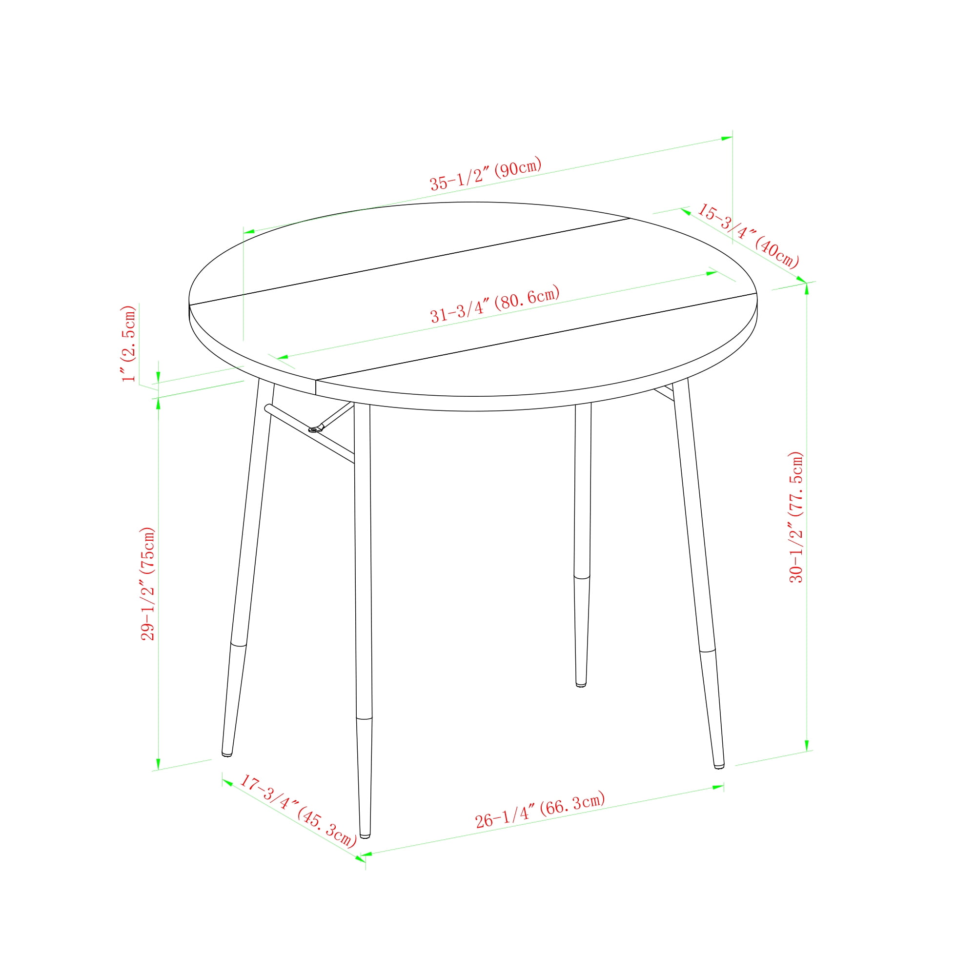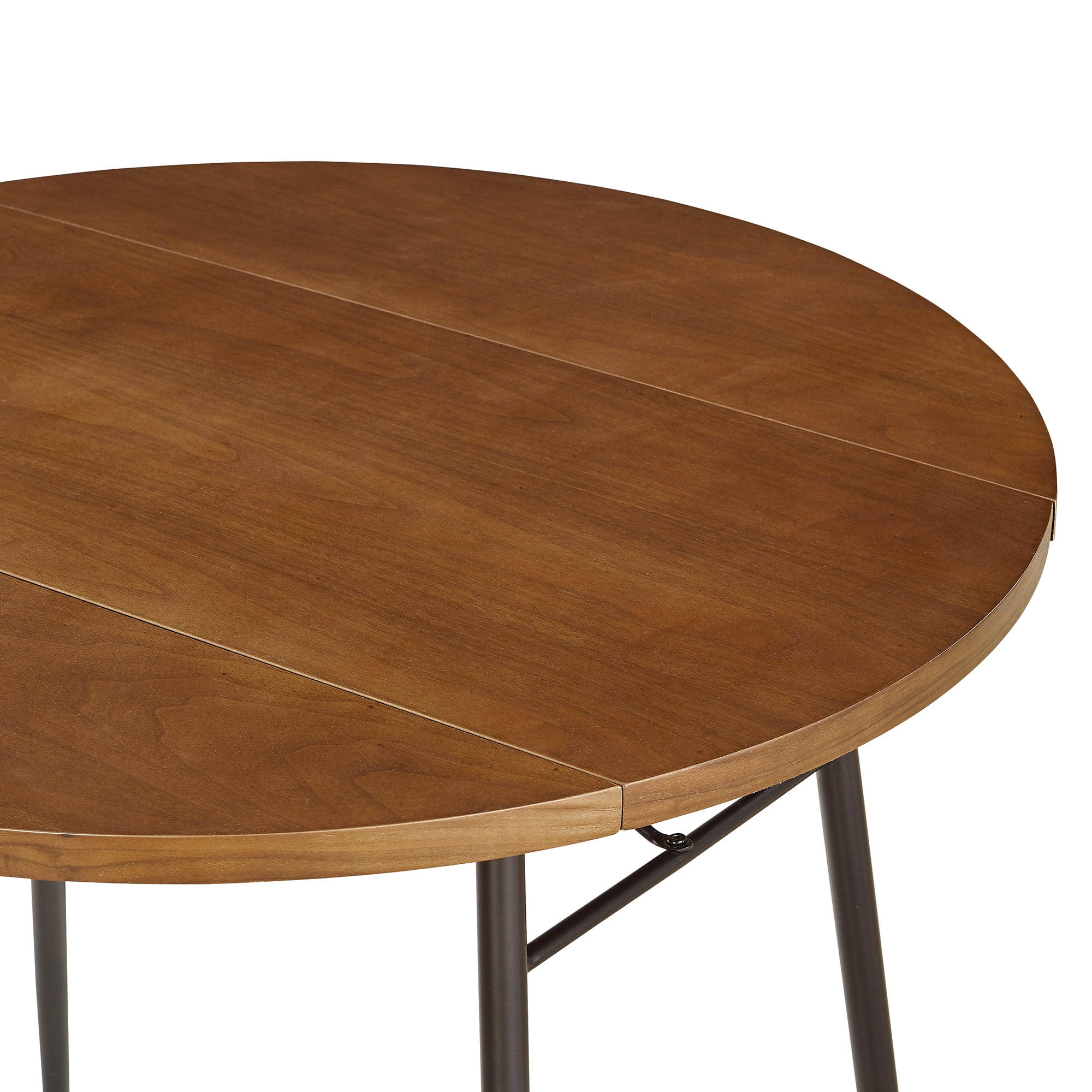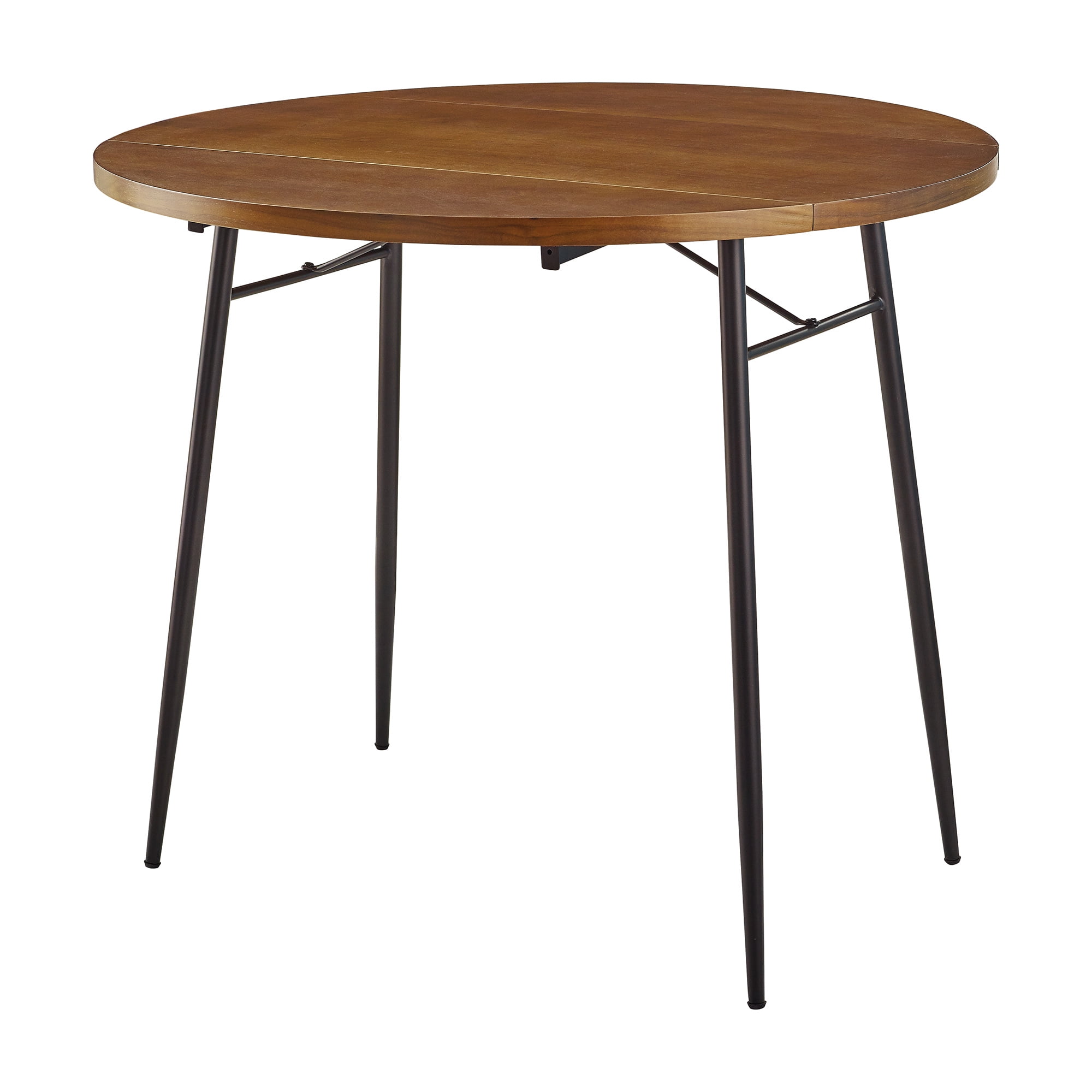 Manor Park Modern Round Drop Leaf Dark Walnut Dining Table Packaged Dimensions: 4.75” H x 35.5” L x 35.5” W Assembled Dimensions: 30” H x 35.5” L x 35.5” W Materials: Warp-resistant MDF, durable laminate with matte UV coating, and powder-coated steel Assembly: Simple step-by-step assembly required Dark walnut finish Modern glam dining table Round tabletop Metal tapered legs with adjustable feet Double drop leaf sides for easy transitioning Small space friendly Seats 2-3 people UV coating offers a protective layer to tabletop