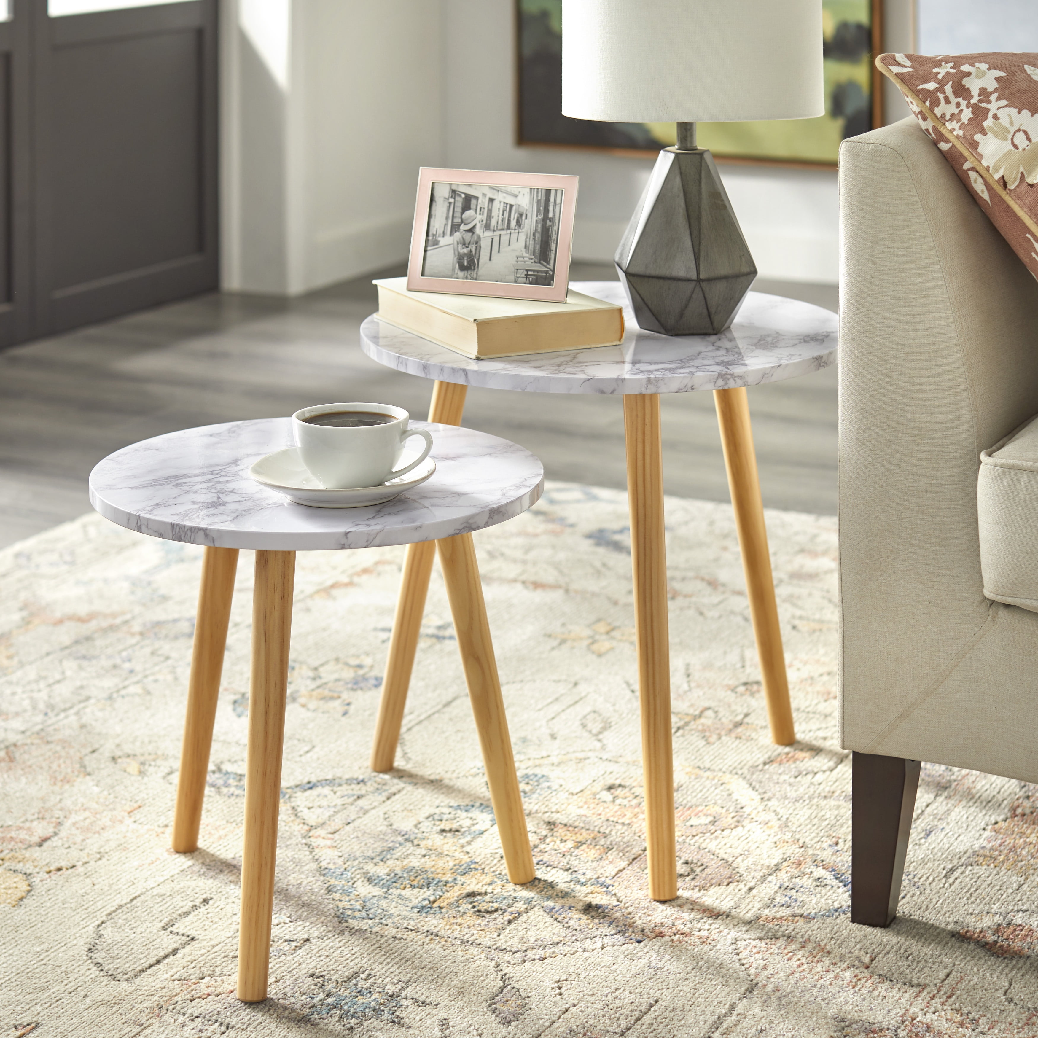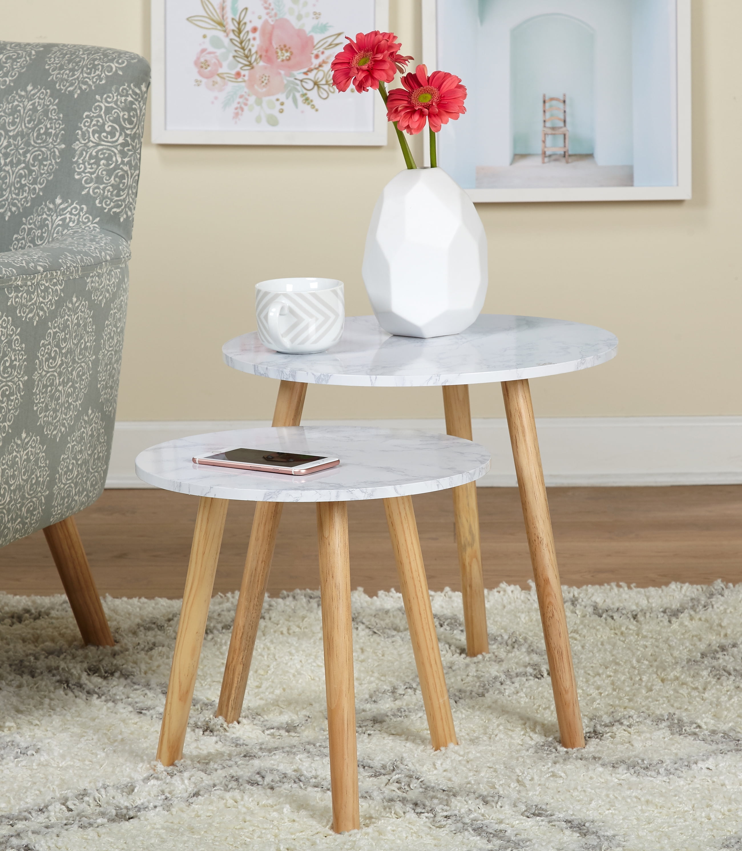 Set of two modern nesting tables with faux marble tops Grey and white marble-like finish adds elegant flair Mid-century-inspired angled legs with natural wood finish Use together for extra surface space or nest to save room Ideal for living rooms, apartments, or small spaces Compact, functional design with eye-catching style Constructed from durable materials for everyday use Easy to move, store, and pair with other accent furniture For indoor use only