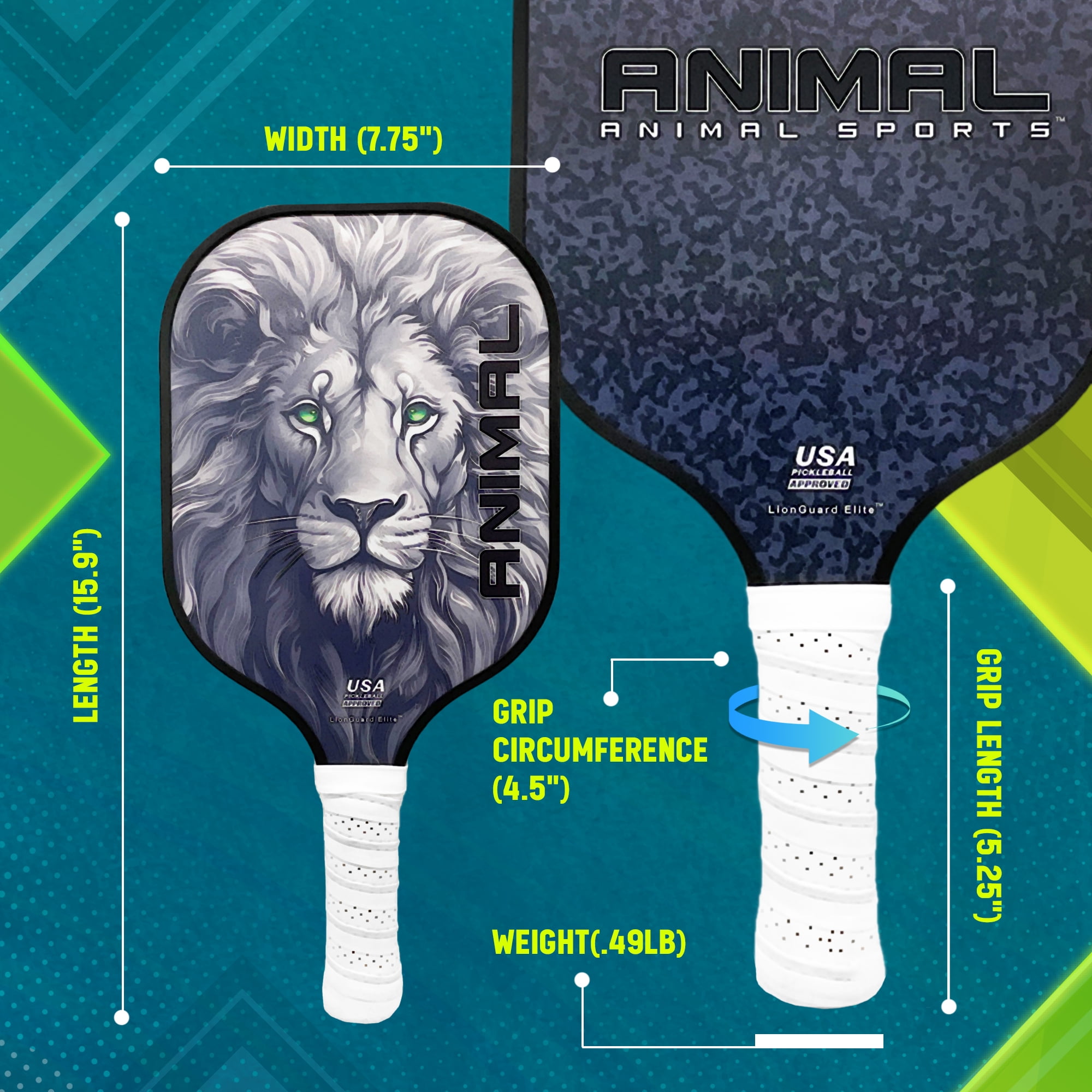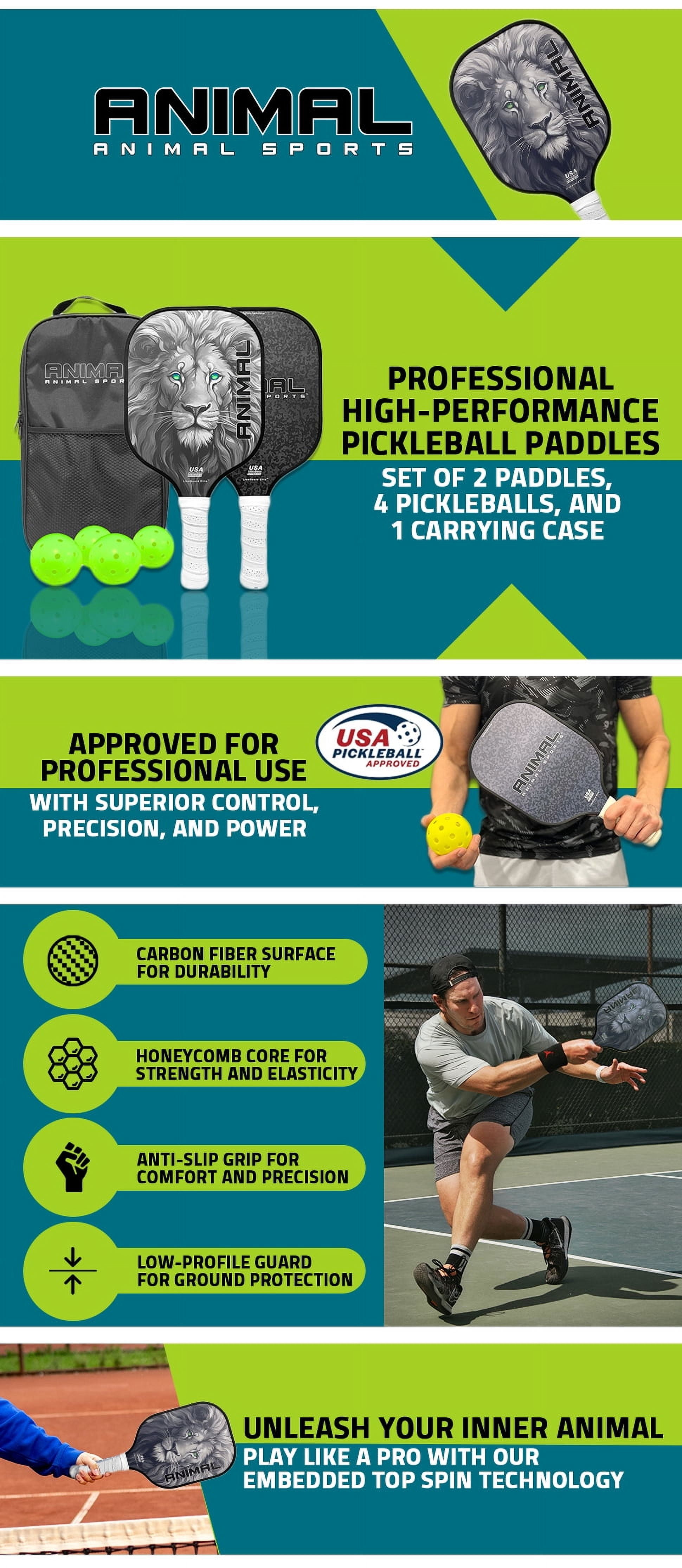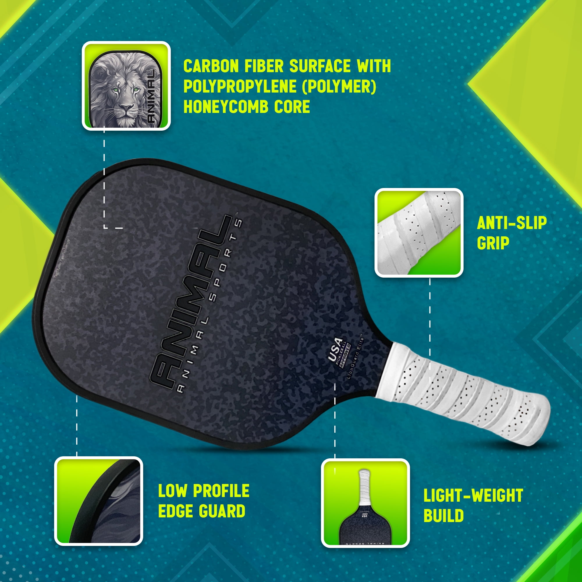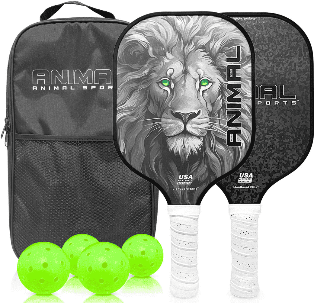 Elevate your pickleball game with the Animal Sports LionGaurd Elite Pickleball Paddle Set, featuring a high-performance carbon fiber surface and lightweight polymer honeycomb core for unparalleled strength and durability. This set includes 2 premium pickleball paddles, a carrying case, and 4 pickleballs, making it the perfect all-in-one solution for players of all skill levels, from beginners to professionals. Designed with an ergonomic, non-slip grip, these paddles offer superior control, precision, and power, allowing you to dominate the court with every swing. The advanced topspin technology on the carbon fiber surface gives you unmatched spin control, helping you execute powerful and precise shots with ease. Approved by the USAPA, these paddles meet the highest standards of performance and quality, ensuring you can trust in their authenticity and reliability, whether you’re playing casually or competing in tournaments.