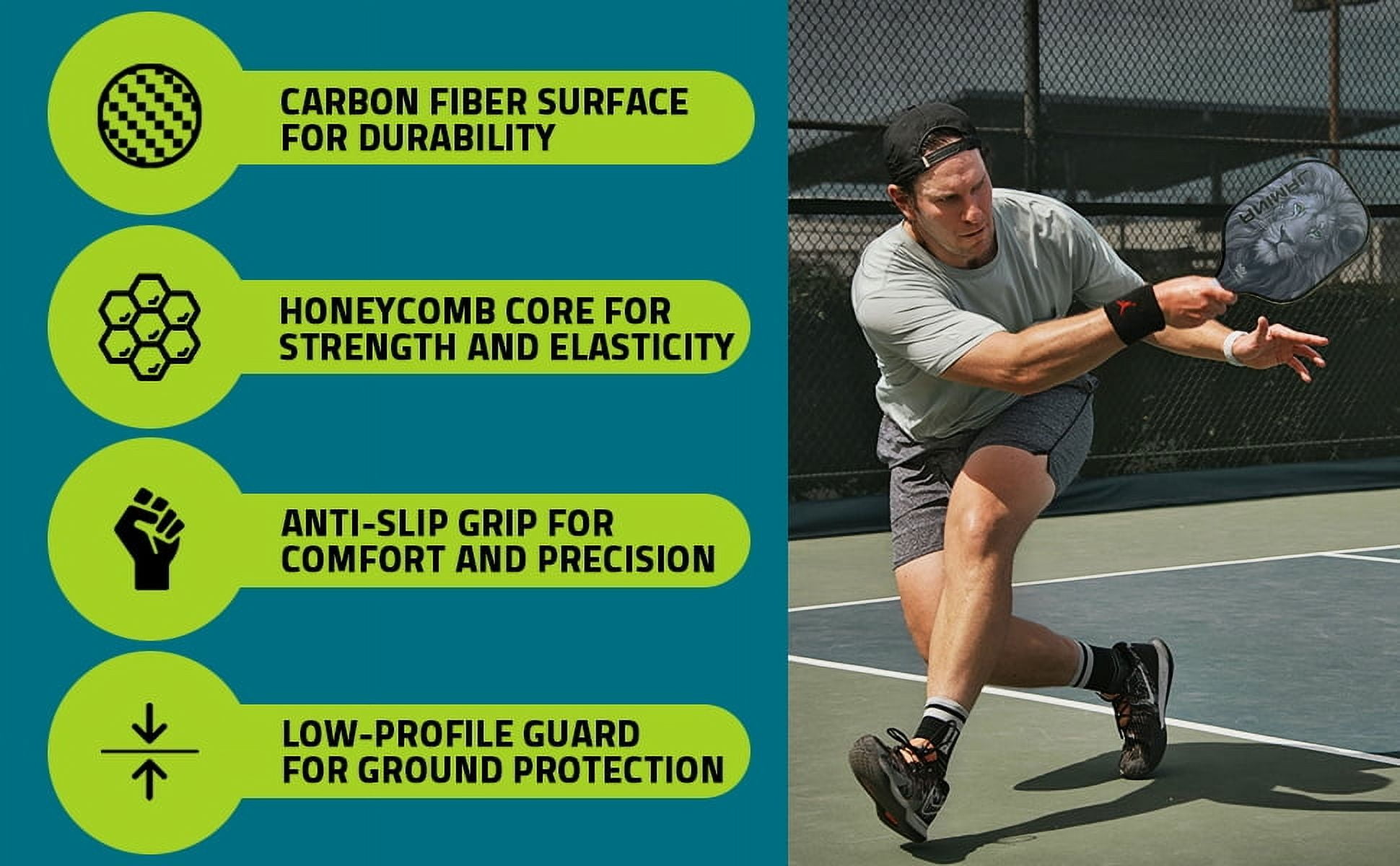Unleash your full potential with the Animal Sports LionGaurd Elite pickleball paddle set! These paddles are sure to be your eye-catching secret weapon on the court. With our proprietary topspin surface technology, you’ll leave opponents astounded with your new competitive edge! ANIMAL SPORTS LIONGAURD ELITE PICKLE BALL PADDLE SET – It doesn’t matter if you are a beginner, amateur, or professional as our pickleball racket set is a perfectly balanced bundle for all skill levels! – You can experience the true performance of a professional paddle that will provide you with superior shot control and precision, while also helping you hit the ball faster and with more power. – Featuring a carbon fiber surface with a polymer honeycomb core, this paddle is built for strength and durability, offering you a sturdy option. – Elevate your game with the same cutting-edge technology used by the pros with this paddle that is sure to take your top spin game to a different level, offering you unmatched spin control. – The overall ergonomic build makes this paddle extremely comfortable to grip in your hands, is non-slip, and will offer you an ultimate handling experience. – Surprise your favorite pickleball player with the ultimate upgrade with this pickleball paddle set that is sure to make a wonderful present for every festive and non-festive occasion. WE OFFER A 100% CUSTOMER SATISFACTION GUARANTEE ON YOUR EVERY PURCHASE WITH US! All our products are manufactured using durable and lightweight materials, in facilities adhering to strict compliance and stringent quality standards. So, what are you waiting for? Hurry up and order now to upgrade your pickleball game and conquer the court with this premium pickleball equipment!