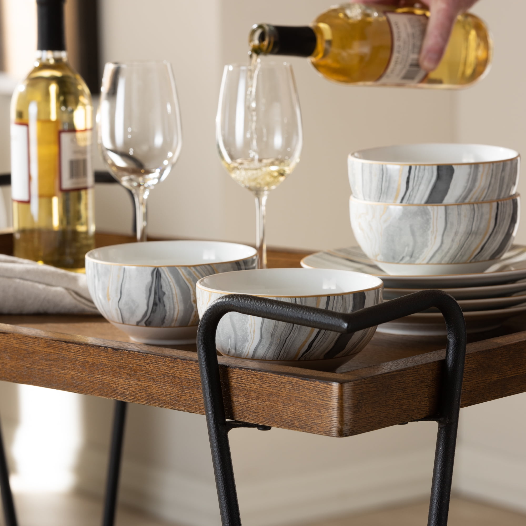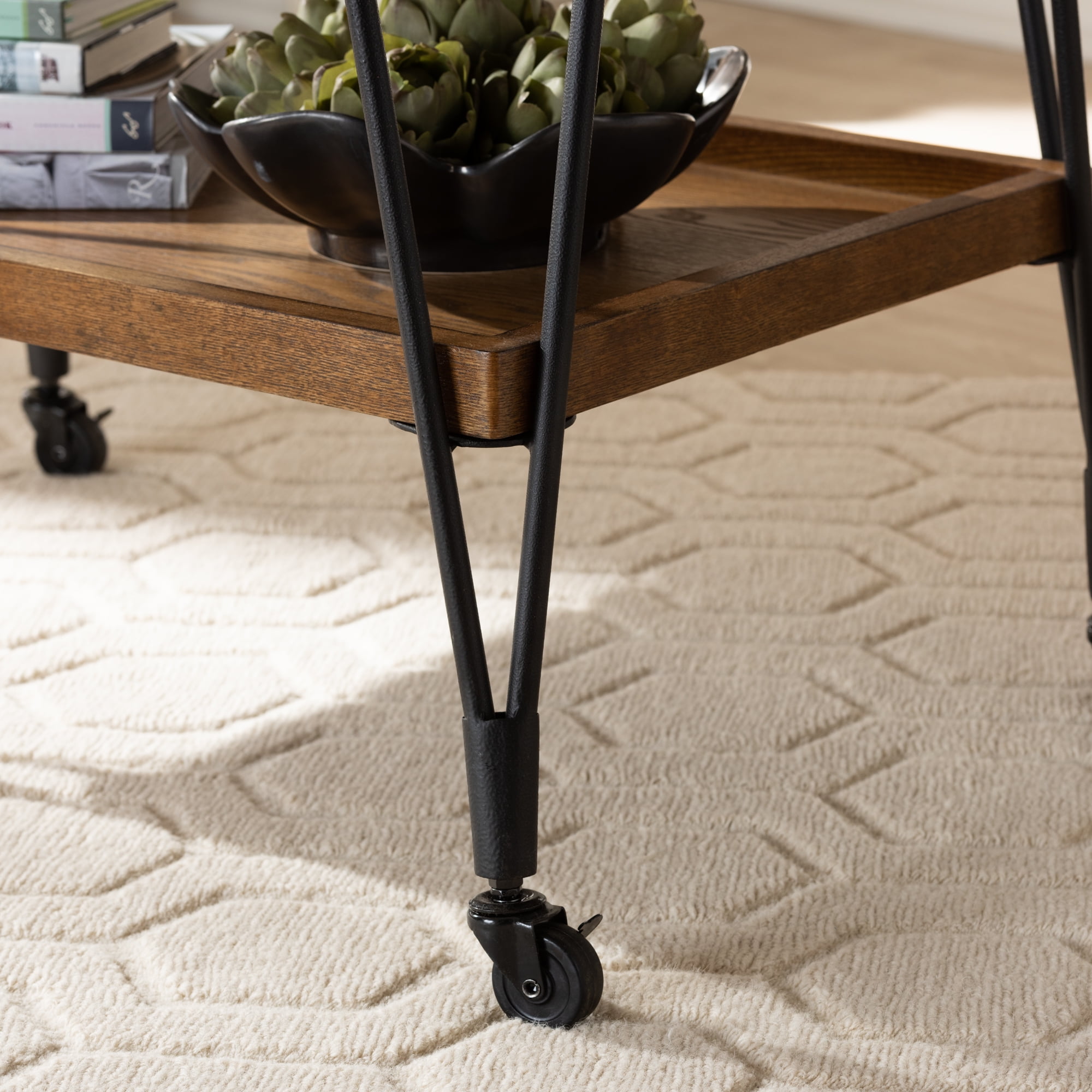 River Street Designs Annika Textured Metal and Wood Bar Cart Two open shelves Ample space for wine glass, wine bottles and utensils Castor wheels include safety locks Antique Black Textured Finish Metal and Distressed Ash Wood