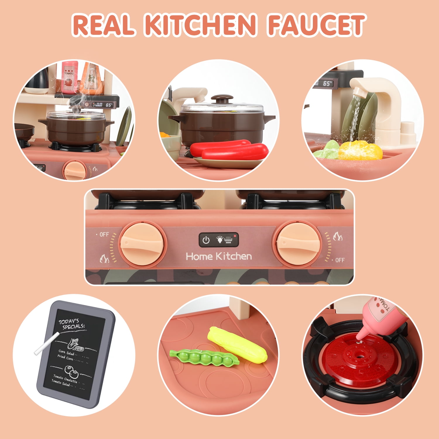 Multifunctional Toy Kitchen Sets: Anpro Kitchen Sets Toys includes toy sink, cooking playset with mini pot and pan, with Realistic Lights & Sounds, Simulation of Spray, microwave oven and other accessories. Has everything children need to get their toy kitchen up and running for which add to the fun of the game and perfectly simulate the real Kitchen Toys.(requires 3 AA batteries not included) Water Circulation System: Anpro kitchen toy set has a faucet with a water circulation system, Water will flow out when you press the faucet. Children can wash vegetables, fruits, tableware and other accessories in the sink. Your children can store all the kitchen accessories after playing, it will develop the habit of organizing things and keeps the room tidy, improve children’s hands-on ability and sense of responsibility. Fun & Educational Electronic Kitchen Toy: The Kitchen Playset with light and music, along with the cooking sound and realistic light, press the switch, the induction cooker will emit simulated sounds and lights, Steam effect with simulated spray, it can increase the realistic cooking effect when children are playing. Your little ones can learn to identify the colors and names of food toy by playing the matching food game. Mini Blackboard & Safe Quality: The kitchen playset made of durable plastic that will withstand endless hours of delightful play. comes with 1 Chalk Eraser and 2 Chalk Sticks, which is convenient for you and your children to record some nouns or draw graphics. Safe, nontoxic kids’ kitchen toy set is safe for kids ages 3 years Plus. Best Gift Choice: Cooking chef role play, pretend play, educational toy, early learning toy. Best gift choice for Christmas, birthday party, festival, holiday, Kids Intelligent Learning Toys, daily life and more.