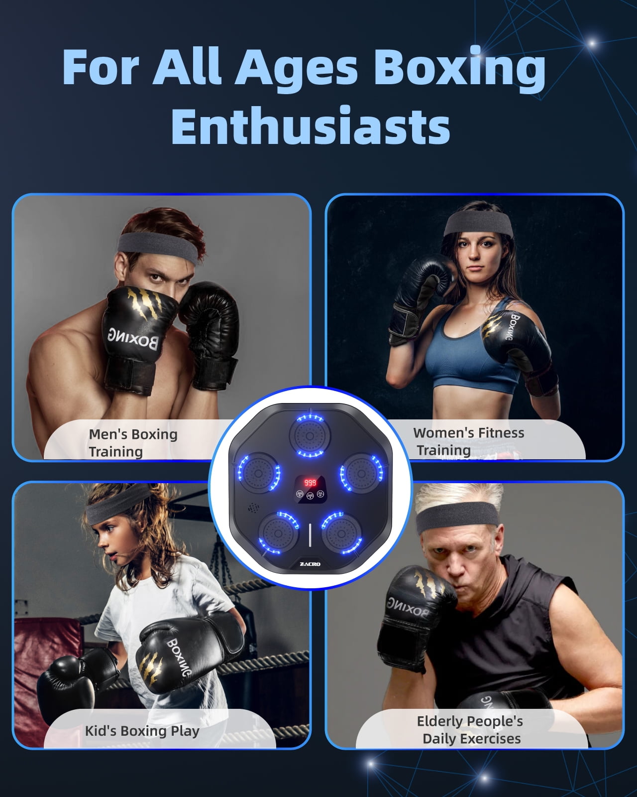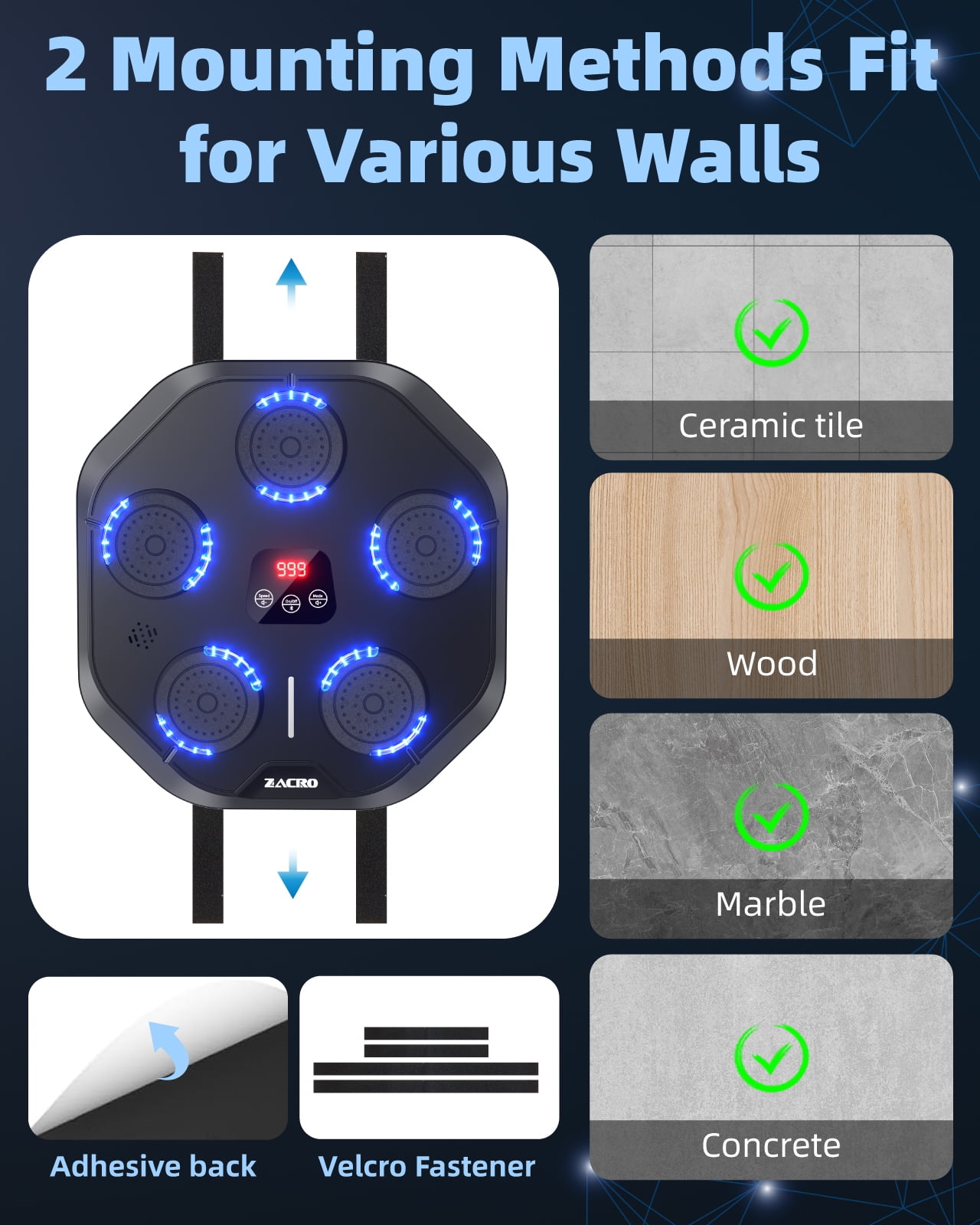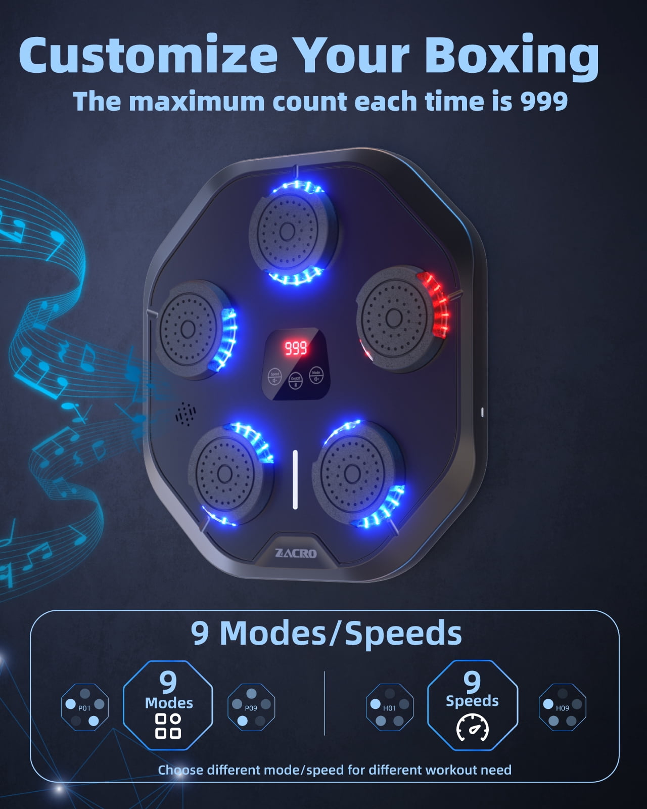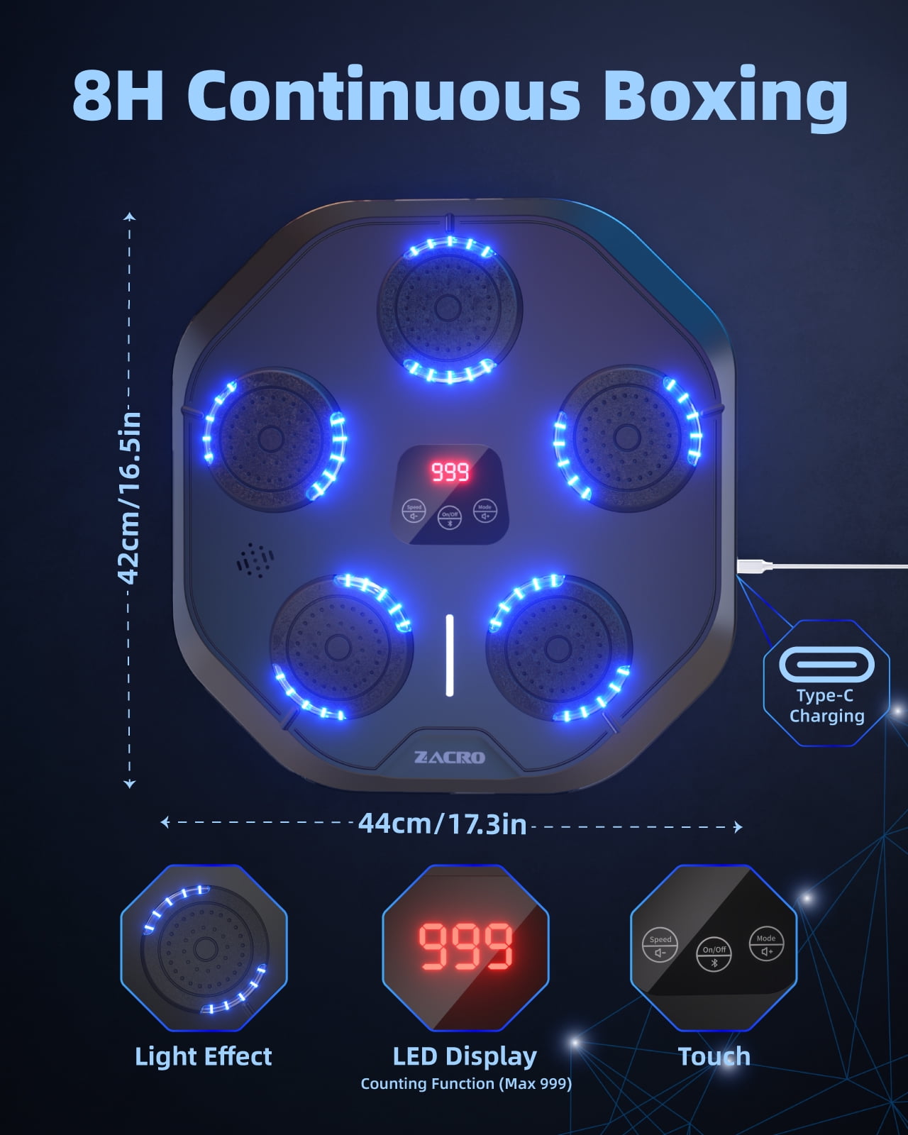 Type-C Charging: Conveniently rechargeable via Type-C port, ensuring hassle-free power replenishment for uninterrupted workouts. Counting Function: Track your progress effortlessly with the built-in counting feature, keeping you motivated and on target. Display Screen: Stay informed and engaged with the clear display screen, providing real-time feedback and enhancing your training experience. Lighting Effects: Elevate your workout ambiance with captivating lighting effects, immersing you in a dynamic and energizing environment. Versatile Training Modes: With 9 exercise modes and speeds, this Music Punching Trainer cater to all fitness levels. LED indicators and digital counters track progress, improving reaction time and coordination with each punch thrown. Interactive Fitness Fun: Enjoy music-infused boxing workouts with Bluetooth connectivity for personalized playlists. Surround sound and dynamic lighting create an immersive training experience, motivating you to punch your way to fitness. Durable and Safe Design: Constructed with high-density foam, the punching target offers optimal resilience and shock absorption, ensuring hands are protected during intense workouts. Its sleek exterior not only adds style but also simplifies cleaning after use. Personalized Experience: Tailor your workouts with customizable sound adjustments and memory functions. Included gloves and headbands enhance comfort and safety, allowing you to focus on your training without distractions. Space-Saving Installation: Easily mountable with tape or hook & loop straps, the Music Boxing Machine saves space and time, offering gym-quality workouts in the comfort of your home. Say goodbye to expensive gym memberships and hello to convenient, effective fitness solutions.