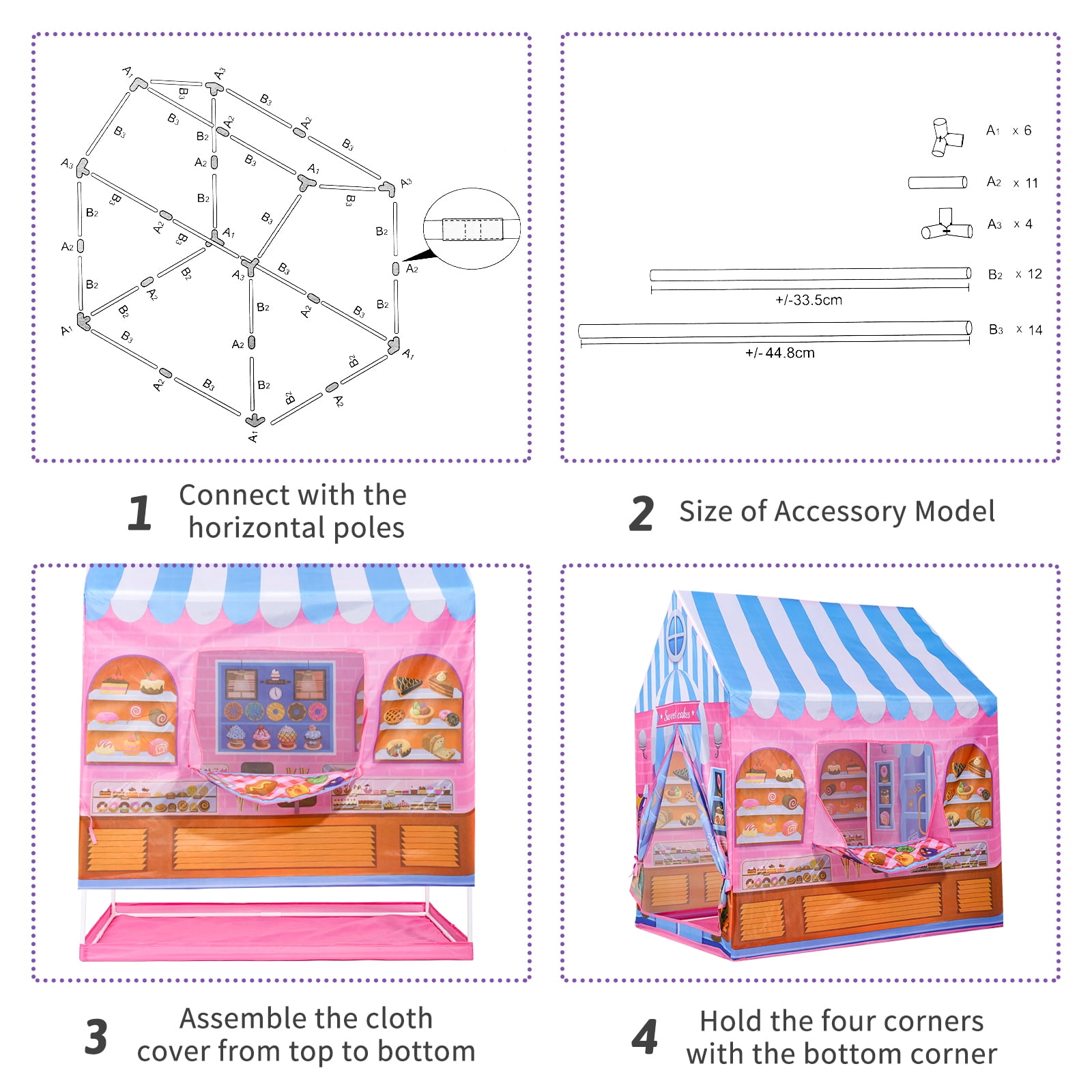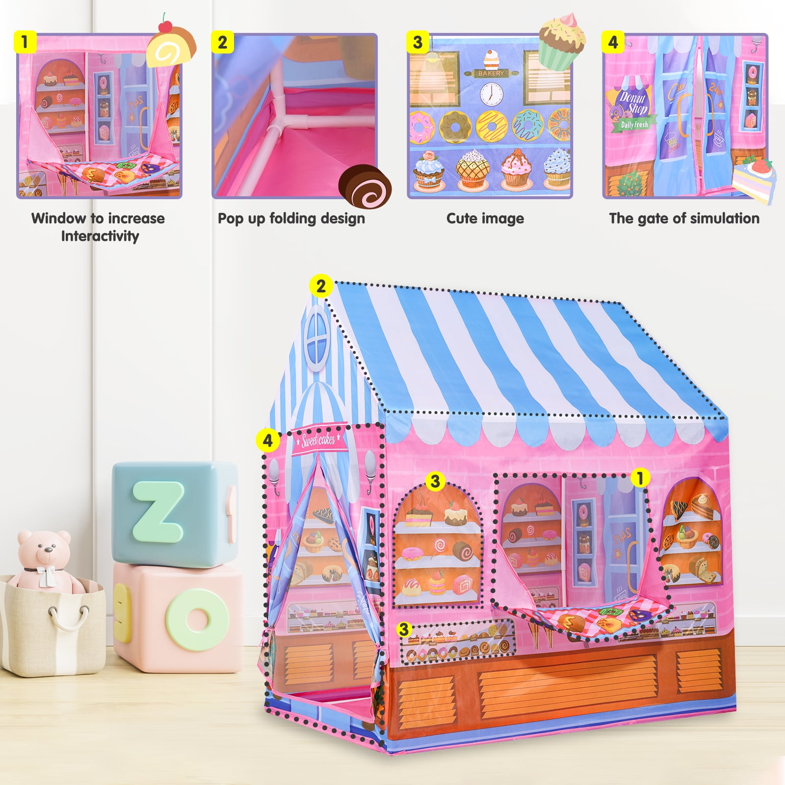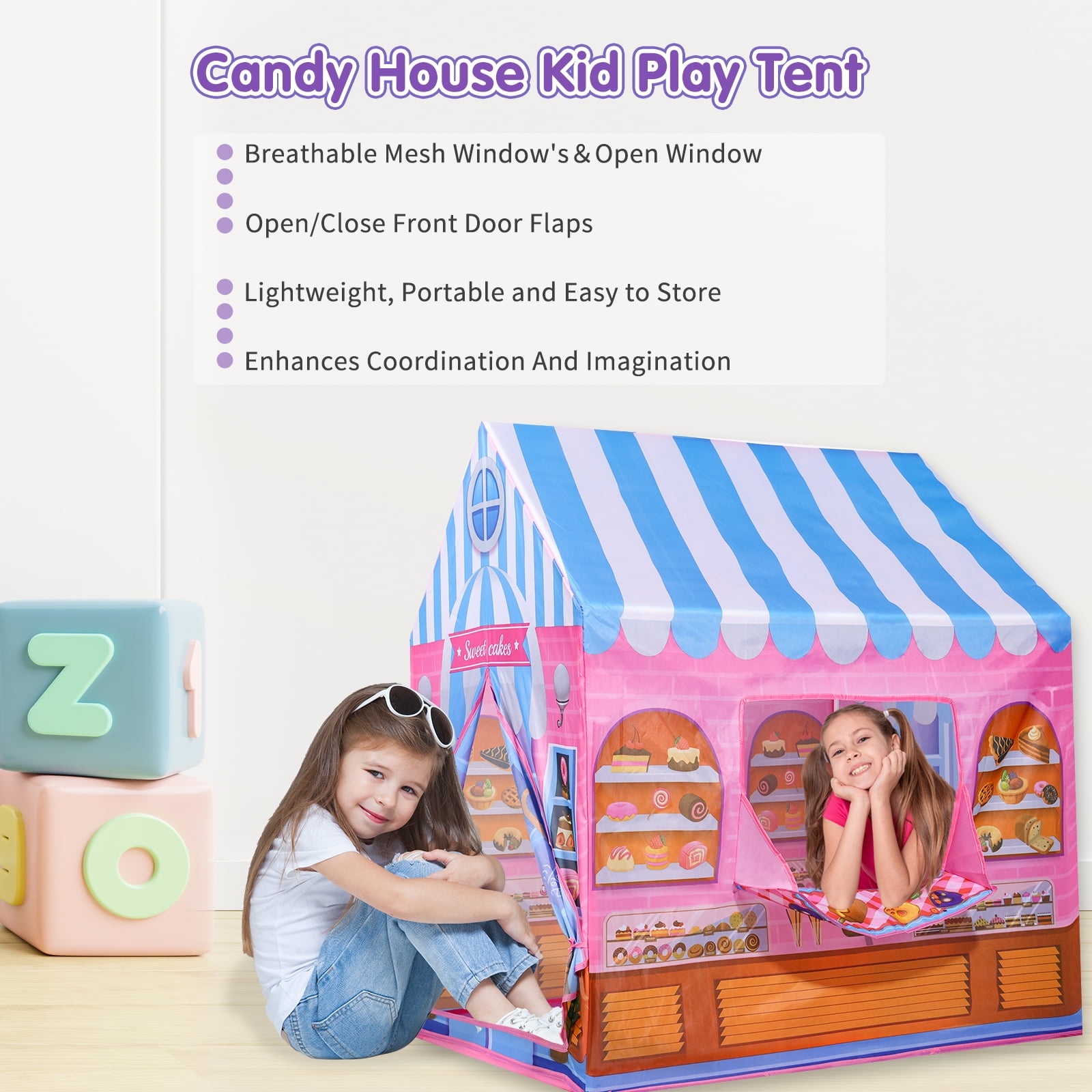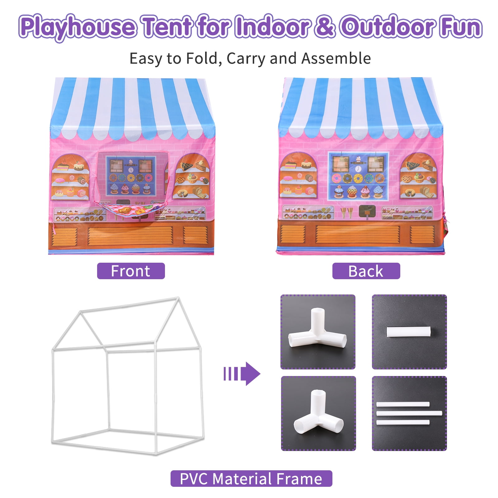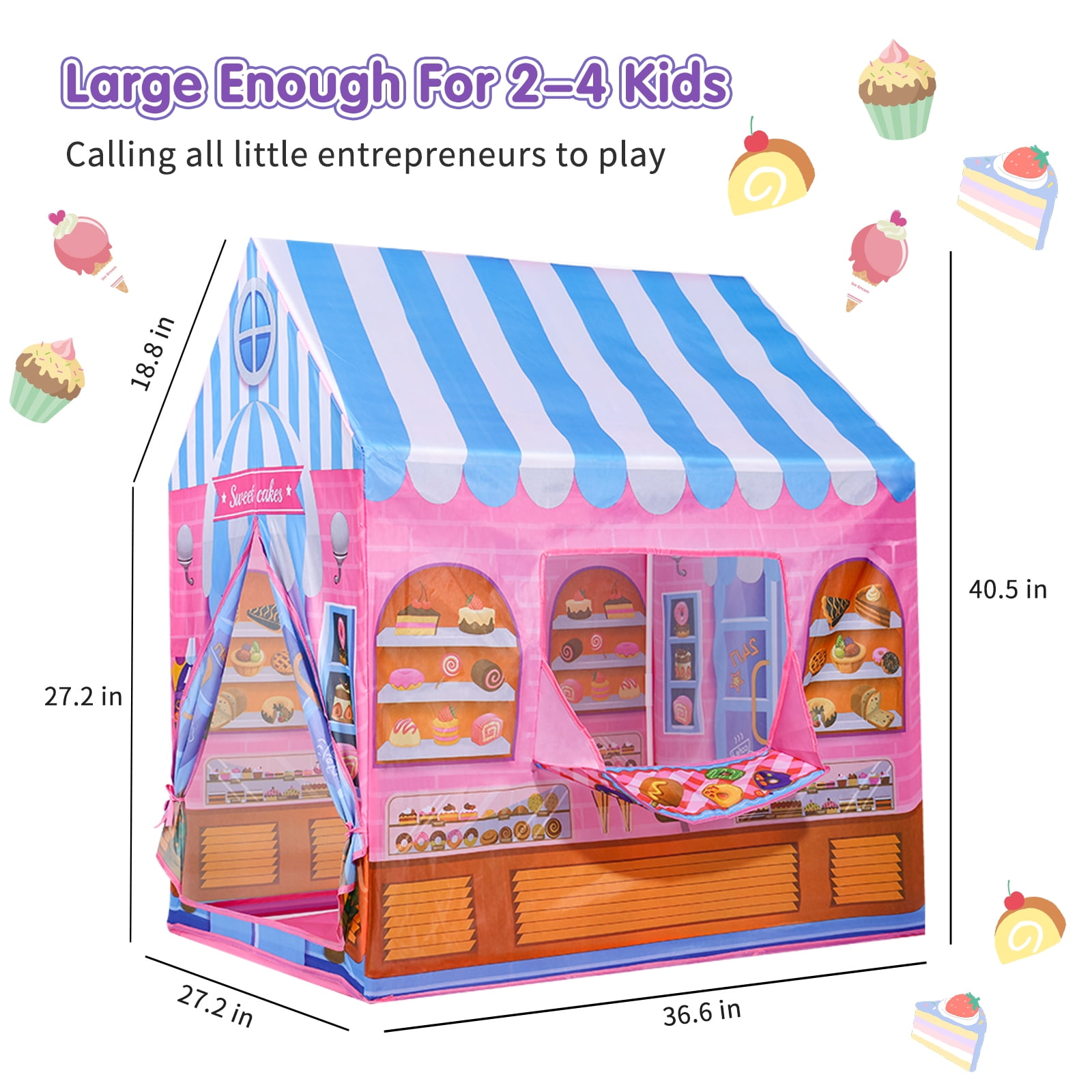 Sweet Candy Store Pop-Up Tent: Timeless Playhouse Get ready for a funny adventure with the Ant Class Sweet Candy Store Pop-Up Tent! Designed to encourage creativity and social play, this interactive playhouse will transport your kids to the world of candy store vendors, complete with nursery rhymes and colorful graphics. Made of sturdy polyester fabric material and reinforced with poles, this tent is built to support your kids’ adventures. Easy to install and carry, it’s perfect for indoor and outdoor playtime. Just twist it open, and the tent pops right up. Watch your kids’ imagination come to life! Features: Realistic Design – A playhouse that will transport your child to a sweet wonderland, Sweet candy store is painted in pink with realistic bakery and candy graphics. Plus, it has an ordering and serving window, perfect for role-playing among kids. Spacious Interior – With dimensions of 36 x 28 x 40 inches, this tent promises a thrilling and one-of-a-kind playtime adventure for your children. Boasting dual-top openings and mesh front window for ventilation and a rear flap door for easy entry and plenty of room for your kids to play. Pop-Up Technology – Featuring a straightforward pop-up design that requires no tools to assemble, you can get the fun started in no time. Plus, when playtime is over, the tent’s effortless fold-up design and compact carry bag make it a convenient storage solution for indoor playtime. Travel Buddy – Take the fun on the road with the Sweet Candy Store Pop Up Tent – your ultimate travel buddy! Its lightweight and compact design makes it easy to pack in your car trunk, while its durable materials can withstand any adventure – at the beach or in the park. Surely, it will keep your little ones entertained no matter where you go! Specifications: Material: Polyester Style: Candy House Theme: Kids Play Tents Age Range (Description): Toddler; Kid Assembly Required: No