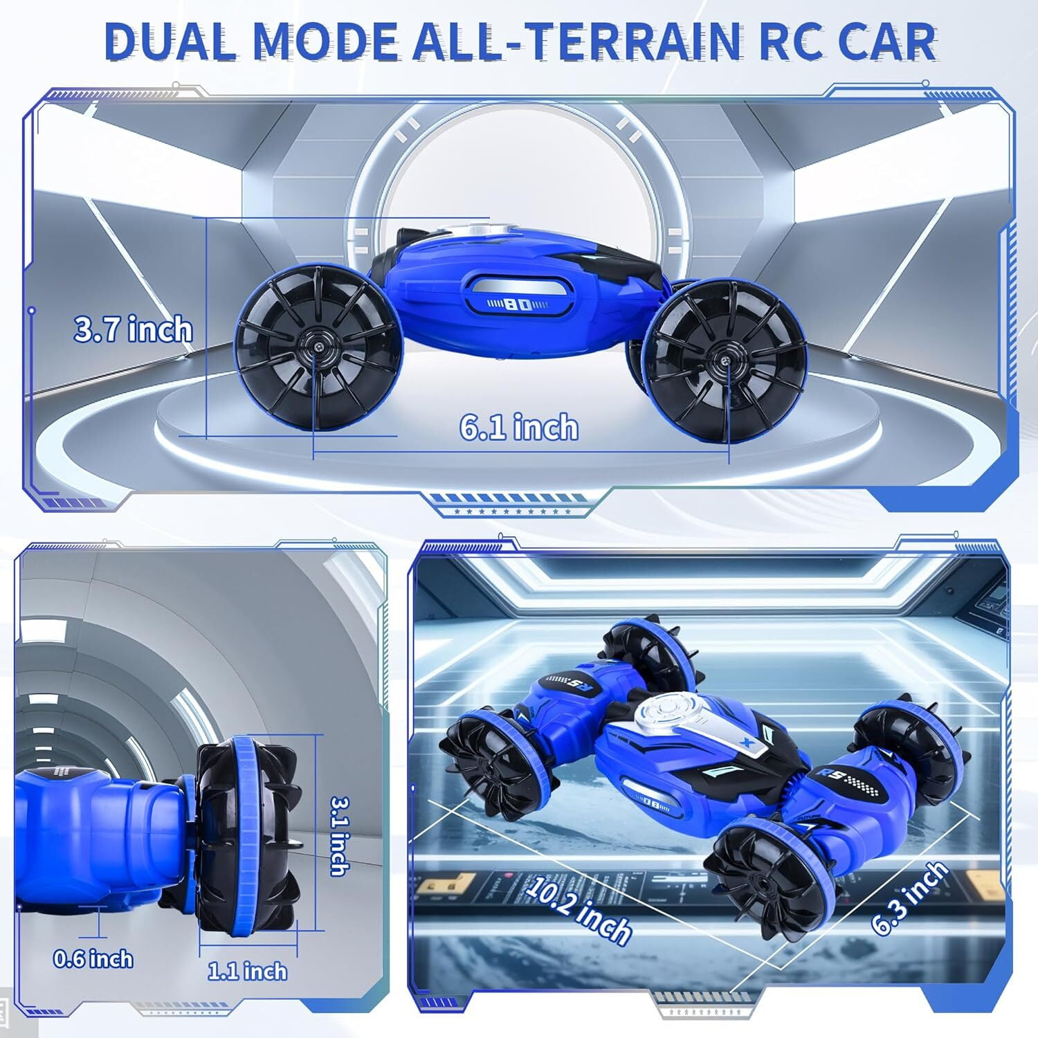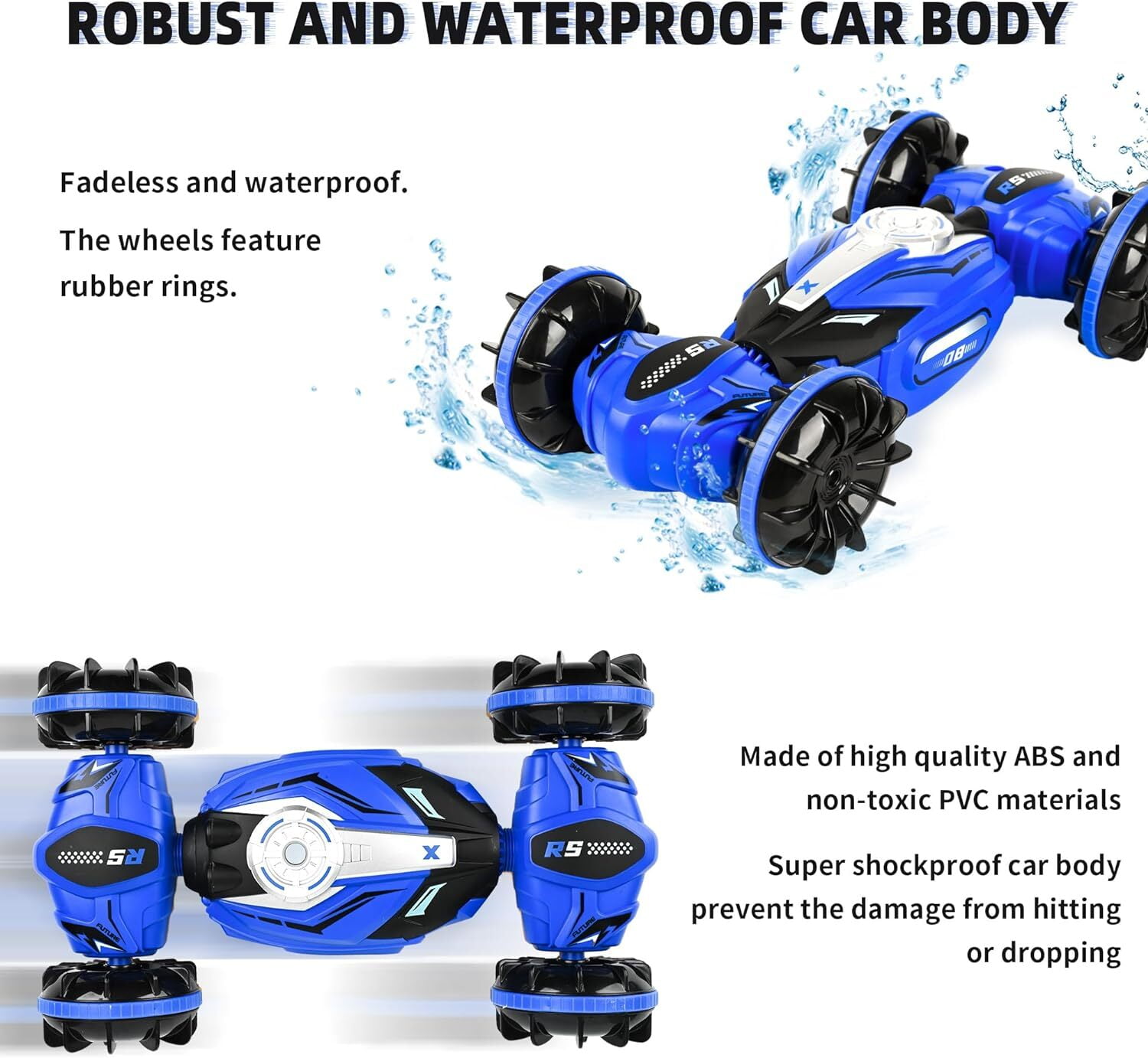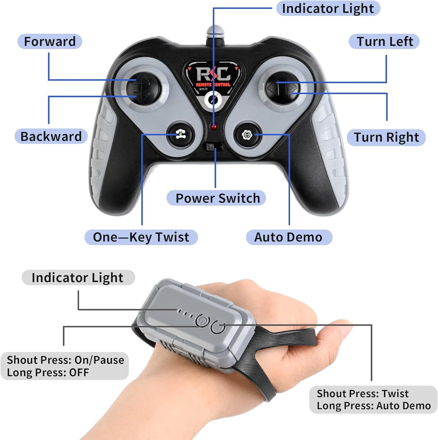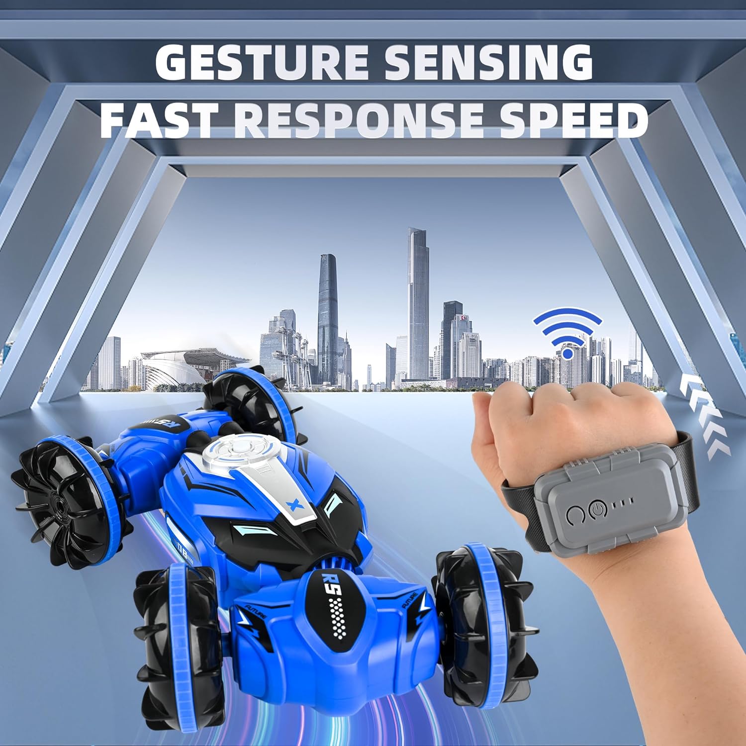 [Dual Controllers Anti-Interference RC Car]: It is easy to control our gesture sensing rc stunt car by wearing a gesture-sensing watch and give a hand gesture or by a 2.4GHz ordinary remote controller which guarantees a long pairing distance within 50 m/164 feet without interference. Both of them ensure kids can enjoy more driving pleasure. [Cool Full-Featured RC Stunt Car]: Our 4WD hand controlled rc car can switch between on-road and off-road dual modes, one-key deformation, omnidirectional movement, even sideways drift, 360° double sided rotation, climb hills in 45° increments, multi-angle flexible body twist, etc., give unprecedented operating experience and unlimited fun to girls and boys 8-12. [Stunning Light & Music Device Gesture RC Cars]: Ant Class hand controlled remote control car has shocking lighting effects and music. Light&music effects bring wonderful operation experience and visual effects, cool functions and unlimited fun to kids. Let your children enjoy this gesture sensing rc stunt car with light & music during day and night without the limitations of darkness and distance! [Durable & Shockproof & Shatterproof Stunt Car]: The hand remote control car is made of durable ABS plastic and high-quality metal, equipped with unique roller traction tires. Those rc car increased impact resistance, shock and shatterproof, equipped with powerful motor. The durable gesture sensing twist car is suitable for different areas such as grassland, sandy land, rugged mountain roads, etc.and easily overcomes various obstacles, which brings your kids a different playing experience. [Hand Sensor Remote Control Car is A Great and Cool Gifts for Kids]: Ant Class rc stunt car gesture sensing will be the ideal stunt vehicle gift for girls or boys 8-12. Hand remote control car with wonderful design and cool features, which suitable for children over 6 years for old indoor and outdoor play. Remote control car is the perfect gift for your child’s birthday, Christmas and New Years.