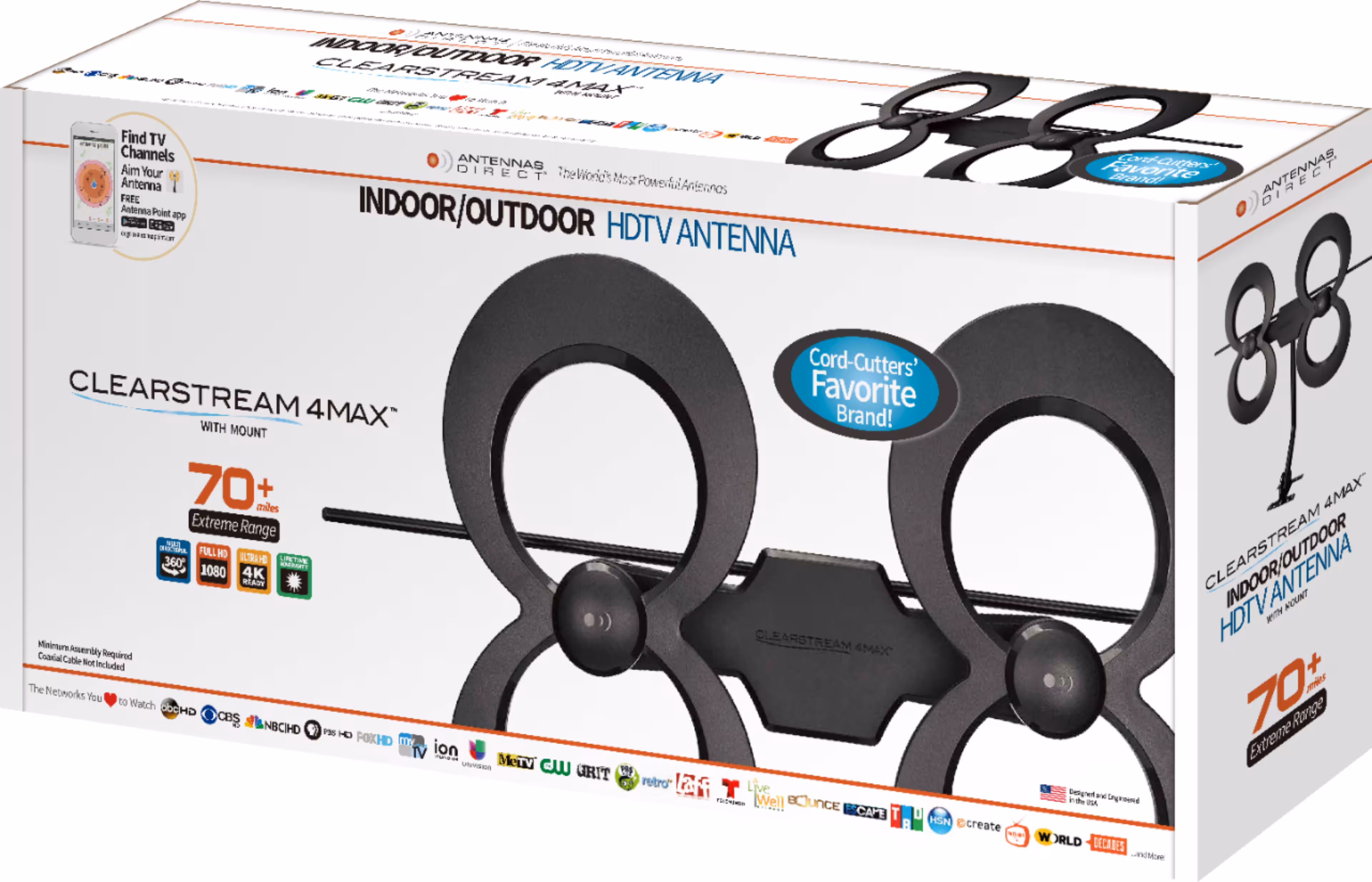 Watch HD channels over the air with this Antennas Direct ClearStream 4MAX antenna. This long-range attic/outdoor TV antenna has quick-connect assembly that makes setup easy. It receives TV signals from over 70 miles away, and its multi-directional UHF and Hi-VHF configurations provide optimal reception without having to aim it. The ClearStream 4MAX is whole-home ready and connects with existing satellite or a cable provider’s wiring to deliver the antenna’s signal to all your TVs. There are also many advantages to an outdoor TV antenna over an indoor antenna. An outdoor antenna will have fewer obstructions and less interference (noise) from electronics devices inside your home. This Antennas Direct ClearStream 4MAX antenna includes a 20-inch mast with a pivoting base to allow for installations on horizontal or vertical surfaces like a roof, fascia, or attic. Note: the range of this antenna will vary greatly depending on the height, power, and frequency coming from the TV tower, as well as the height of the antenna installation, the terrain and obstacles between your home and the broadcast towers.