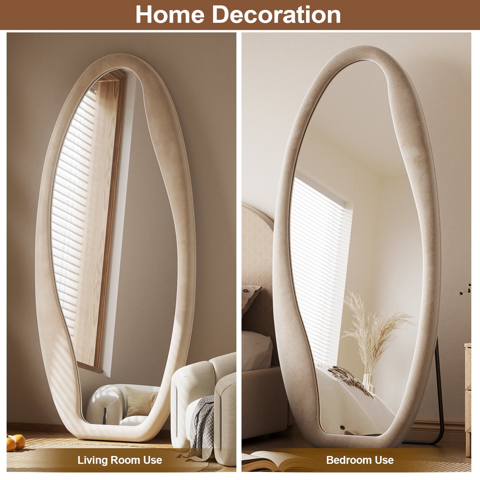 Flannel Frame: Wrapped in plush, thick velvet fabric, the mirror’s flannel frame ensures a soft touch and minimizes collision risks, making it a stylish and safe choice for modern interiors. Timeless Design: The mirror’s distinctive cloud shape adds a unique, whimsical touch to any room. Its playful yet elegant design enhances your decor, making it a standout feature in your space. Full-Body View: Offering a comprehensive full-body reflection, this mirror boosts illumination and confidence while enhancing your room’s visual appeal, blending practicality with sophisticated design. HD Reflection: With its high-definition reflection, the Anyrose mirror precisely captures light, brightening your room and creating a warm, inviting atmosphere that elevates your interior decor.
