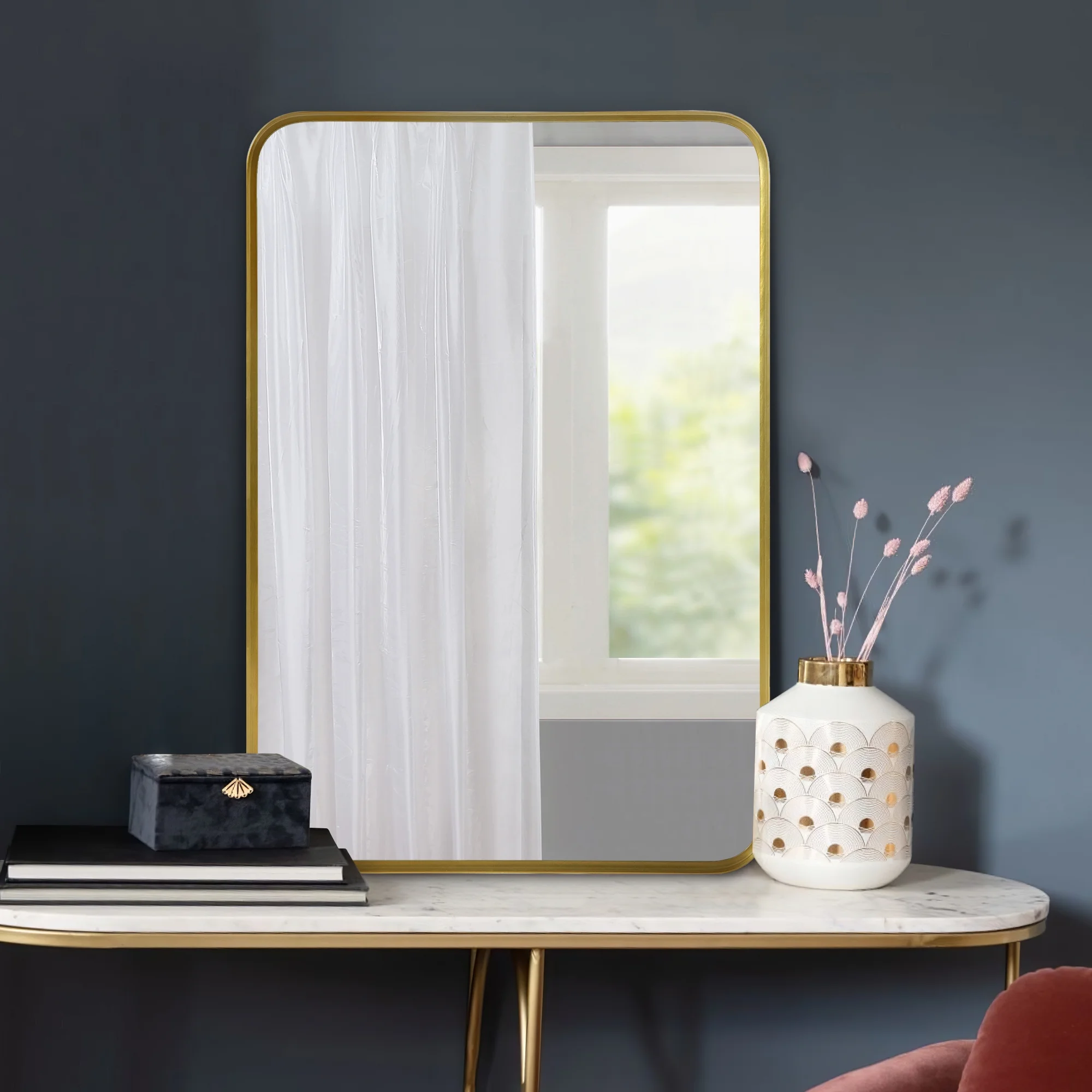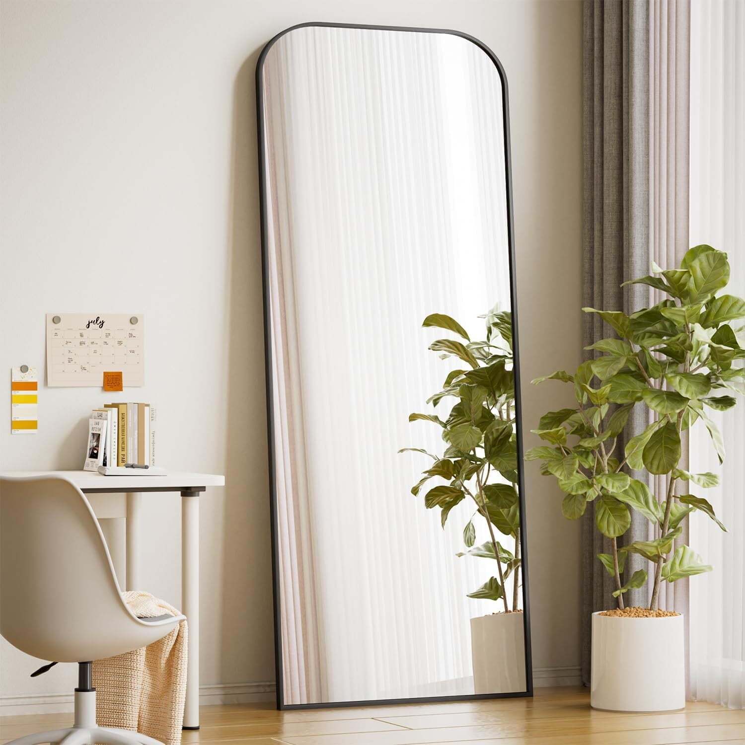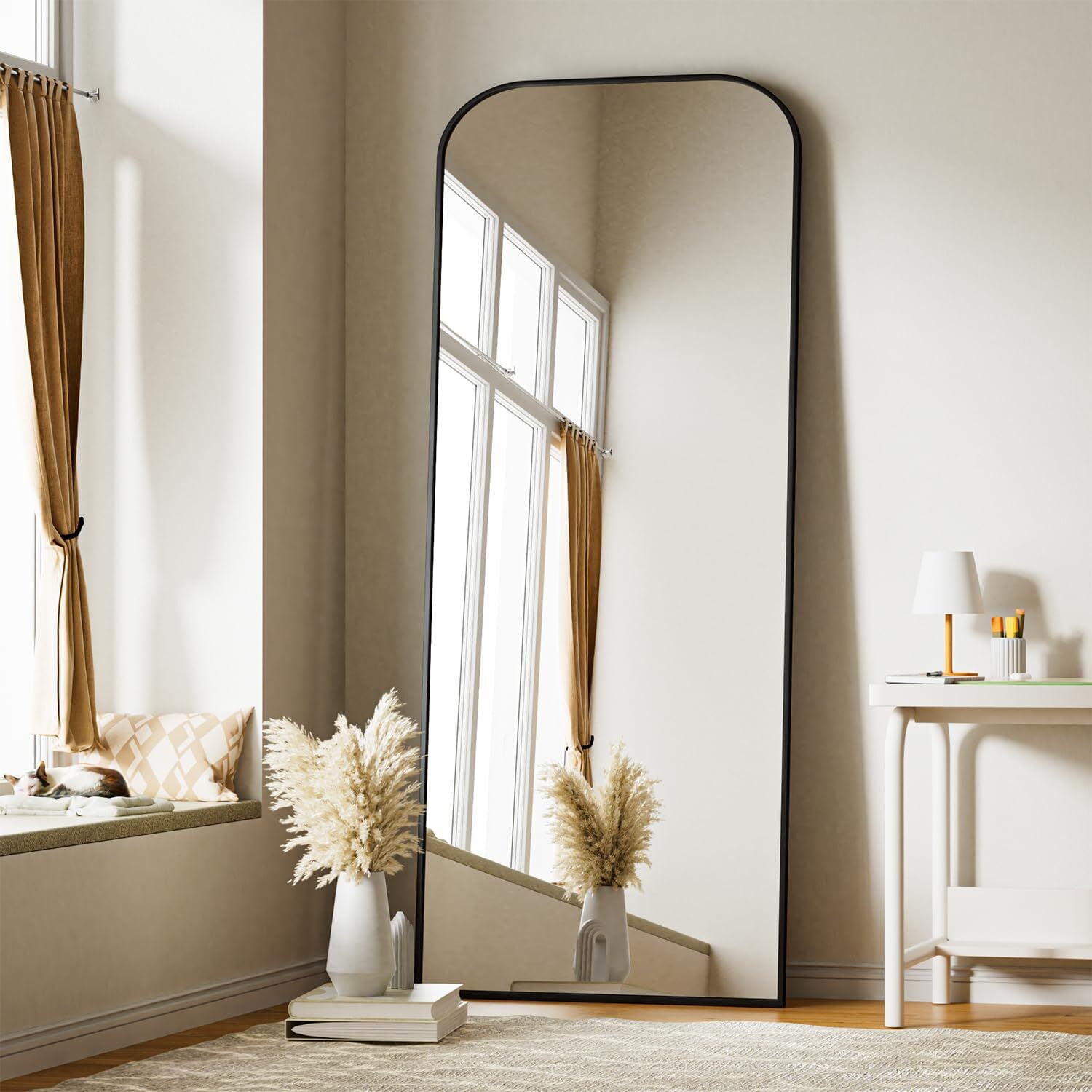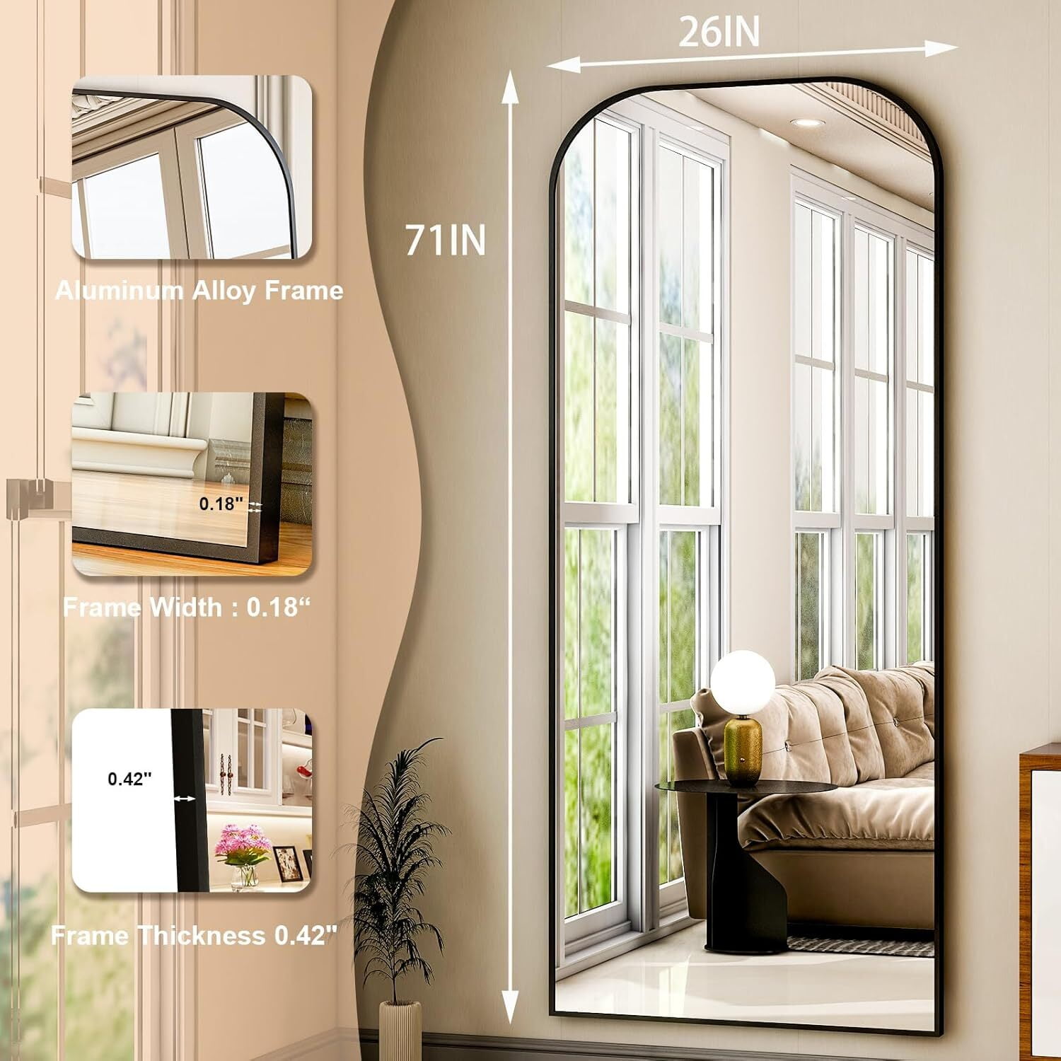 Rounded Top Mirror: Modern full-length design with a rounded top. Large size for full-body view. Available in black, gold, and silver. Aluminum Frame: Sleek aluminum alloy frame adds depth and style. Can be wall-mounted or used as a floor mirror. Tempered Glass: Durable and less prone to breaking compared to traditional mirrors. Unique Design: Eye-catching rounded top highlights mirror beauty, perfect as a wall or freestanding mirror. Versatile Use: Use as a standing, wall-mounted, or leaning mirror. Ideal for bedrooms, living rooms, closets, and hallways.