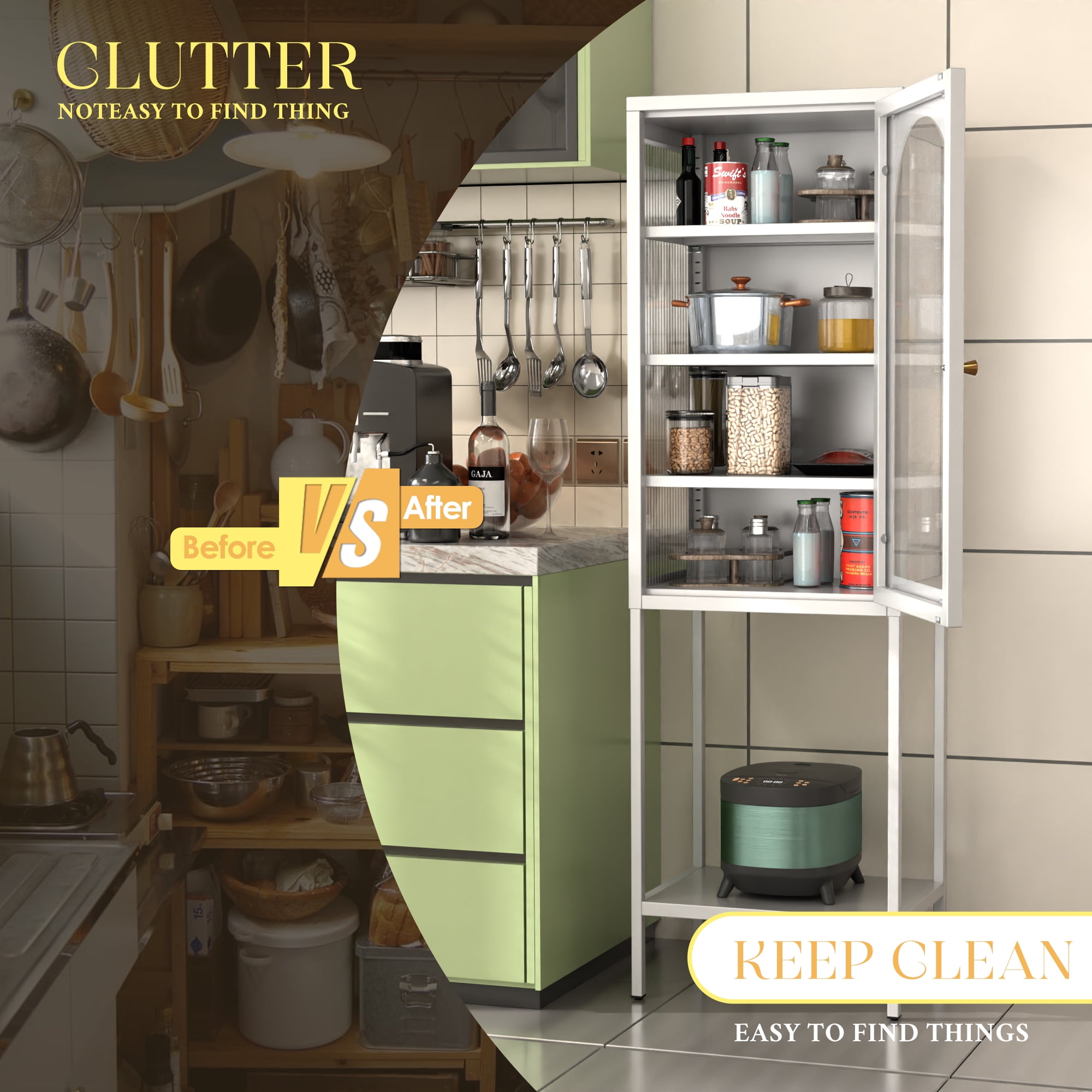[FLUTED GLASS DOOR] Glass door with exquisite handles provide you easy access to your daily items. Wavy acrylic door panels brings elegance to your interior design, allowing you to display exquisite decorations and keep them dust-free.The magnetic suction door design makes the sound of opening and closing the door smaller. [HIGH QUANITY MATERIALS] The storage cabinet made of premium cold-rolled steel,transparent wavy acrylic door panelsand glass for sturdiness and easy cleaning, it is dust-proof, waterproof, wear-resistant and durable. [THOUGHTFUL DESIGN] The built-in 3 adjustable shelves fit items of shapes and sizes,offering ample storage space to store and display your books, magazines, DVDs, vases and other decorative items well organized and within reach. Elevated design effectively prevents moisture and ensures convenient cleaning. [VERSATILE USE] The timeless and elegant appearance blends well in a variety of home setups. Proper dimensions (160*50*35cm/ 63* 19.7*13.8in) fit dining room, kitchen, living room, etc. Use it as a kitchen cupboard or display cabinet in the living room. [SIMPLE ASSEMBLY] This storage cabinet comes with a detailed instruction and all necessary components are properly labeled, which make the assembly much easier. If you have any questions, please contact us in time, we will give you a satisfactory answer.