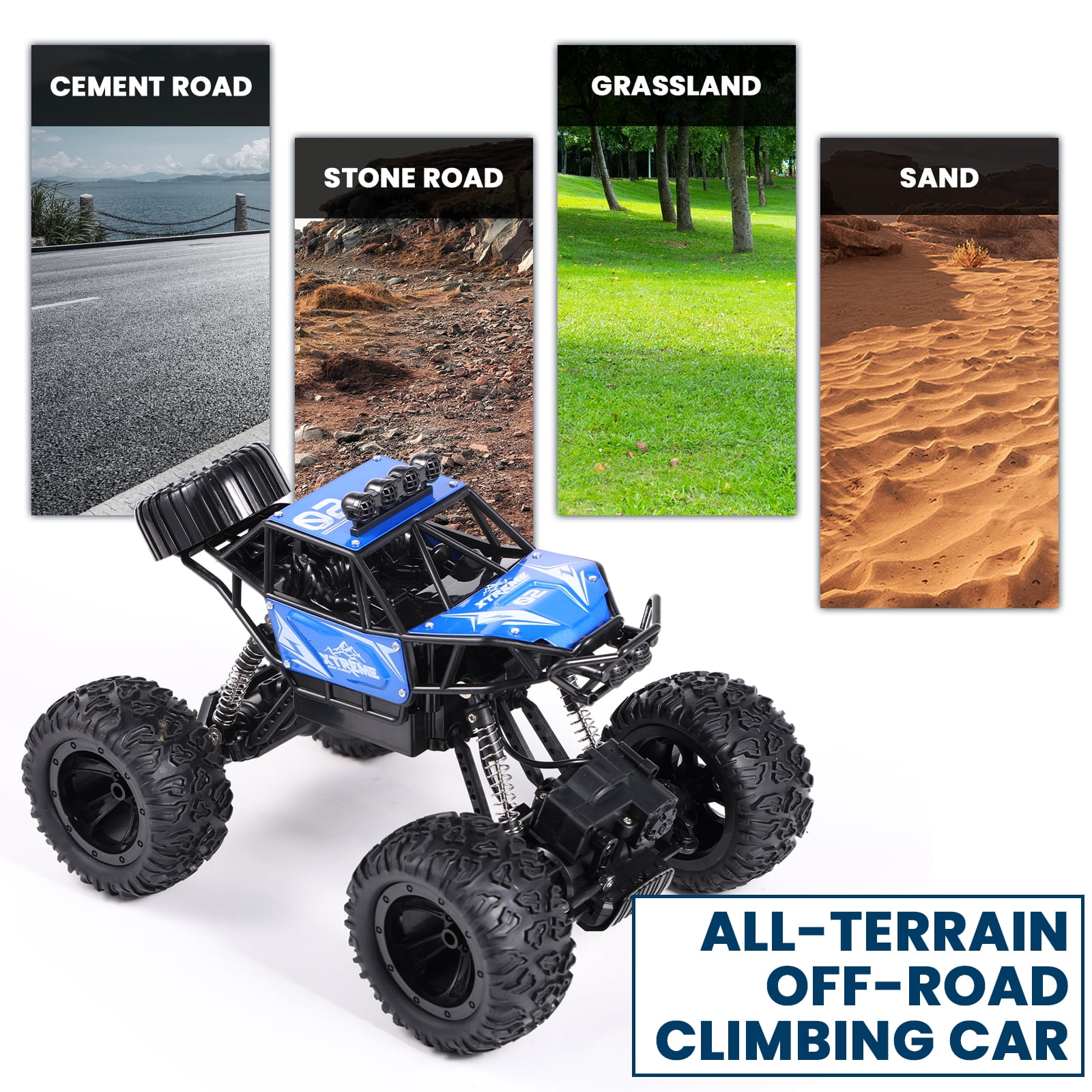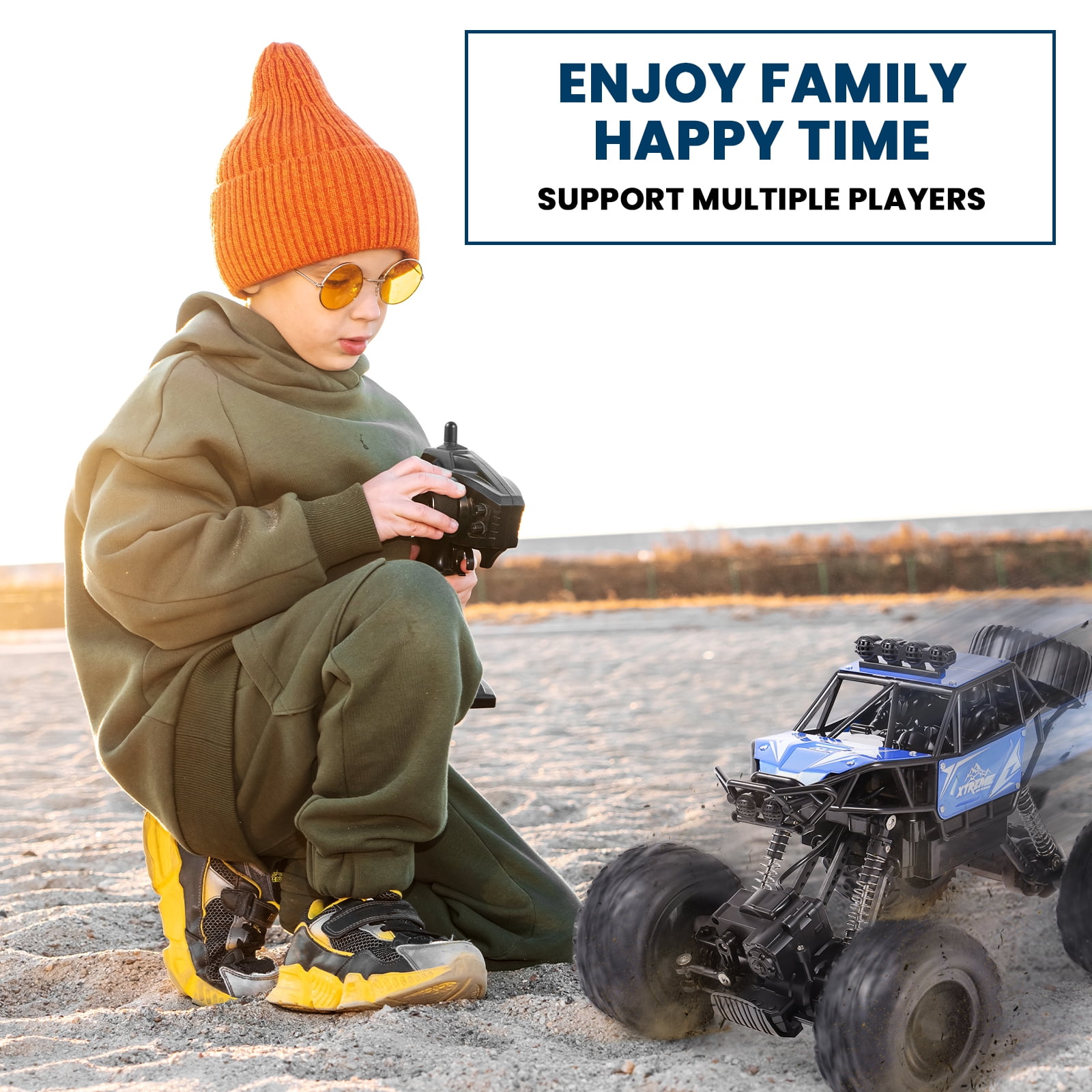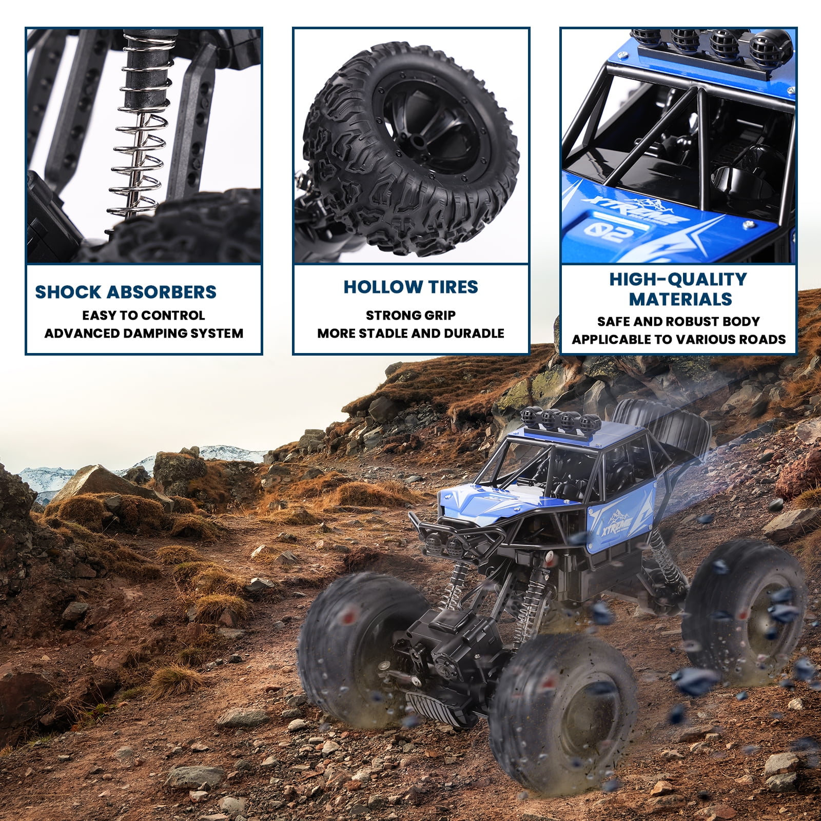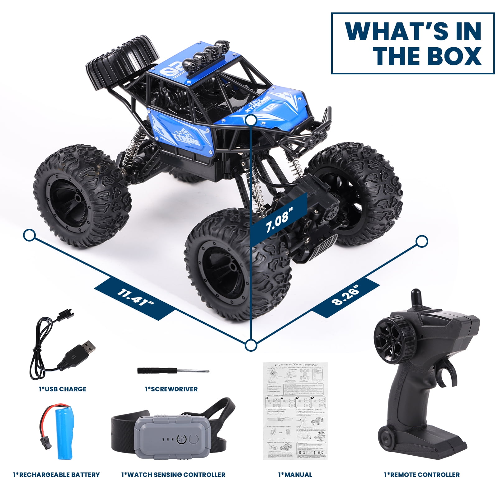 【Two Control Modes】One is to hold the watch in your hand and control the stunt car by changing gestures, the other is to use the remote control to let the car go as you wish. 【Metal Shell & Realistic LED lights】Our RC rock crawler is equipped with a metal shell for good performance or durability. The roof LED lights will make it easier to see obstacles in your path. 【4WD Power and Superior Quality】This four-wheel-drive remote control racing car is connected by shock-proof springs, which is very stable, can effectively protect the body and frame, and has a better driving process in different terrains. 【 90 Min+ Play Time for Remote Control Car】You can enjoy the fun of driving for about 90+ mins at a time with rechargeable batteries. Just install batteries and get crawling! 【Dual Motors Remote Control Truck】Dual motors pump out incredible power to get you through the toughest conditions. 【2.4GHz Radio System of All Terrain Truck】With anti-jamming capability allows to race at the same time in the same track. 100 meter control distance, racing freely. 【Anti-slip & Anti-crash Off Road Cars】The front of the body has an anti-collision car bumper to effectively protect the body and frame that allow you to drive the car on all terrains. 【RC Car Toy Gifts】Get ready to dominate the off-road realm and experience heart-pounding action like never before with the AOKESI Remote Control Monster Truck. A great gift for birthdays and many occasions for your kids, toddler, age 6-12 years old and up.