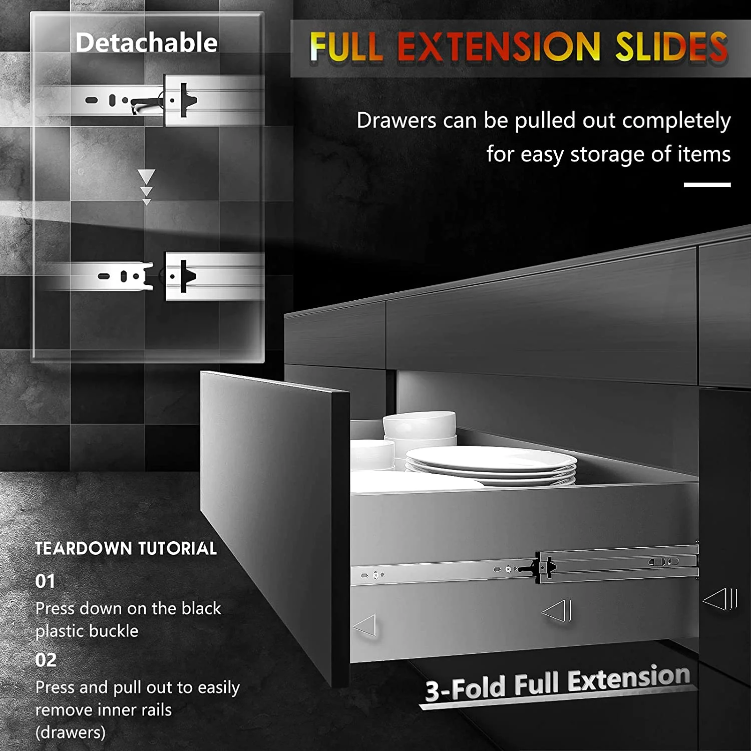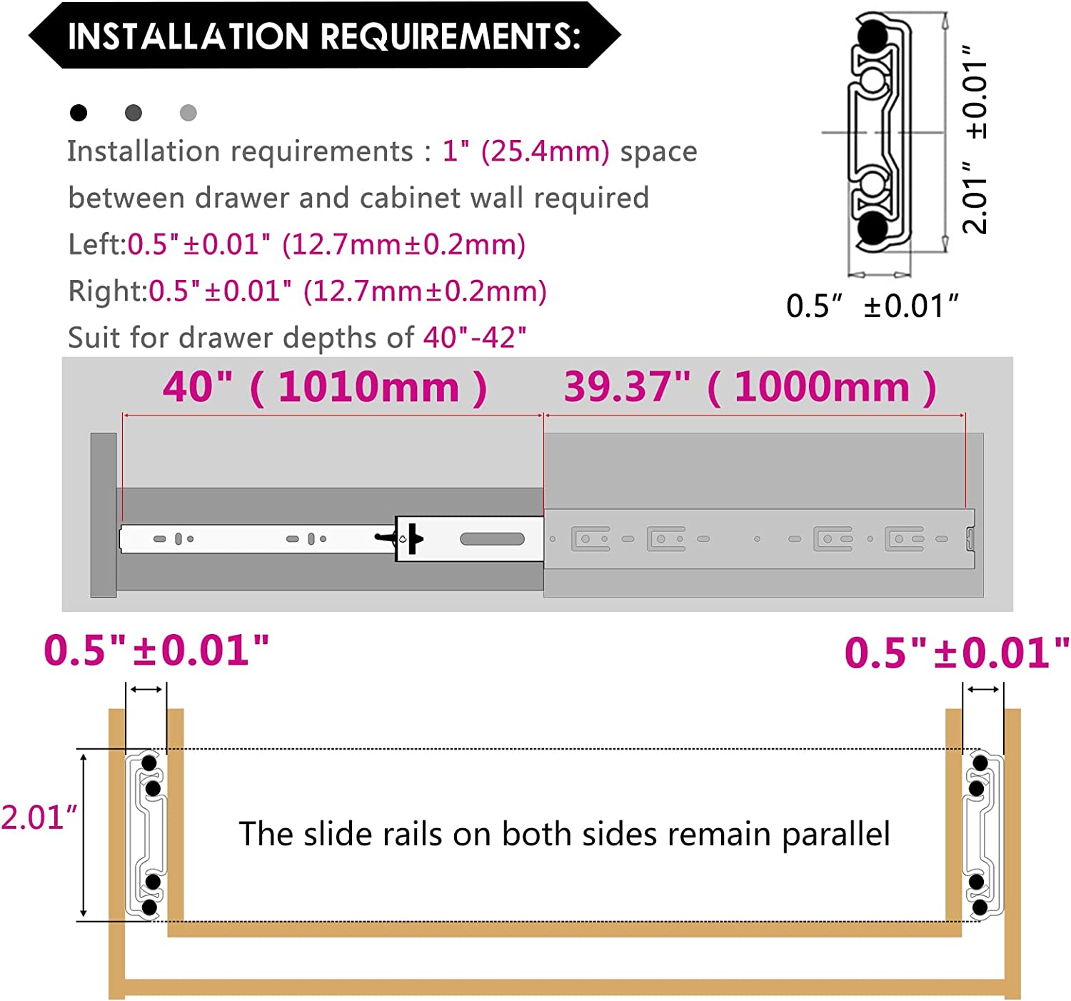 【Max load capacity 100lb, 30-year service life】 All three sections of rails are made of 1.5mm thick Q235 thick steel plate, high-strength, high-density high-quality cold-rolled steel. It can support heavy load storage without deformation, and the bottom is equipped with a limited rubber pad, which is made of ABS plastic, with good wear resistance and impact resistance. After testing, the number of opening and closing times has reached more than 150,000 times. 【Full Extension Slides, Double Anti-rust】Full extension heavy duty drawer slides support access to the whole space, and the drawers can be pulled out completely for easy storage of items. The surface of the slide rail is treated with galvanized blue sealing process, which isolates the slide rail from direct contact with air and water, and enhances oxidation resistance and corrosion resistance. 【Ball bearing drawer slides are removable】 Two sets of ball bearings are designed inside the slides, all of which are made of solid steel balls. In addition to maintaining the fluidity of the slides, they can also effectively increase the load-carrying capacity of the slides. Hidden detachable button on the back, press the detachable slide rail, easy to install and clean the drawer. 【Installation requirements】 Dimensions: 39.37″(1000mm), full extension length: 79.13″(2010mm), installation clearance: left: 0.50″ (13mm), right: 0.50″ (13mm). You can choose the size of the rails according to the depth of the drawer. The length of the rail should be less than or equal to the drawer. Please refer to the image above. 【Notes for slide rails】 1. Due to different usage scenarios, this product does not contain screws. You can buy M4 screws yourself. 2. When installing, please push the inner ball bearing to the top of the slide rail first, then connect it with the slide rail, and finally the installation is completed.