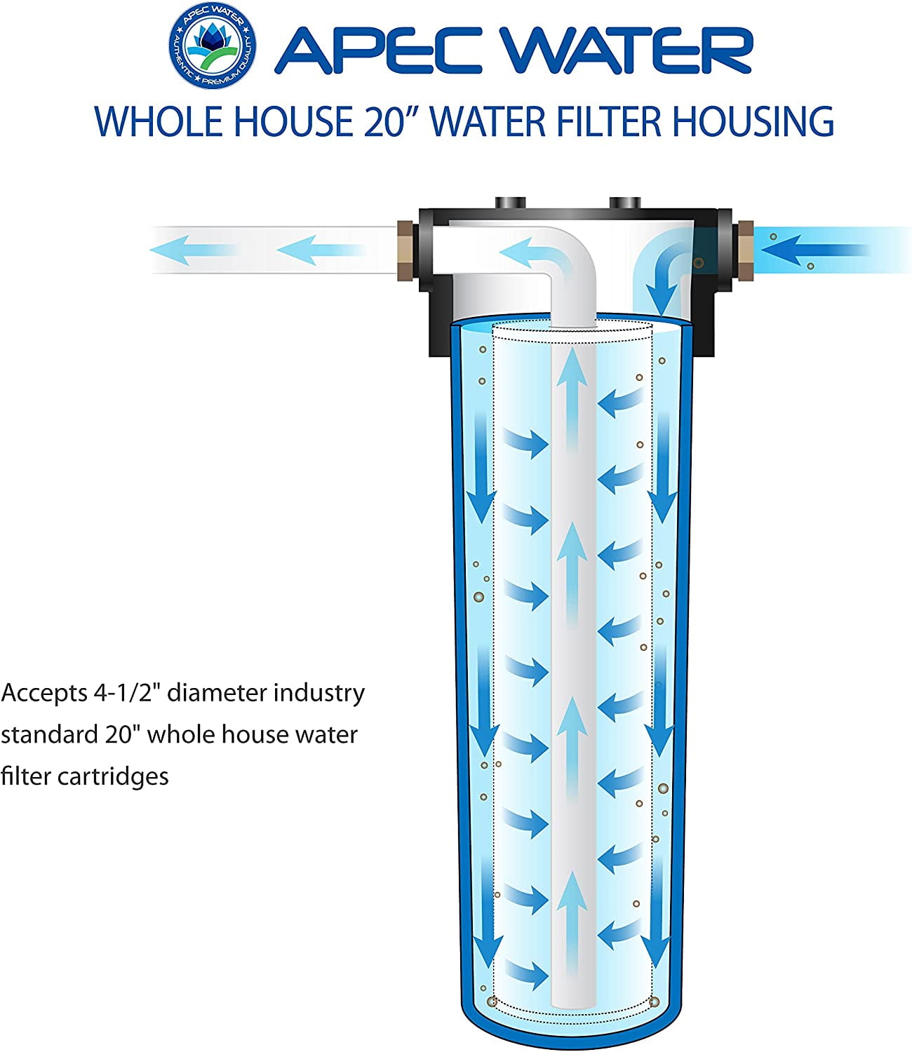 Durable, premium quality 20 in. whole house filter housing in blue color Large capacity housing for high flow applications Accepts 4-1/2 in. x 20 in. industry standard sized whole house cartridges 1 in. FPT inlet and outlet ports for fast flow Housing only, filter is sold separately