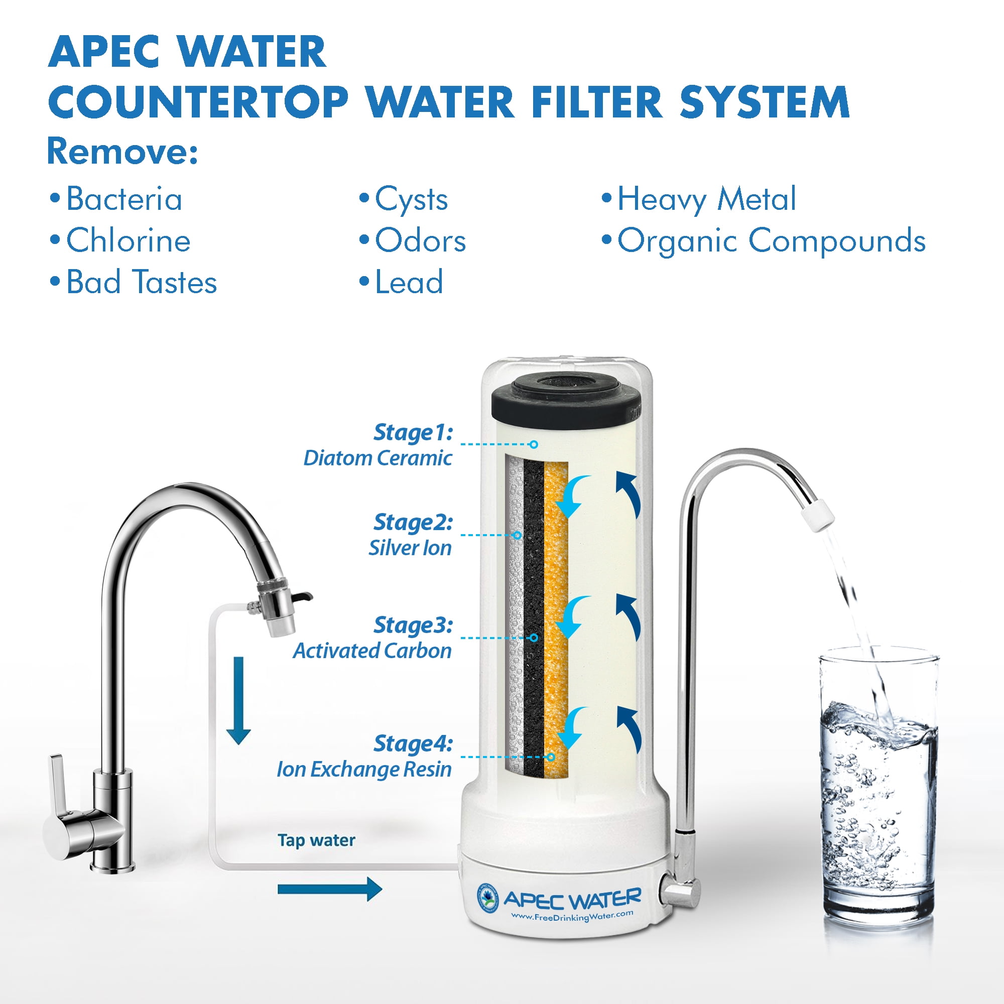 This free-standing ceramic countertop filter can be easily attached onto your existing faucet using a diverter valve. 4-in-1 ceramic filter combines with ceramic media, silver ion media, activated carbon block and ion exchange media. The ceramic media has anti-microbial properties to reduce particulate matter, bacteria, cysts and turbidity. The incorporation of silver locked within the ceramic structure gives enhanced bacteriostatic and self-sterilizing properties. Activated carbon block is highly efficient in removing chlorine, bad tastes and any odors. Ion exchange media works to reduce lead and other heavy metals. When these three media properties work together they are able to remove a wide range of contaminants. The filter produces high quality water that can be used to rinse fruits and vegetables, for beauty facial washes, oral hygiene, feeding pets and watering plants. It is designed for durability and portability. The compact size and superior performance makes it the perfect choice for apartments, boats, and travel. It filters up to 2000 gallons making it a better value when compared to regular faucet filters and pitcher filters.