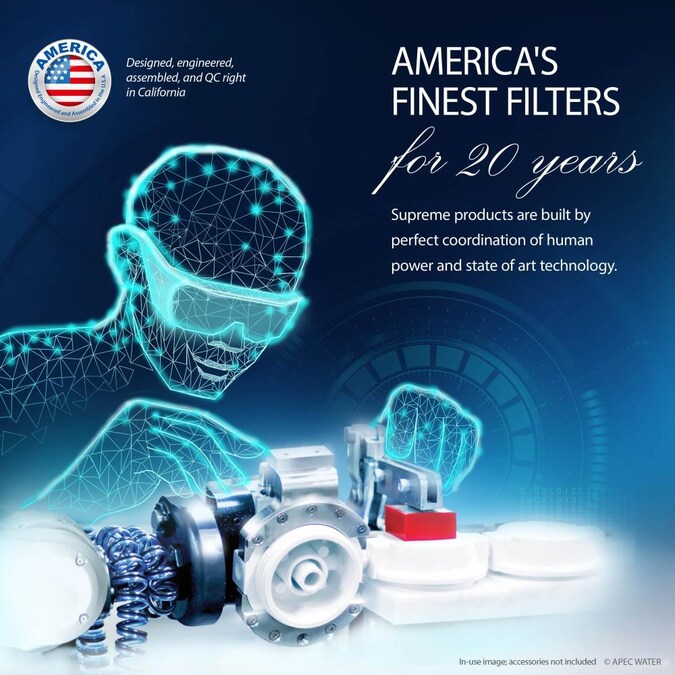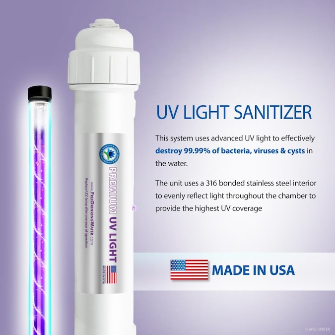 ROES-UV75 uses ultraviolet (UV) light to sterilize and kill up to 99.99% of bacteria and viruses and disinfects non-chlorinated water sources such as private wells. Equally effective on city tap water, it removes a wide range of other contaminants including chlorine, taste, odor, fluoride, arsenic, lead, chromium and more. Enjoy unlimited safe, clean, great tasting water right at home for drinking, cooking and making delicious coffee, tea and ice. Save money, time and hassle of buying costly, bottled water and live healthier with ultra-safe water that is contaminant free. Designed, engineered and assembled in USA, this Essence 6-stage water filter system is made from high caliber components to deliver exceptional contaminant rejection rates and long-lasting, reliable performance. Based in the U.S. with 2 decades of experience in RO design and production, APEC Water is committed in producing top performing systems that provide trouble-free, high quality drinking water for many years to come.