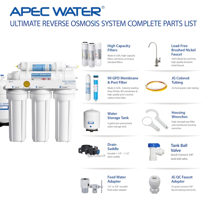 Enjoy fresh, great tasting water right at home that is perfect for drinking, cooking and making delicious coffee, tea and ice. The flagship model RO-Hi is WQA Gold Seal certified to remove up to 99% of harmful water contaminants such as chlorine, taste, odor, VOCs, as well as toxic fluoride, arsenic, lead, nitrates, heavy metals and more. Save money, time and hassle from buying costly bottled water and live healthier with safe, contaminant free drinking water. Built with super long-lasting 100% US Made filters, RO-Hi is the most durable system that lasts for decades. System is designed, engineered and assembled in USA to ensure water safety and your health. Rated at 90 GPD, DOW FILMTEC membrane provides fastest production rate for large family who demands the best. Based in the US with 2 decades of experience in RO design and production, APEC Water is committed in producing top performing systems that provide trouble-free, high quality drinking water for many years to come.