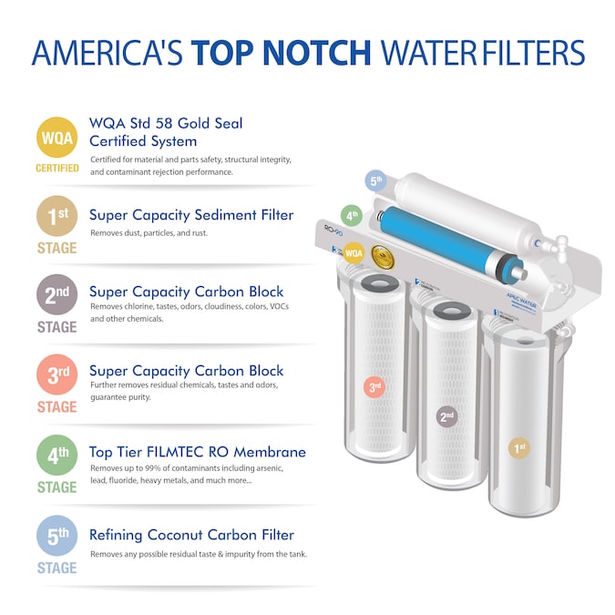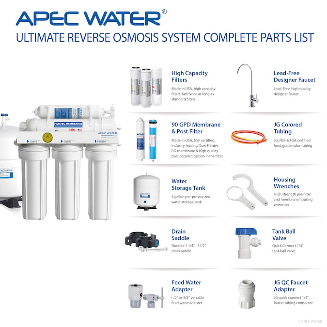 Enjoy fresh, great tasting water right at home that is perfect for drinking, cooking and making delicious coffee, tea and ice. RO-90 is WQA Gold Seal certified to remove up to 99% of harmful water contaminants such as chlorine, taste, odor, VOCs, as well as toxic fluoride, arsenic, lead, nitrates, heavy metals and much more. Save money, time and hassle from buying costly bottled water and live healthier with safe, contaminant free drinking water. Designed, engineered and assembled in USA, RO-90 is put through a rigorous quality control process to eliminate the slightest component imperfection, ensuring a smooth running system that is free from noises, leaks and clogs. Rated at 90 GPD, DOW FILMTEC membrane provides fastest production rate for large family who demands the best. Based in the US with 2 decades of experience in RO design and production, APEC Water is committed in producing top performing systems that provide trouble-free, high quality drinking water for many years to come.