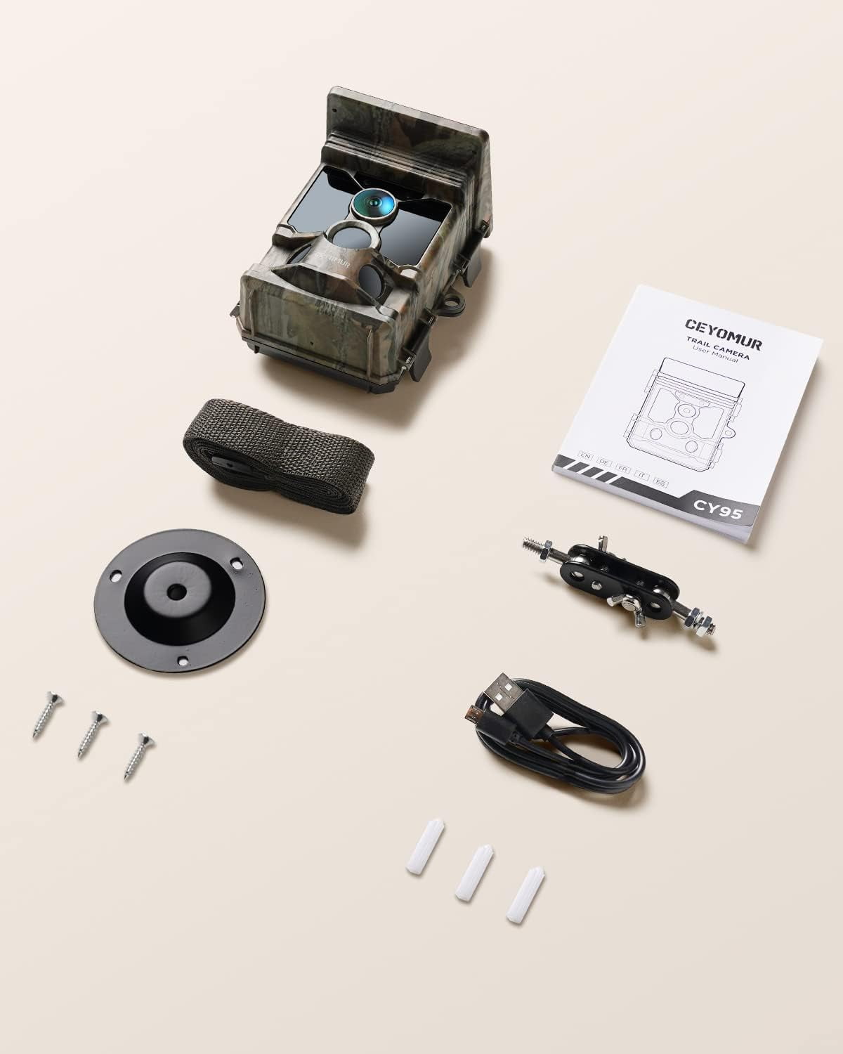 - What’s Included: 1 x Camera, 1 x tree strap, 1 x trail camera holder, 1 x USB cable